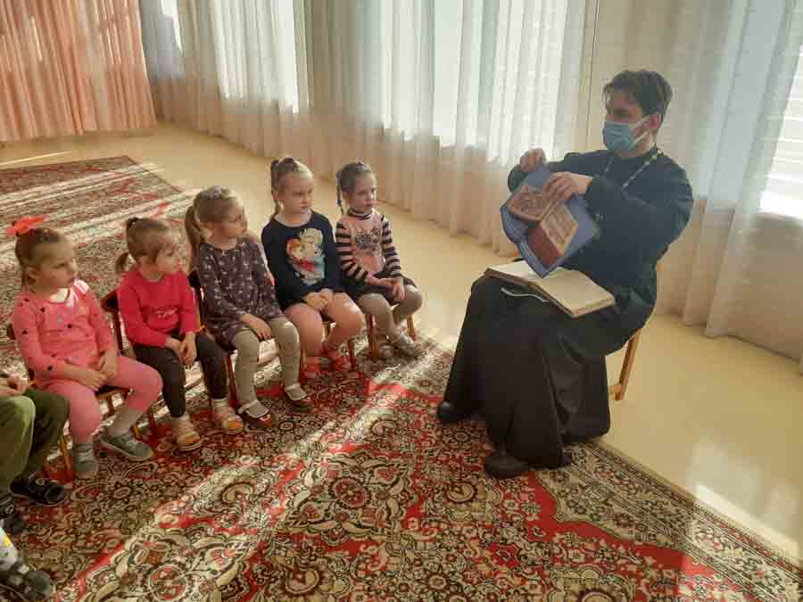 В рамках мероприятий, посвященных Дню православной книги и подготовки к Международному дню детской книги в ГУО «Ясли-сад №22 г.Гомеля» прошла встреча в литературной гостиной дошкольного учреждения, гостем которой стал клирик прихода храма Святой Живоначальной Троицы Николай Кадацкий.