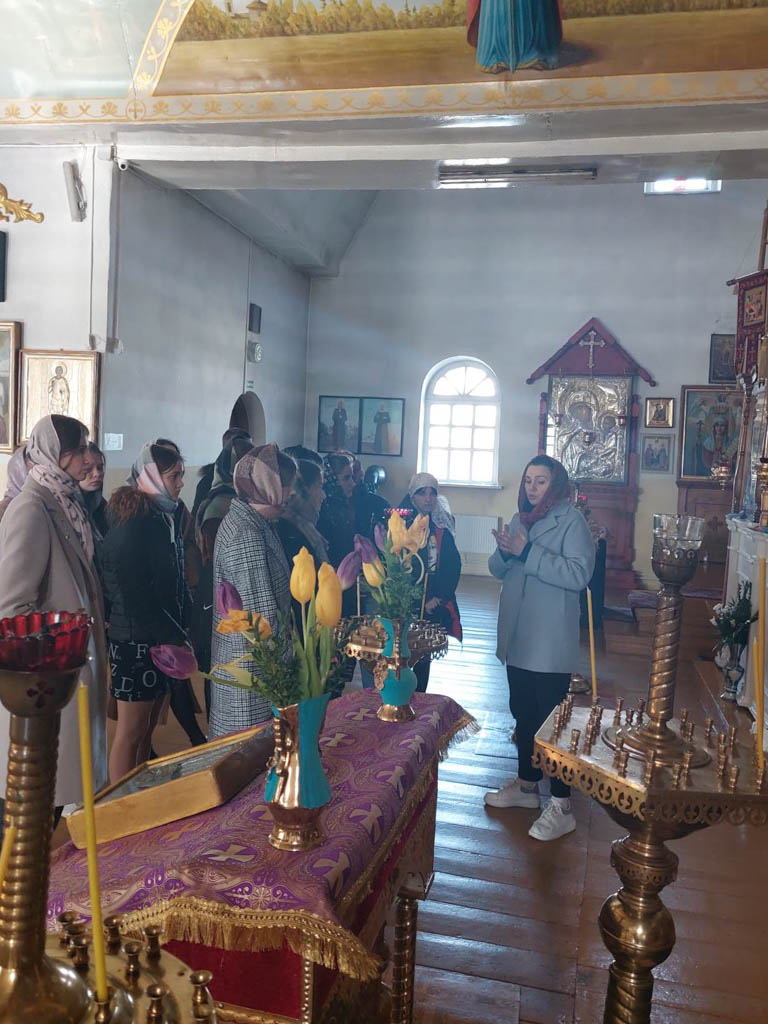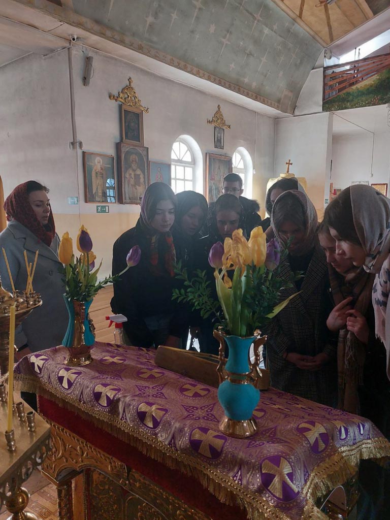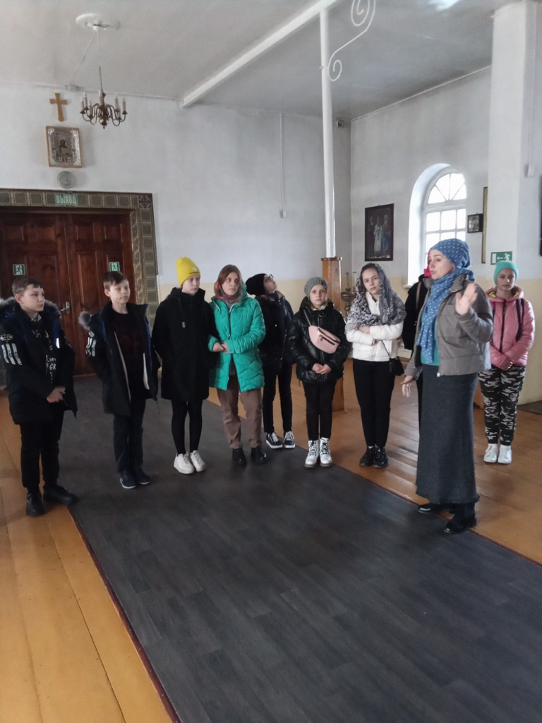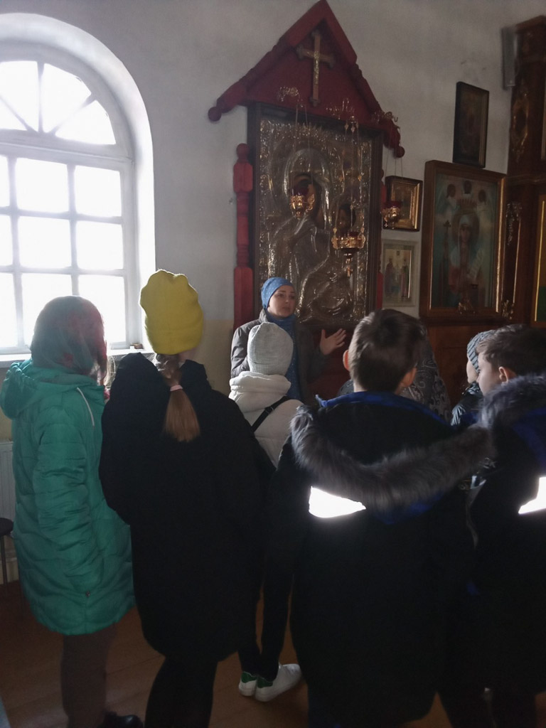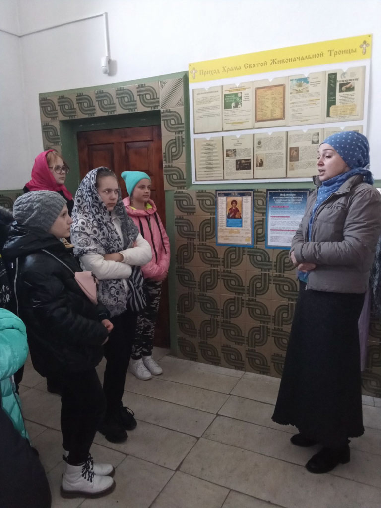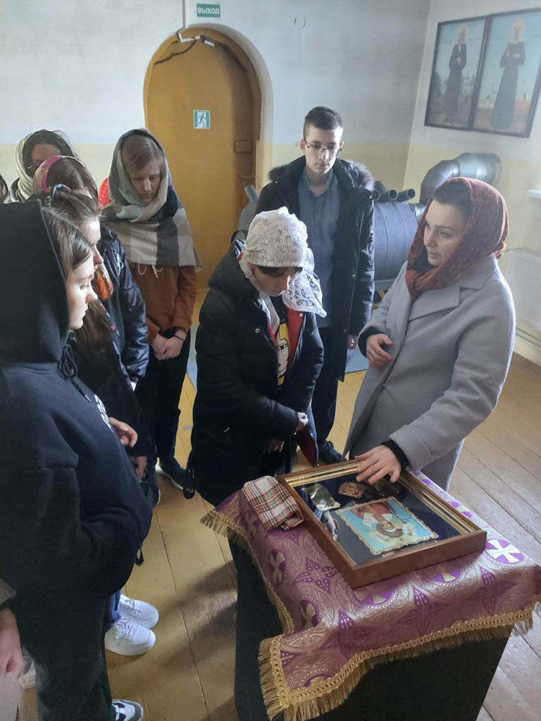 Далее маршрут экскурсий вел непосредственно в храм Святой Живоначальной Троицы, где Людмила Георгиевна рассказала ребятам об истории возникновения современной храмовой постройки, которой в этом году исполняется 30 лет. Ребята узнали о жизни покойного протоиерея Михаила (Мандрика), пастырскими трудами которого Православная жизнь на Лоевщине получила свое новое становление. Некоторые из участников экскурсии смогли впервые познакомиться с внутренним убранством православного храма. Людмила Георгиевна рассказала об истории появления в храме некоторых икон: Пресвятой Троицы, икон Божией Матери «Отрада и утешения», Киево-Братская, иконы св. вмч. Параскевы. Параллельно со знакомством с иконами, ребята слушали повествование о православных праздниках и традициях, свойственных Лоевской земле: Десятуха (день памяти явления иконы св. вмч. Параскевы), день памяти сщмч. Иоанна Пашина.