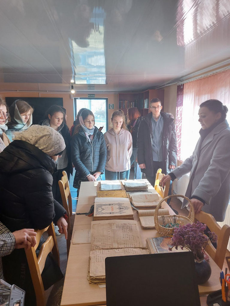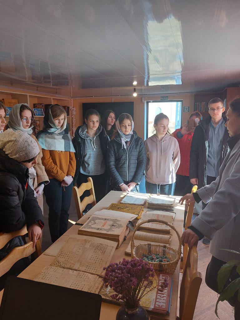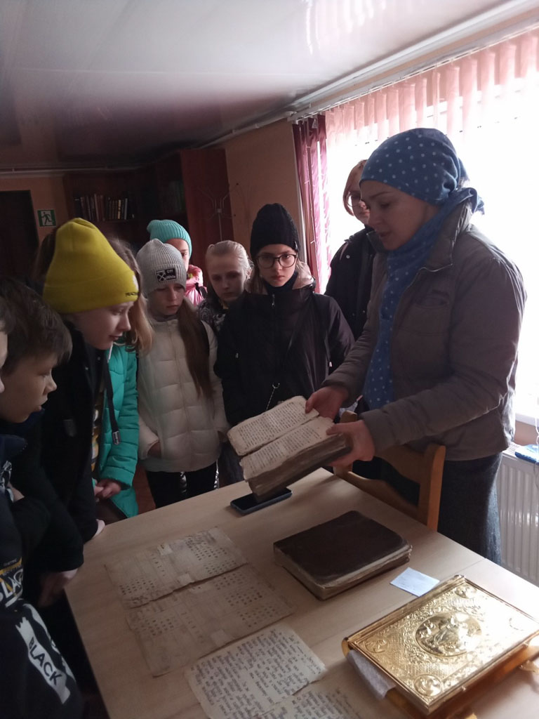 Следующим пунктом остановки стало здание приходской библиотеки. Интересным и познавательным для ребят был рассказ о священнослужителях местечка Лоев, начиная с 19 века и до наших дней: кто были эти люди, почему выбрали путь священничества, как сложились их судьбы. Листая старые фотографии, каждый из участников экскурсии мог самостоятельно поразмышлять над этим вопросом. Участники смогли ознакомиться с книжным фондом приходской библиотеки, узнать о деятельности Воскресной школы. Особый интерес вызвала богослужебная литература 19 века, сохранившая в себе рукописные пометки первых владельцев, а также рукописный православный календарь на полгода, составленный в конце 19 начале 20 веков. Некоторые из посетителей выставки решили попробовать себя в чтении на церковно-славянском языке, отметив его необычайную мелодичность и степенность.