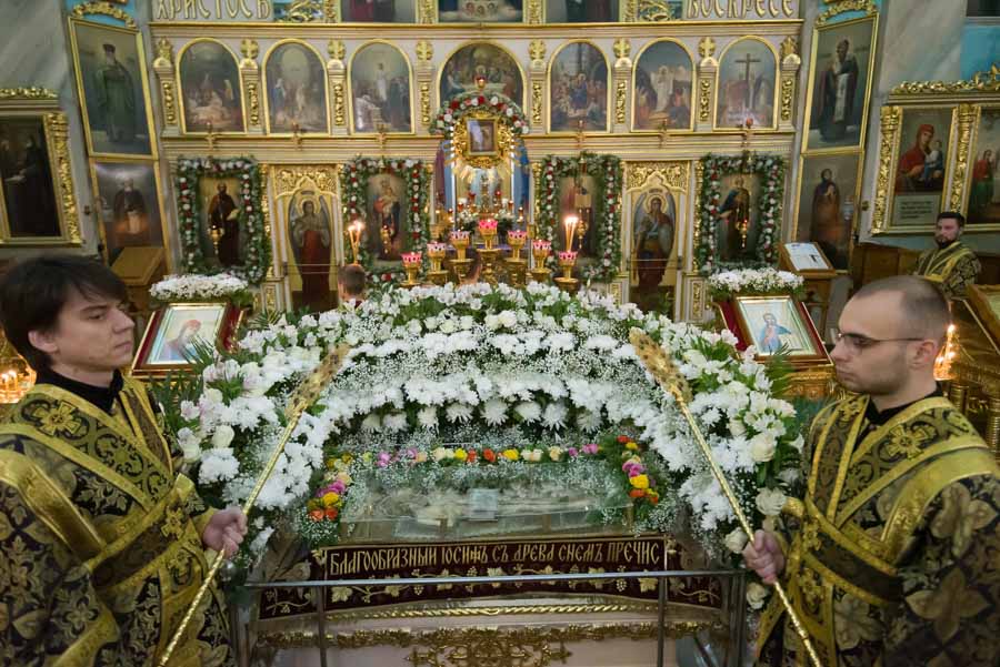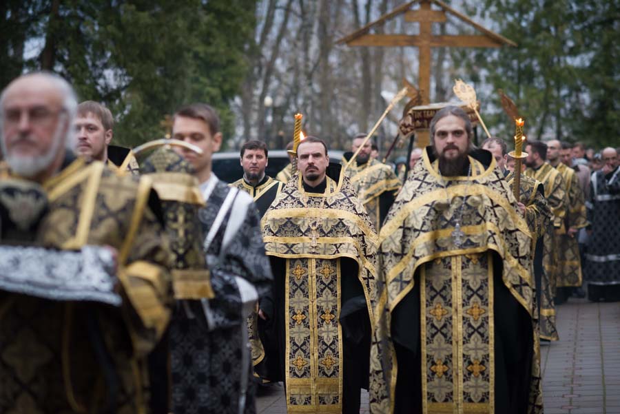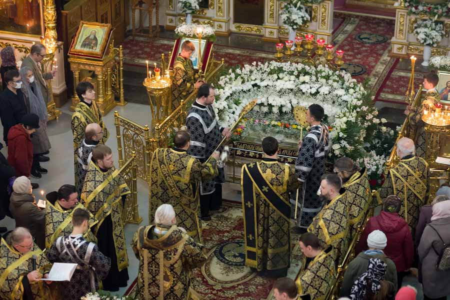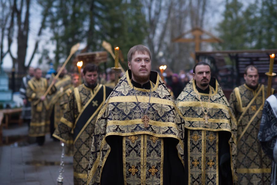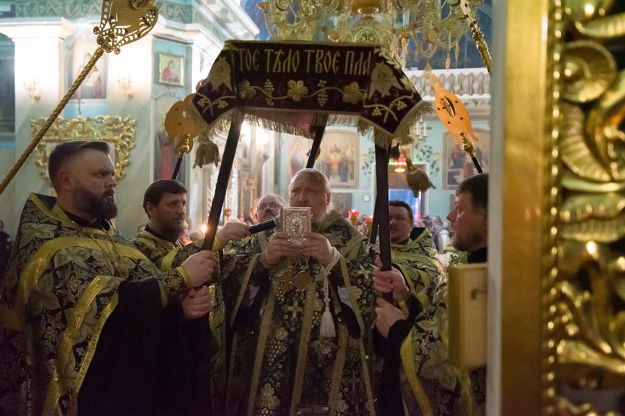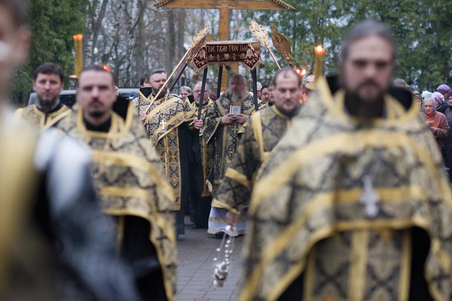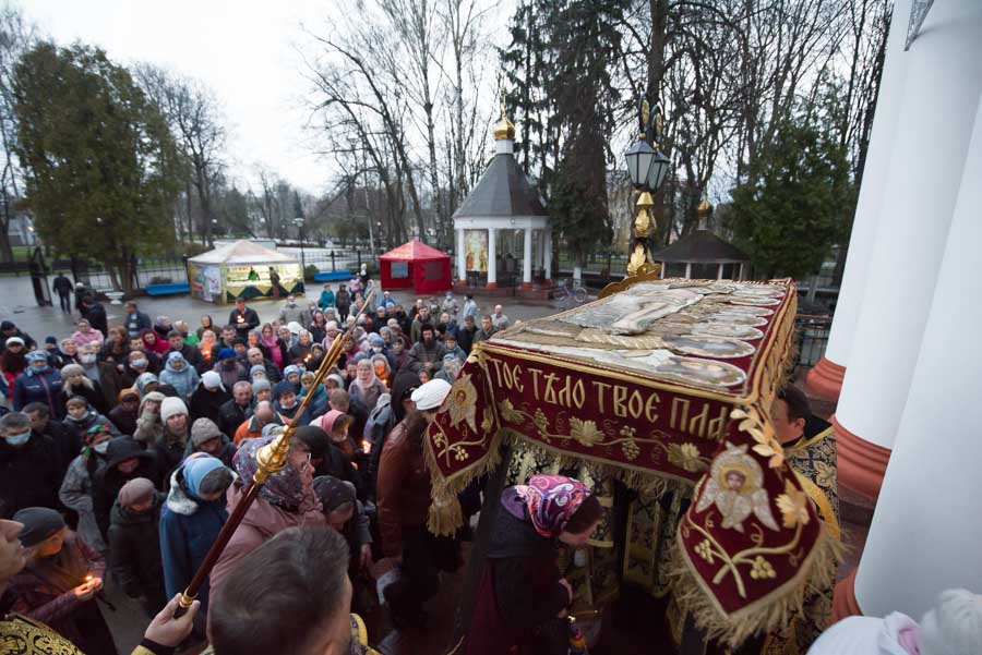 После великого славословия с пением погребального «Святый Боже…» был совершен крестный ход с Плащаницей, как напоминание о погребальном шествии праведных Иосифа с Никодимом от Голгофы к месту погребения Спасителя.