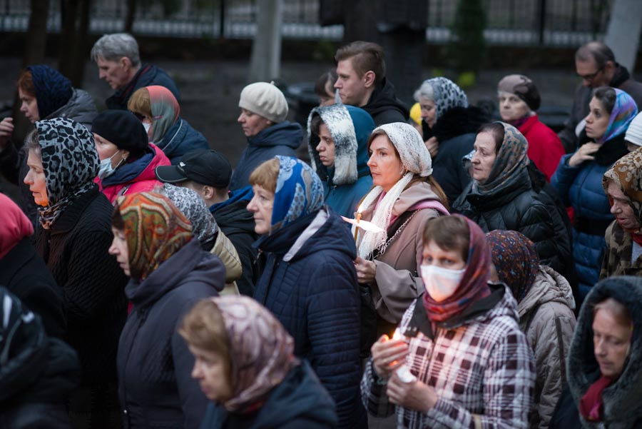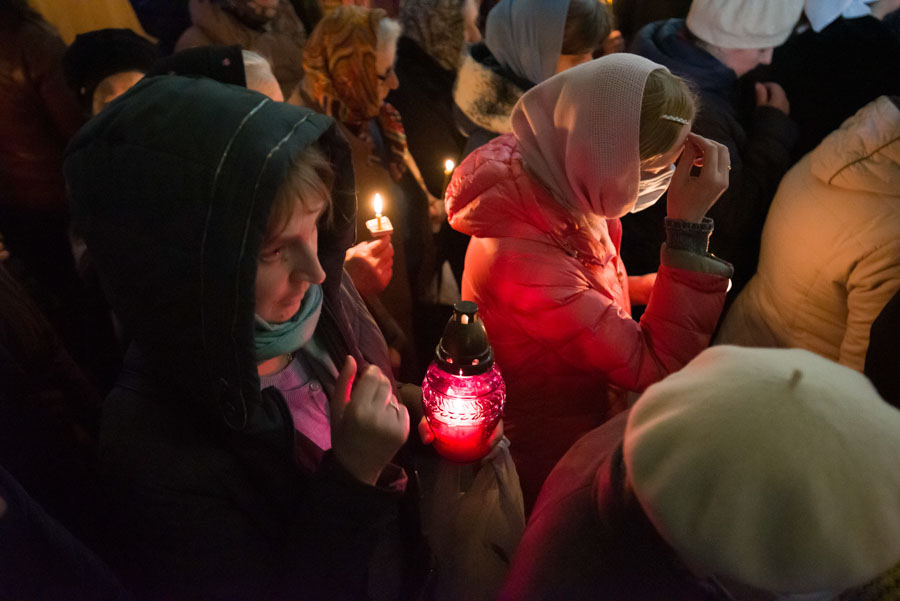 После мирной ектении, под пение тропарей Великой Субботы, архипастырь и сослужащие ему священнослужители вышли к Плащанице на середину храма, чтобы прочесть заупокойную семнадцатую кафизму и особенные припевы — похвалы.
