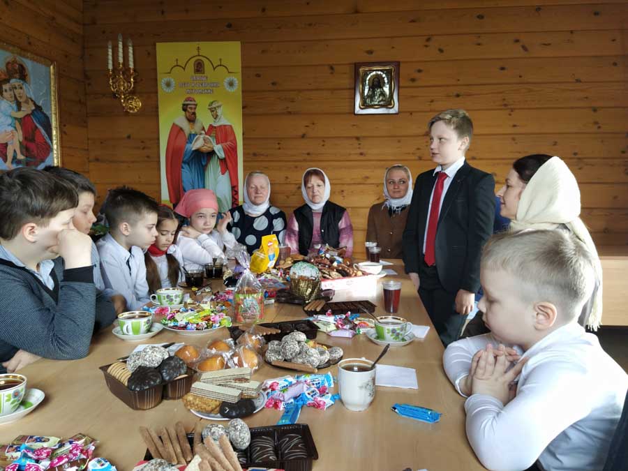 Воспитанники воскресной школы стихами и цветами поздравили с праздником своих мам, после чего состоялось праздничное чаепитие. За чаем с преподавателем Коваленко Еленой Ивановной родители обсудили все достижения ребят за прошедший учебный год и поставили задачи на будущий. Настоятель прихода протоиерей Леонид Михайловский пообщался с родителями и ребятами и благословил детей на летние на каникулы.