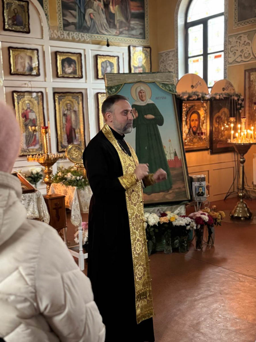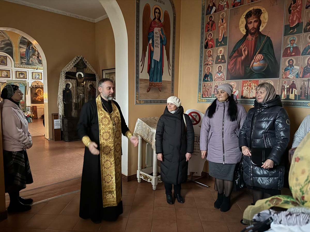 Гостей встретил клирик храма иерей Александр Савков. Священник рассказал об истории прихода, значении и устройстве храма. Особое внимание было уделено ковчегу с частицей мощей святой блаженной старицы Матроны Московской, который пребывает в храме. Иерей Александр рассказал о жизненном подвиге Матроны, ее любви и сострадании к людям, а также об особой помощи, которую она продолжает оказывать и сегодня. Каждый желающий мог поклониться святыне и обратиться к ней с молитвой.