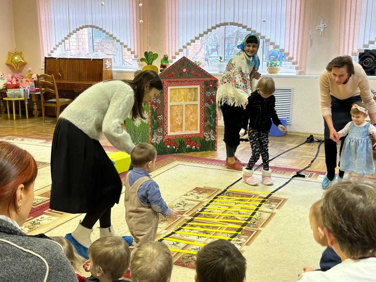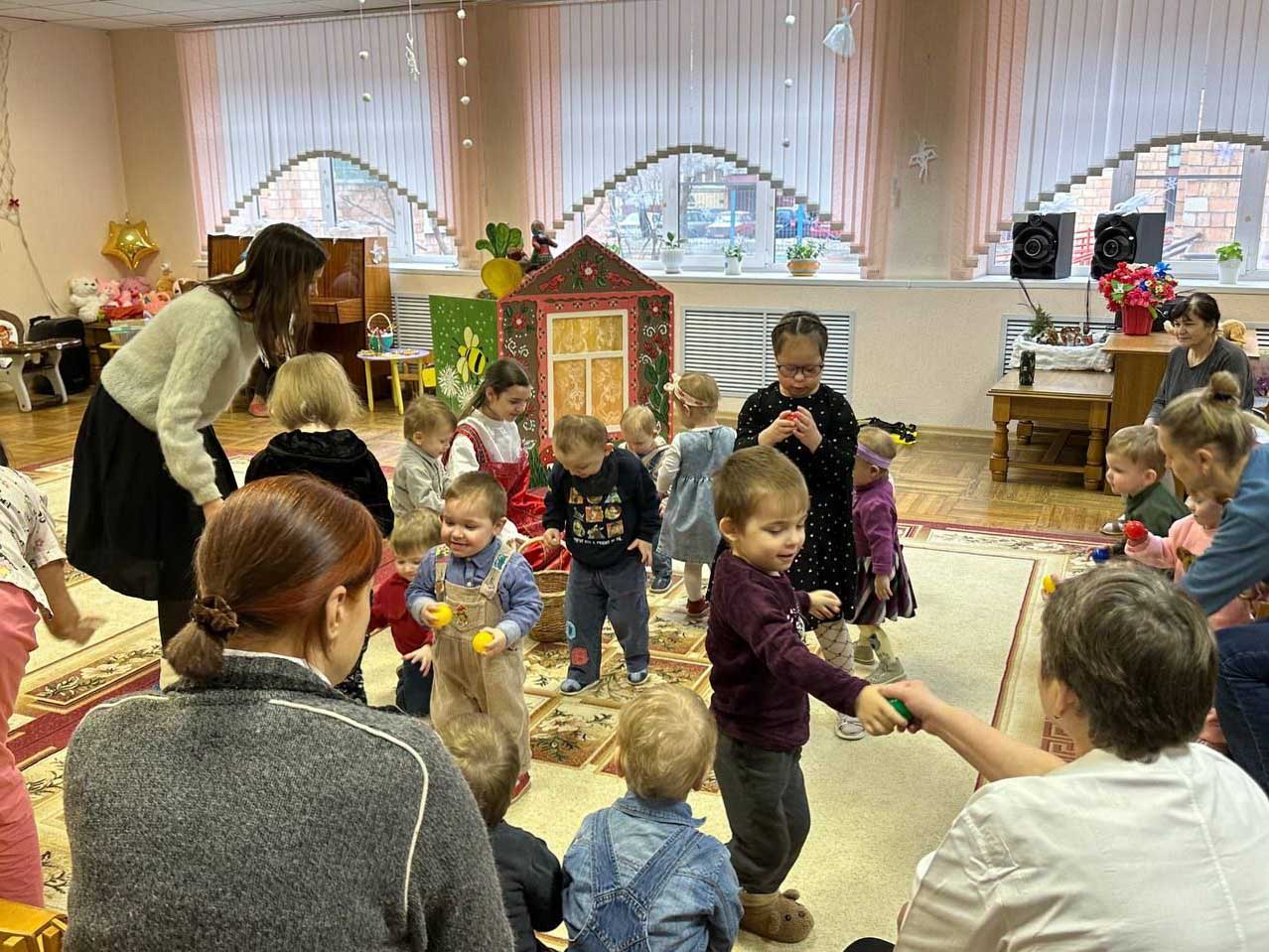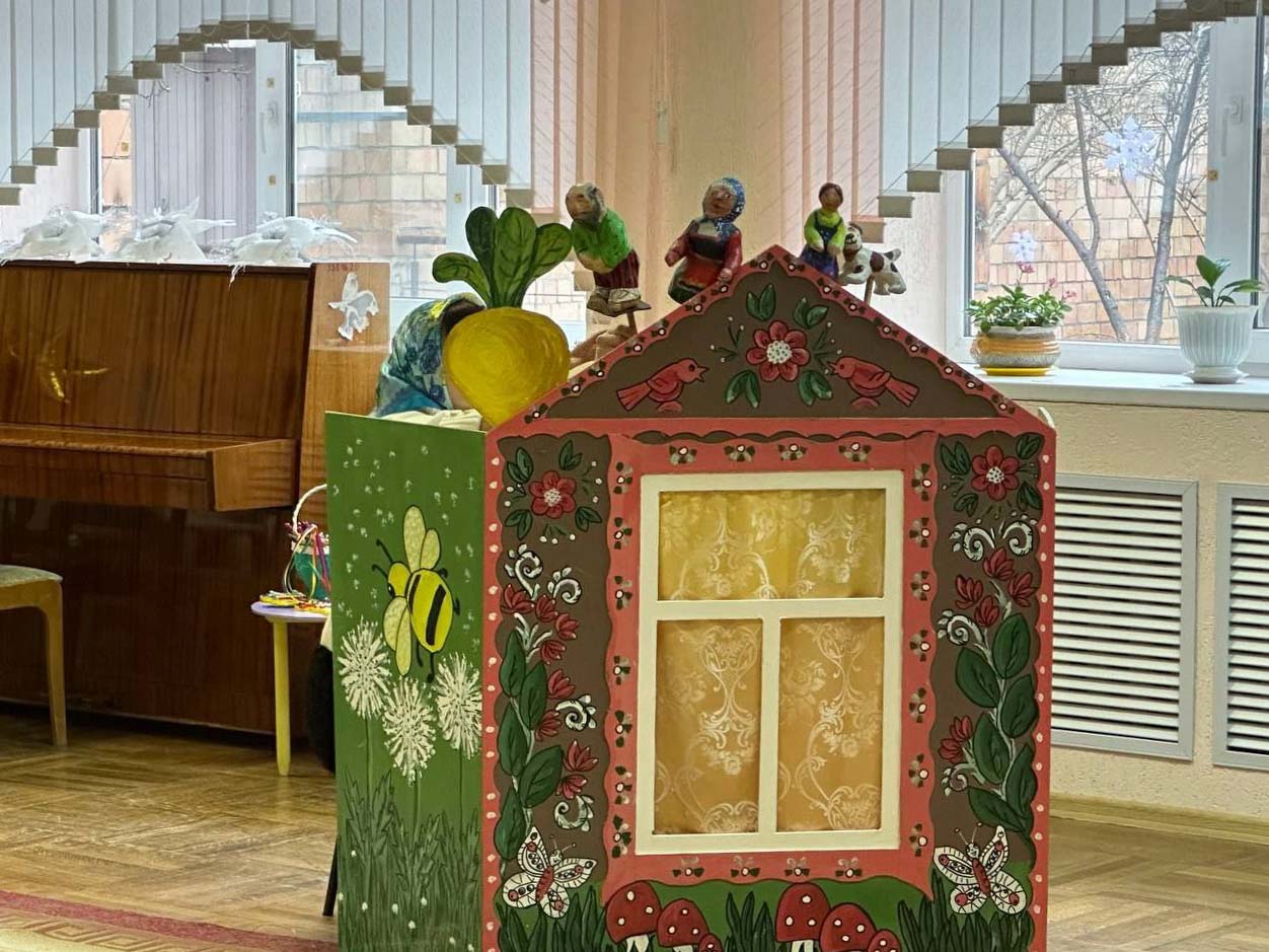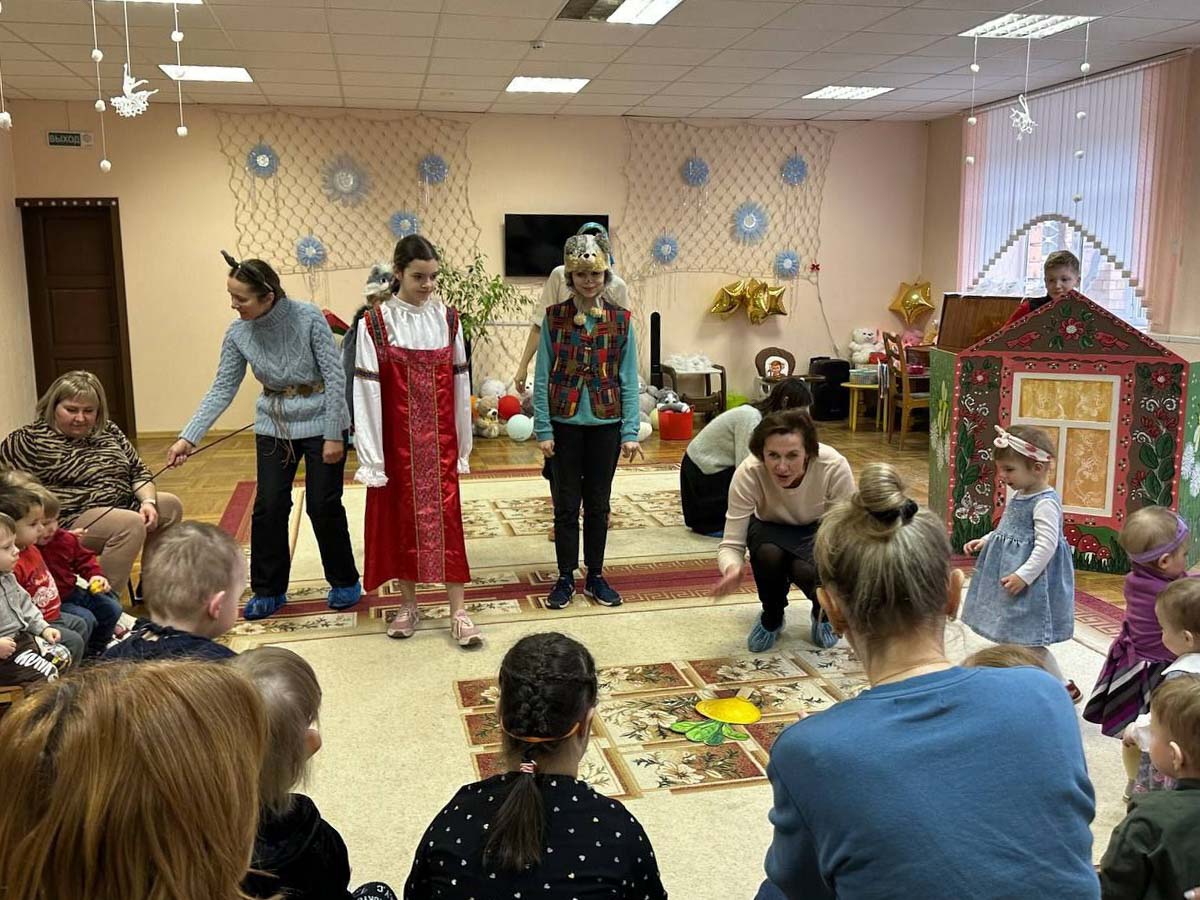 Затем юные волонтёры показали малышам представление батлеечного театра «Репка», используя кукол, выполненных из папье-маше. Спектакль вызвал у детей неподдельный интерес и множество улыбок, а финальный дружный и весёлый хоровод наполнил зал атмосферой радости.