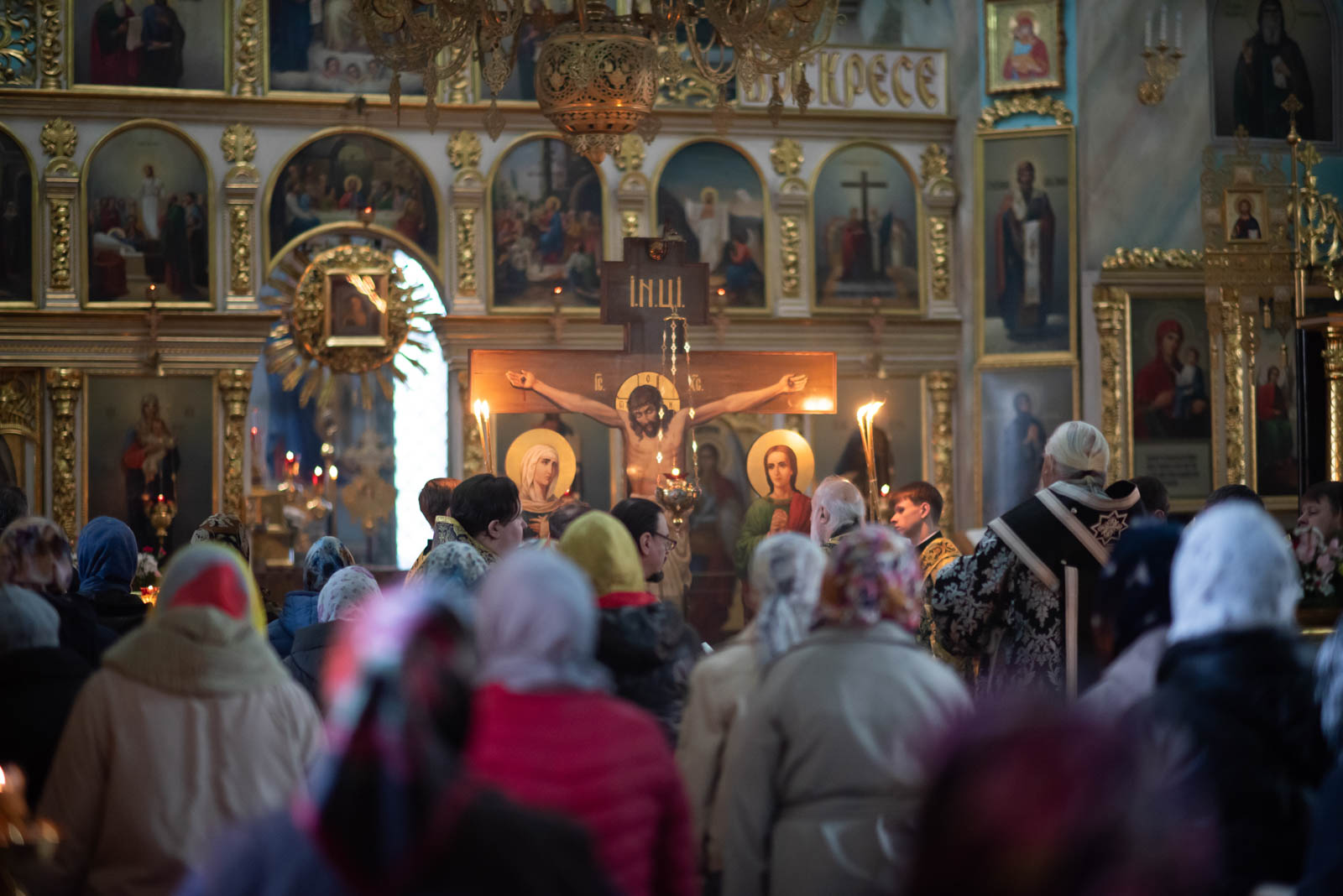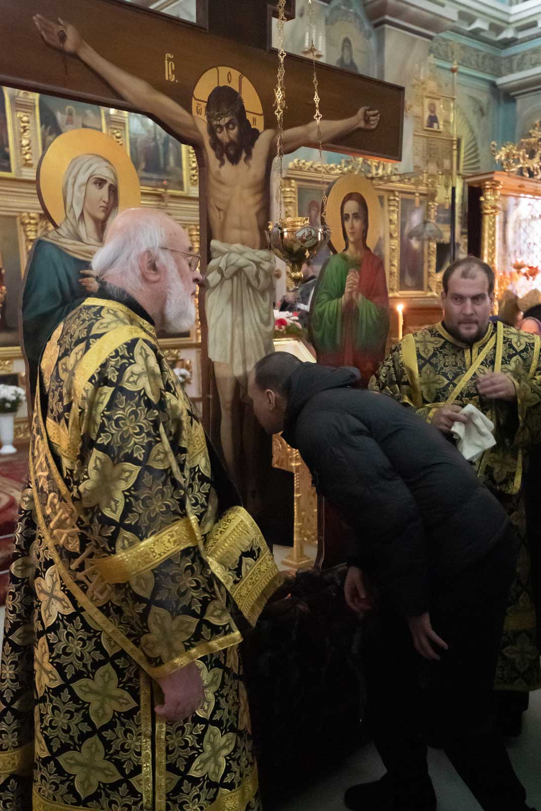 По завершению богослужения верующие с благоговением поклонились Распятию, вынесенному на середину храма.
