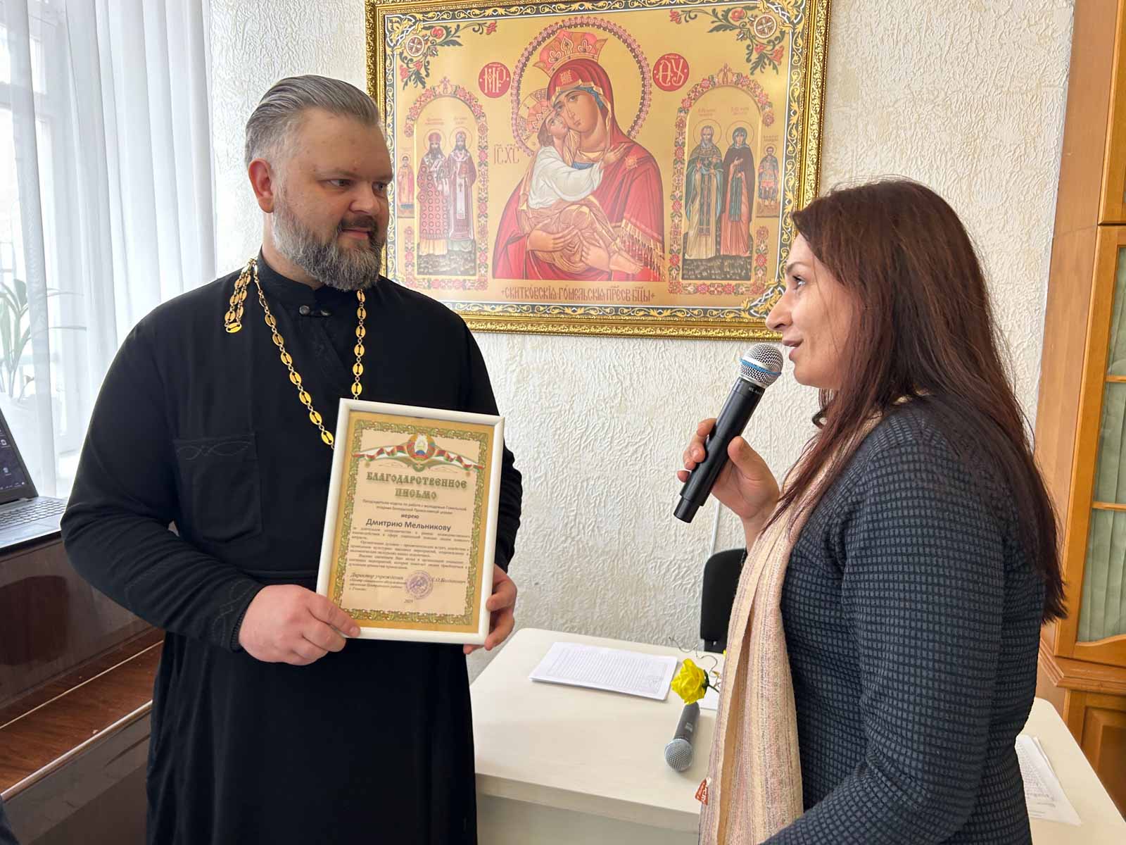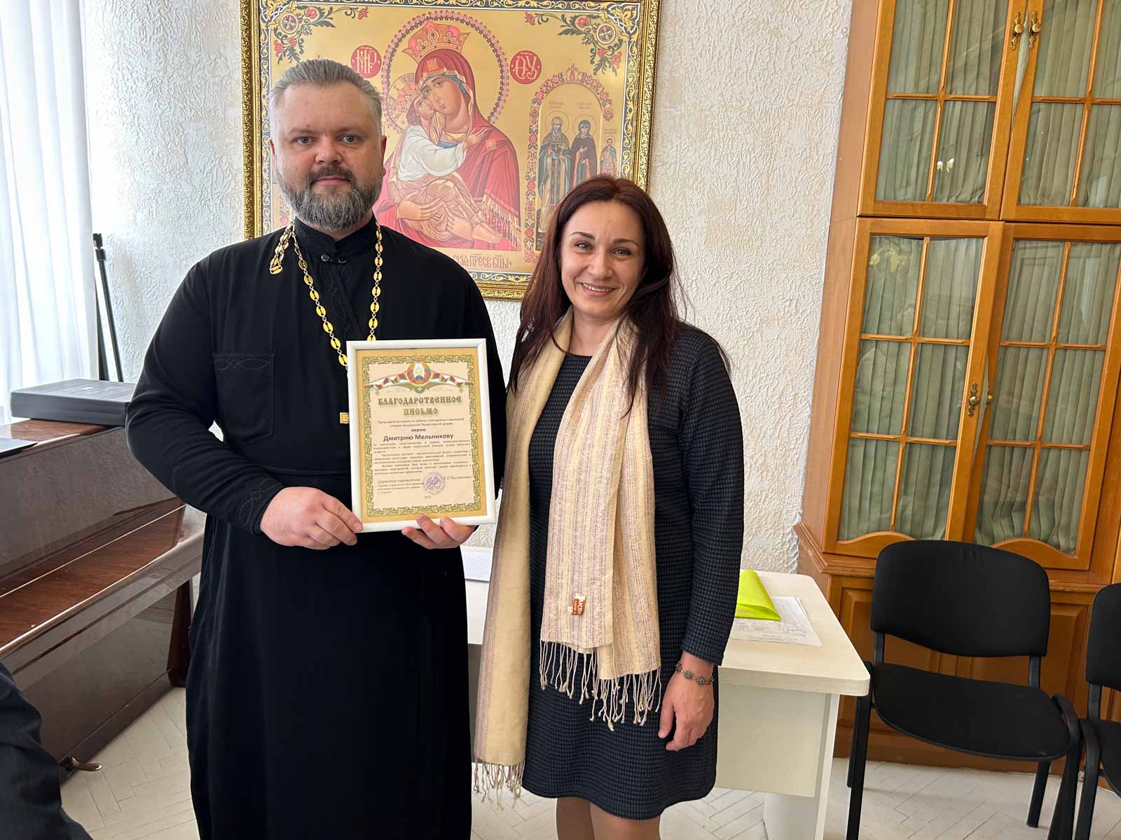С приветственным словом к участникам обратился председатель отдела по работе с молодёжью Гомельской епархии иерей Дмитрий Мельников. Директор ЦСОН вручила благодарность за многолетнее плодотворное сотрудничество с молодежным отделом епархии.