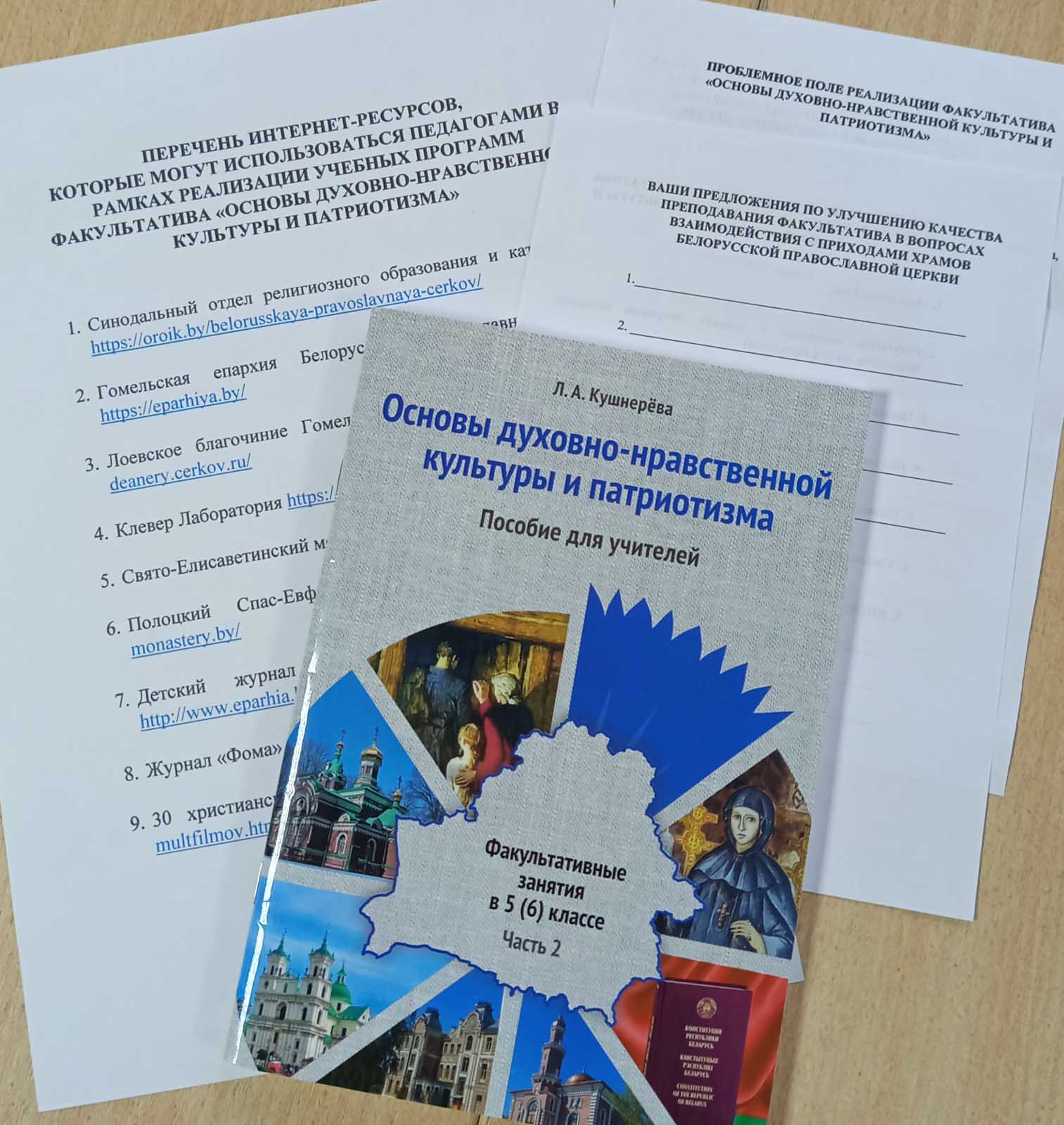 Следующим этапом стал пошаговый анализ деятельности в рамках факультатива, начиная с процесса информирования детей и родителей о тематике факультативных занятий, и заканчивая дополнительным материалом, который можно использовать на уроках. Людмила Георгиевна рассказала о существующих ресурсных центрах по духовно-нравственному воспитанию как в учреждениях образования Гомельской области, так и Беларуси в целом, а также подробно остановилась на интернет-ресурсах, которые могут стать незаменимыми помощниками для педагога: Синодальный ОРОиК Белорусской Православной Церкви, ОРОиК Гомельской епархии и разделы сайта Гомельской епархии, посвященные новомученикам, юбилею Гомельской епархии; педагогическая лаборатория «Клевер»; интернет-ресурсы Лоевского благочиния, журнал «Колыбель» Новогрудской епархии, интернет-журнал «Фома» и многие другие. Также были презентованы методические разработки воспитательных мероприятий и материалы духовно-просветительского проекта Лоевского благочиния «Через духовность к патриотизму», которые могут служить методической копилкой для педагогов факультатива; а также предметы церковного обихода и книги, которые, являясь предметами с вековой историей, используются при проведении культурологических экскурсий в Храме.