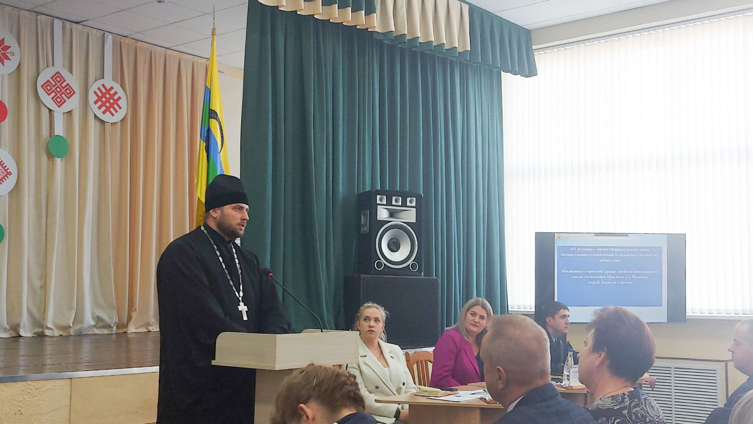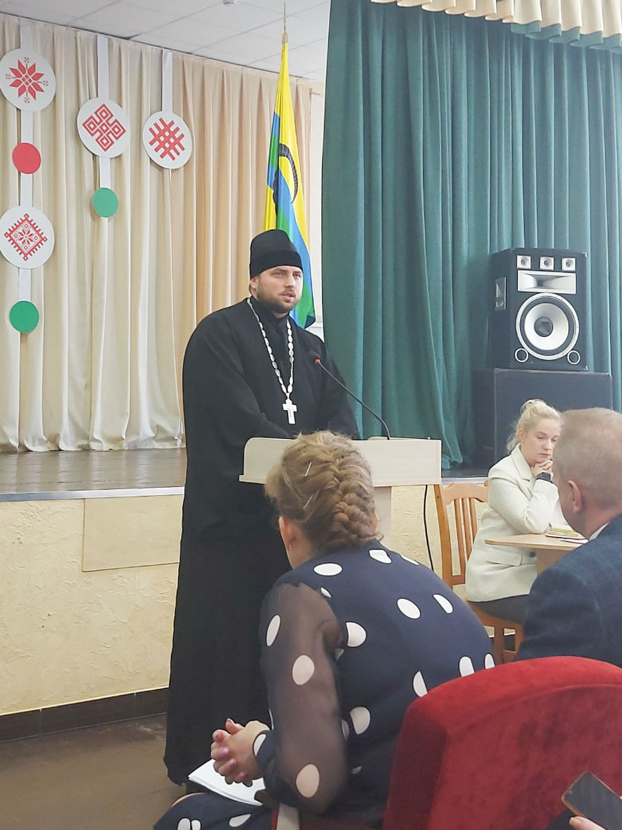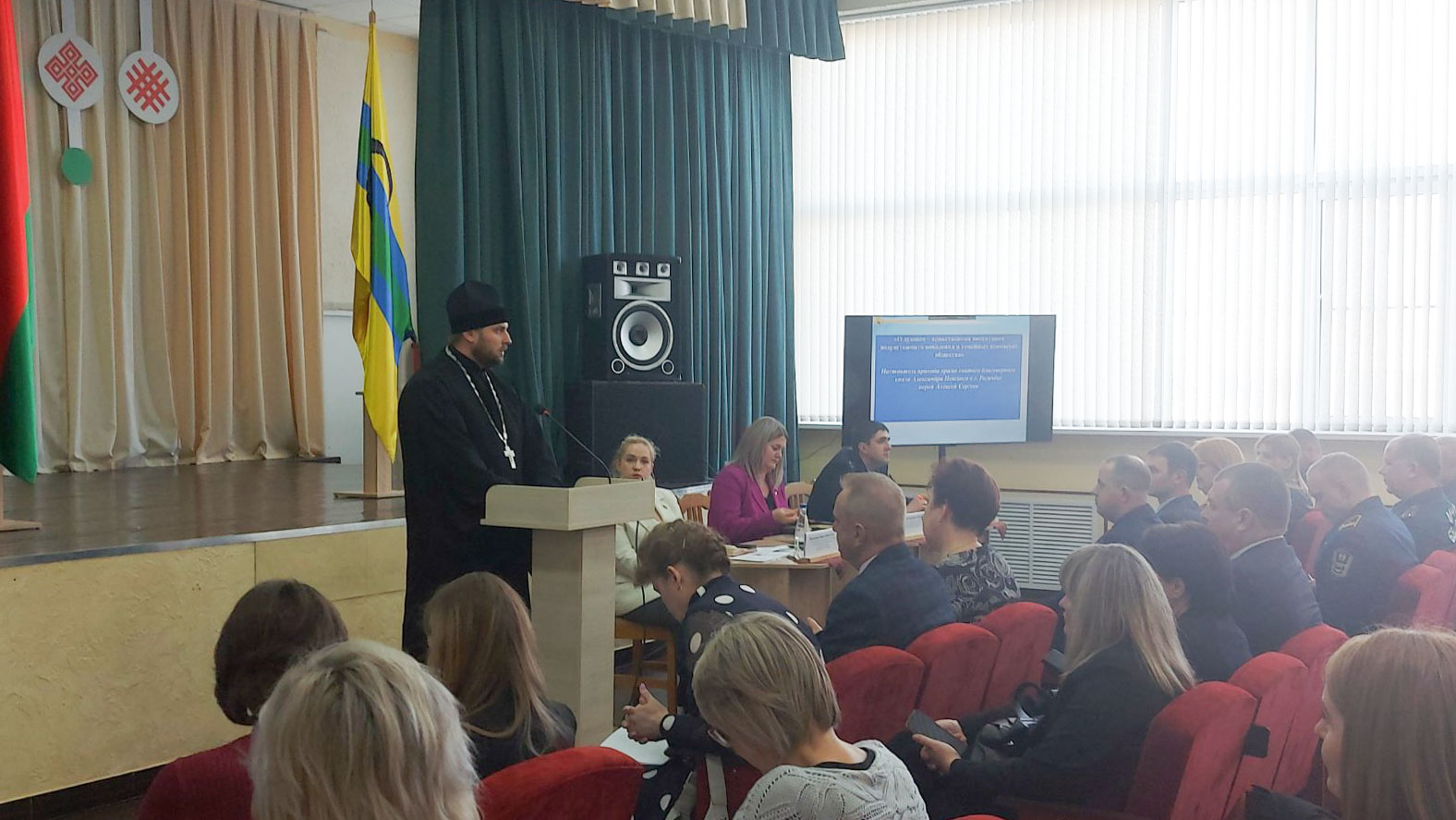 С докладом «О духовно-нравственном воспитании подрастающего поколения и семейных ценностях общества» перед собравшимися выступил благочинный церквей Рогачёвского округа иерей Алексей Сергеев.