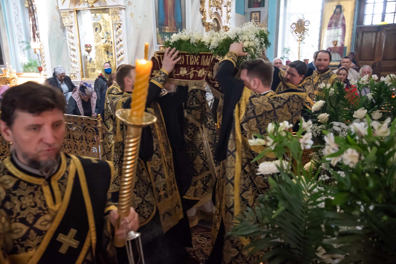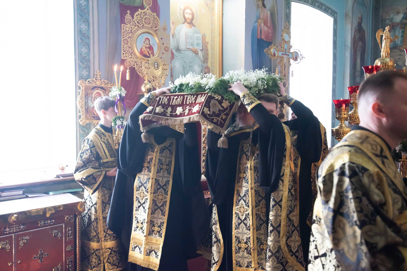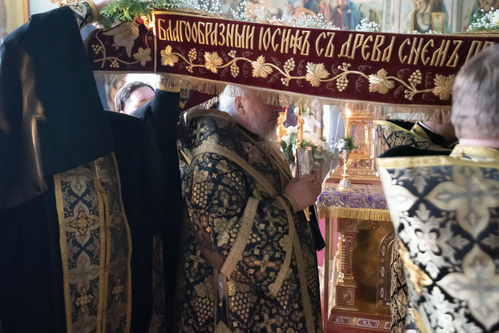 Под пение тропаря Великого пятка «Благообразный Иосиф, с древа снем Пречистое Тело Твое» архипастырь и священнослужители совершили вынос Святой Плащаницы из алтаря на середину храма, положив ее на «гробнице». На середину Плащаницы положено было Евангелие — свидетельство того, что Христос и мёртвый остаётся Живым Словом Божиим.