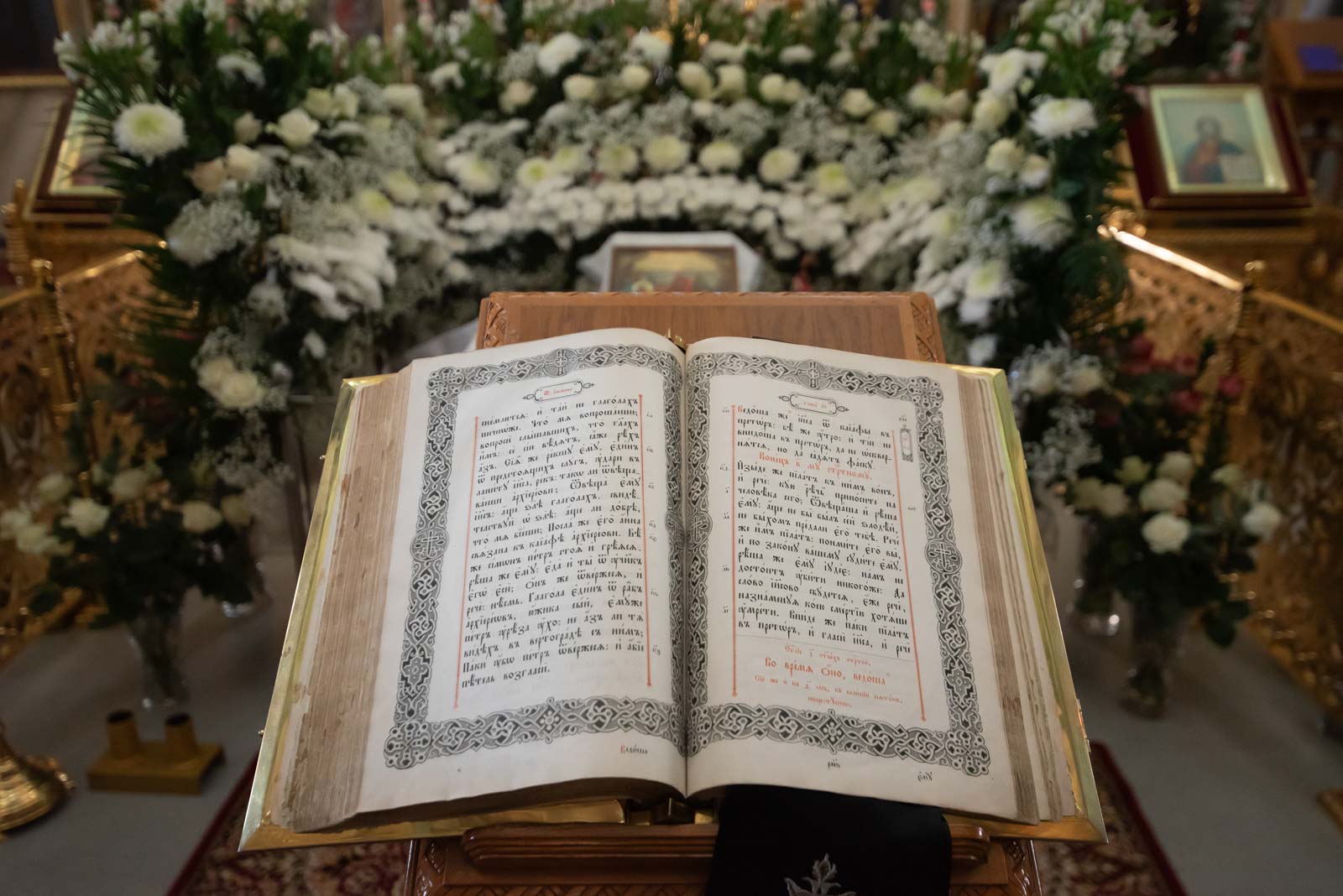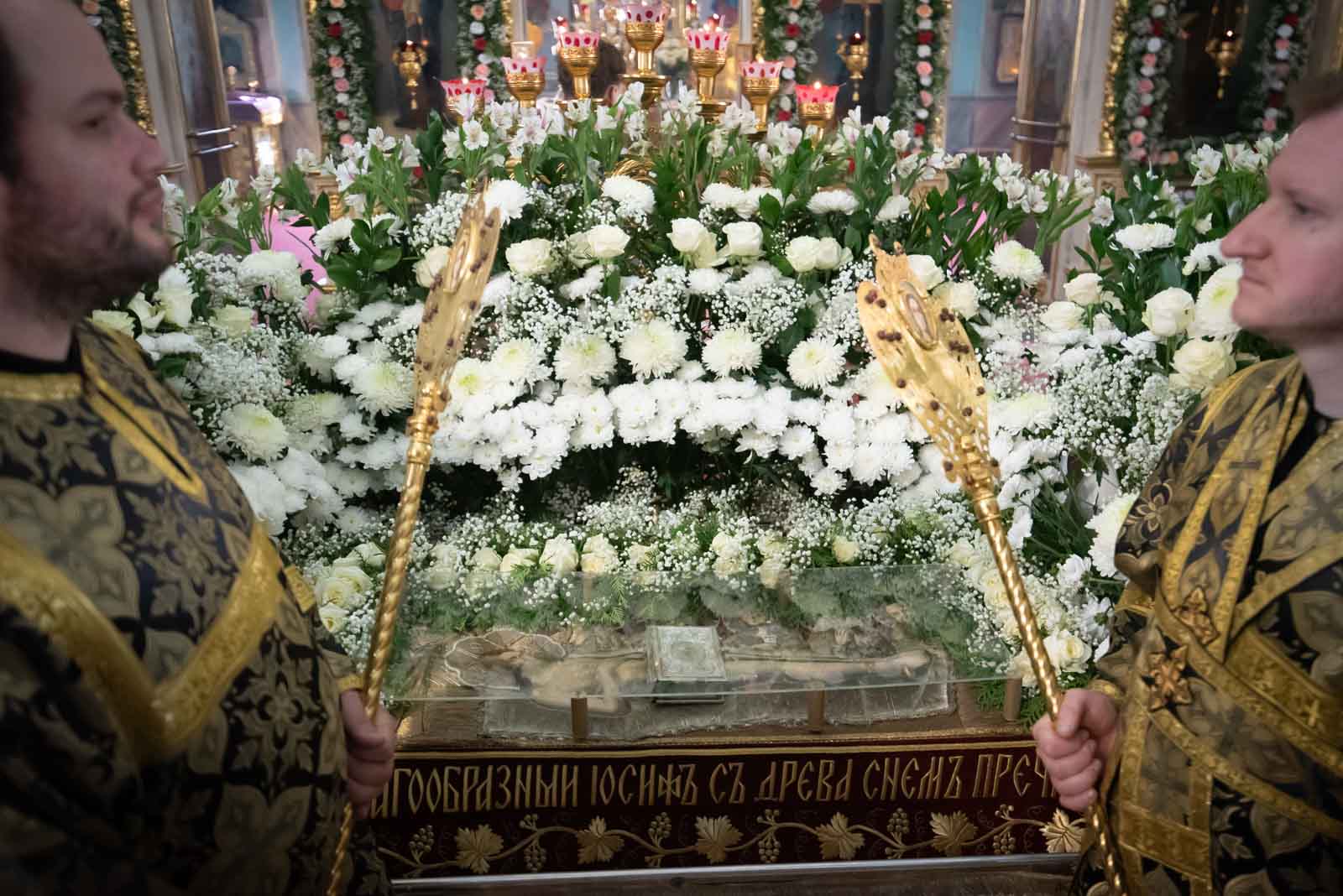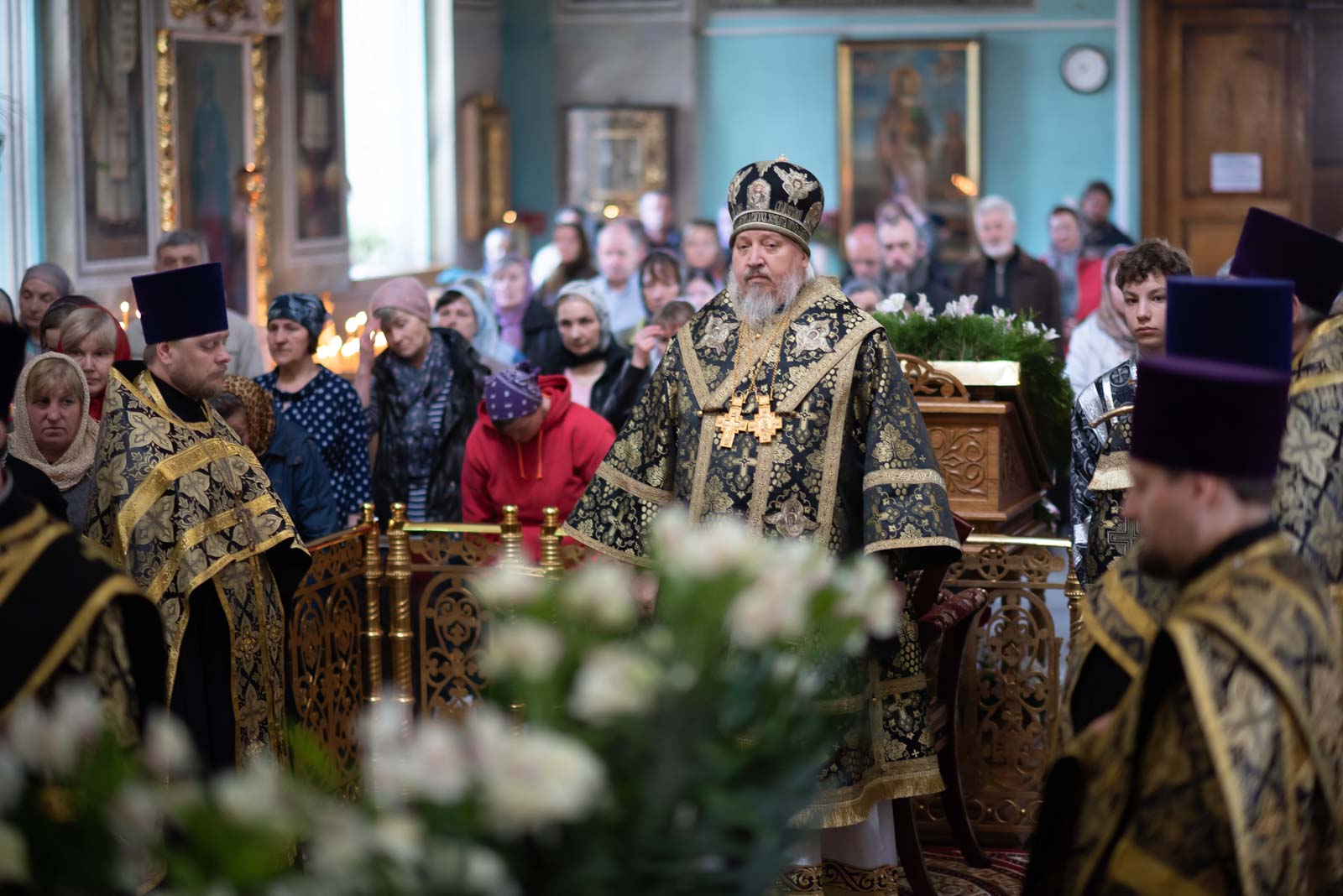 Под пение тропаря Великого пятка «Благообразный Иосиф, с древа снем Пречистое Тело Твое» архипастырь и священнослужители совершили вынос Святой Плащаницы из алтаря на середину храма, положив ее на «гробнице». На середину Плащаницы положено было Евангелие — свидетельство того, что Христос и мёртвый остаётся Живым Словом Божиим.