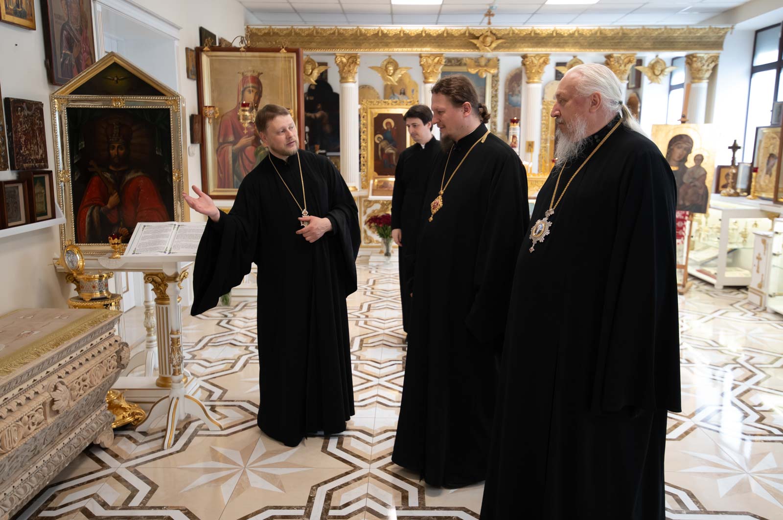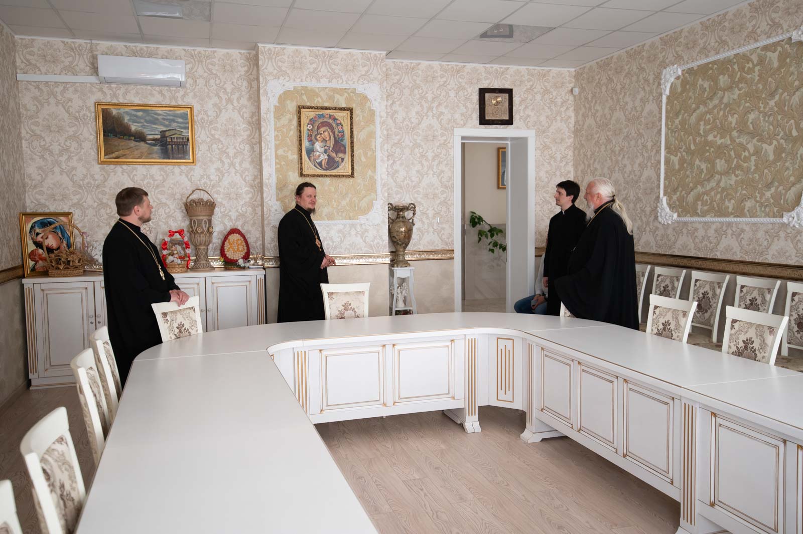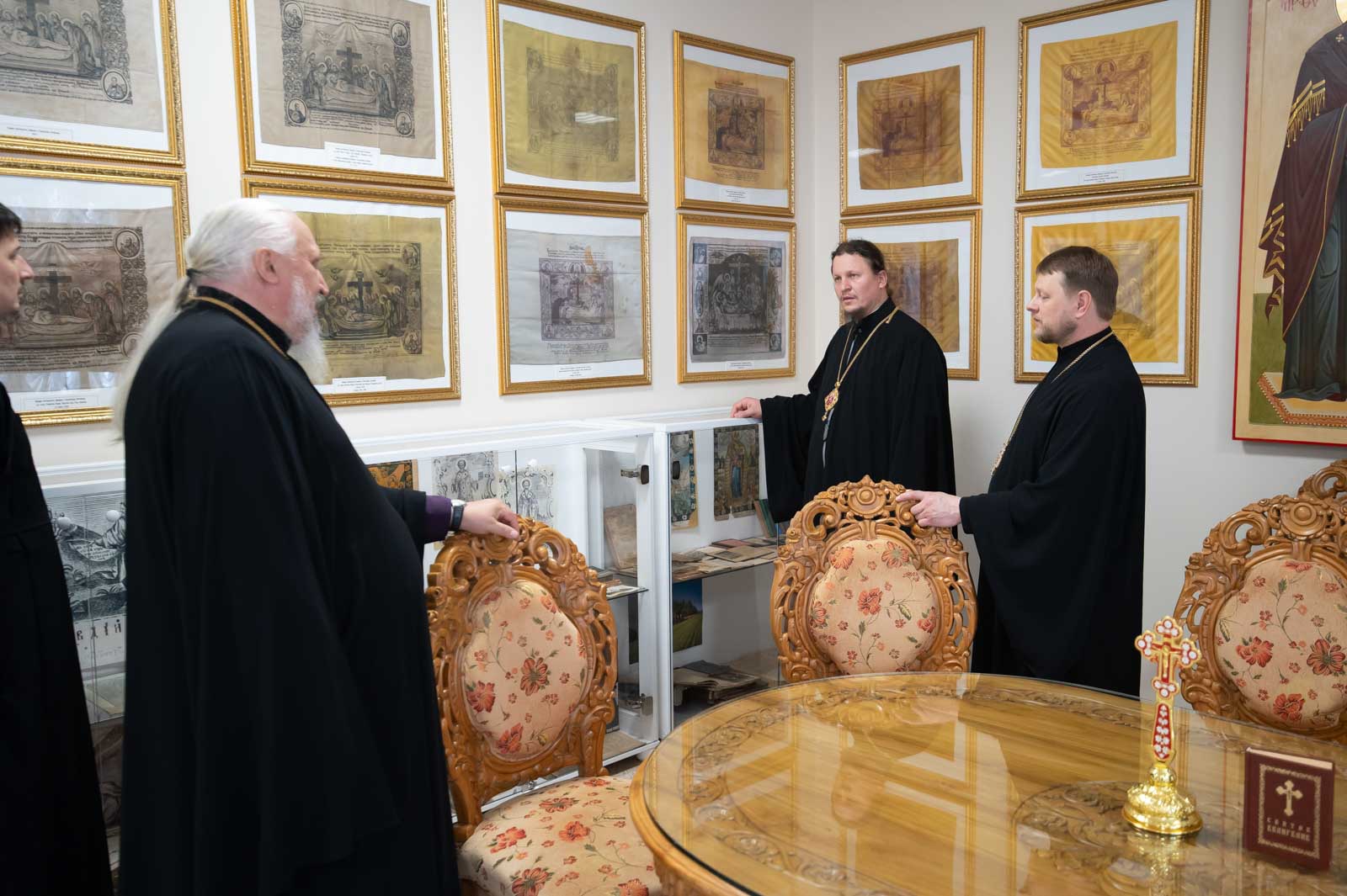 Затем владыки посетили Гомельское епархиальное управление, где была проведена подробная экскурсия по административному центру епархии. Гостям рассказали о структуре и направлениях деятельности управления, о работе профильных отделов.
