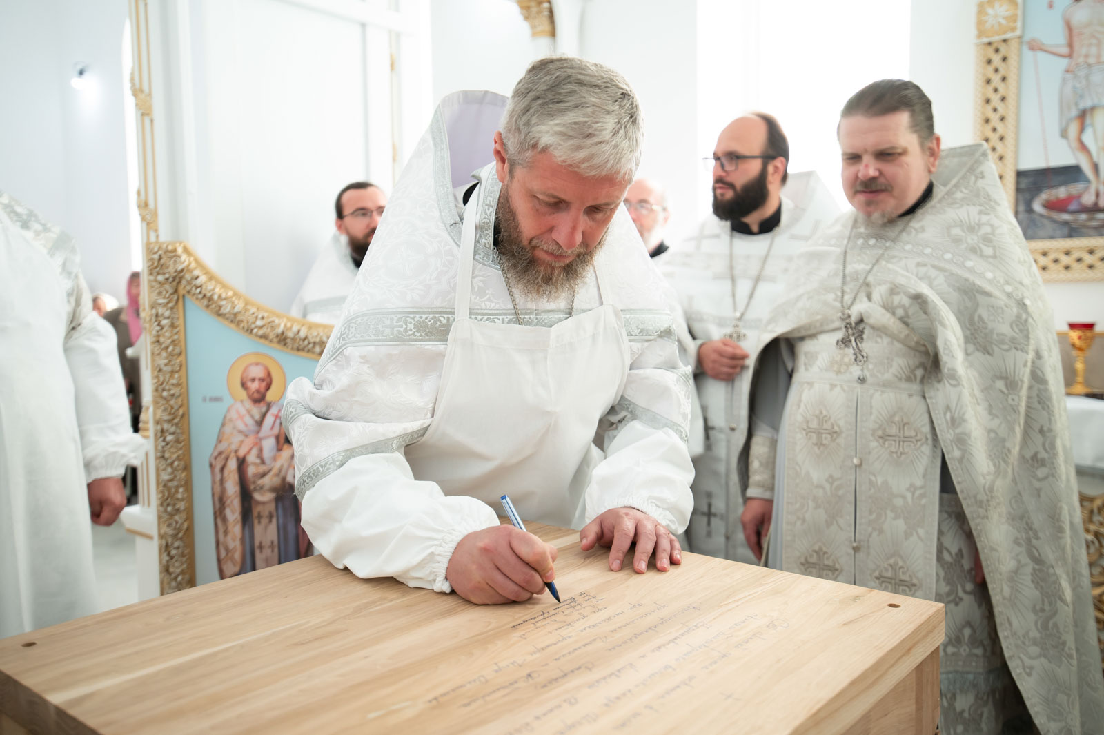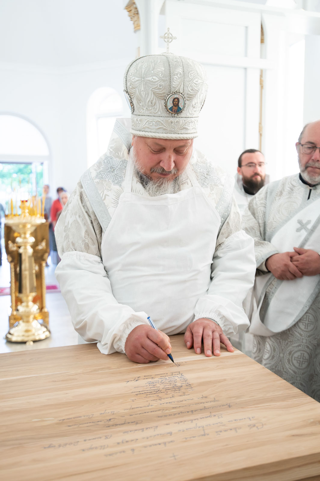 Далее архиепископ Стефан обратился к молящимся с архипастырским словом и поздравил духовенство и всех прихожан со столь значимым событием – освящением храма. В своём обращении Владыка напомнил, что храм является местом, где человек возводит сердце своё к Богу. Здесь, в освящённом Доме Божием, будет приноситься бескровная Жертва, будет звучать слово Божие, будет совершаться Таинство исповеди и Евхаристии, здесь будет воспитываться душа христианина. Освящение храма — это не только торжество земное, но и свидетельство о благодати Божией, Которая укрепляет всякого, входящего в освящённые стены храма.