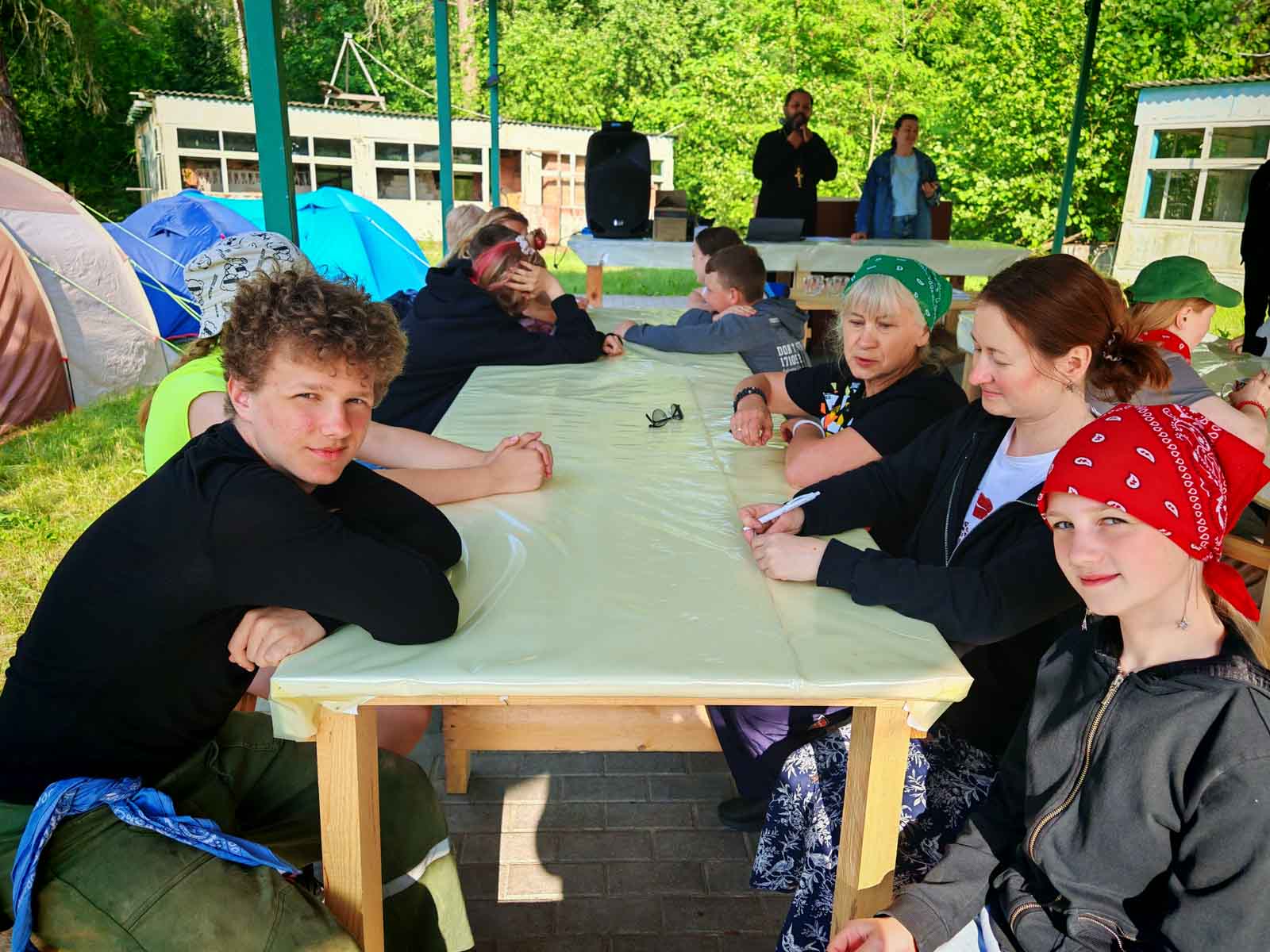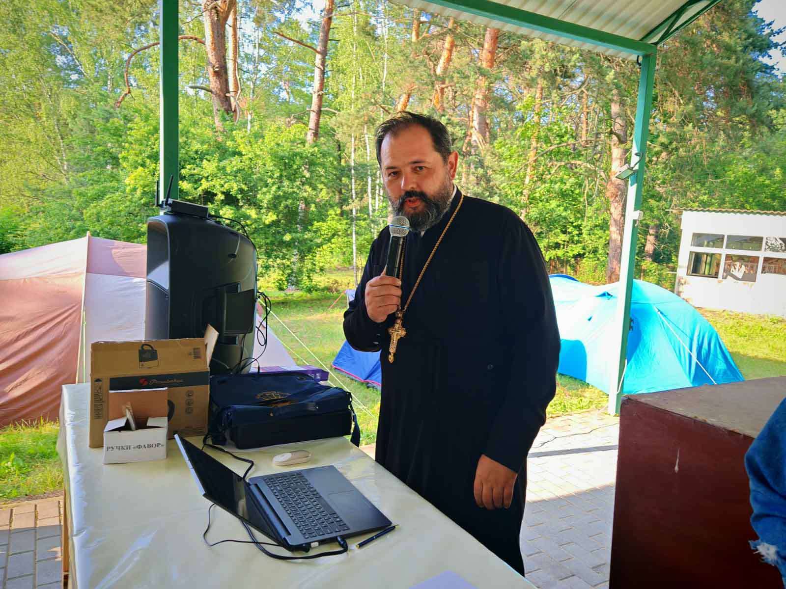 После вкусного обеда участники семейного слета смогли проверить свои знания по основам православной культуры, приняв участие в интеллектуальной игре «Фавор», которую провел председатель отдела религиозного образования и катехизации протоиерей Артемий Кривицкий.