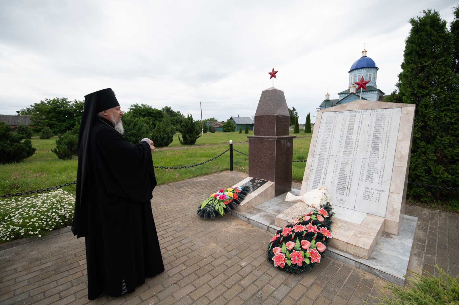 В завершение богослужения архиепископ Стефан, духовенство и молящиеся возложили цветы у мемориала воинам, павшим в годы Великой Отечественной войны — как символ благодарной памяти и глубокой признательности к подвигу защитников Отечества.