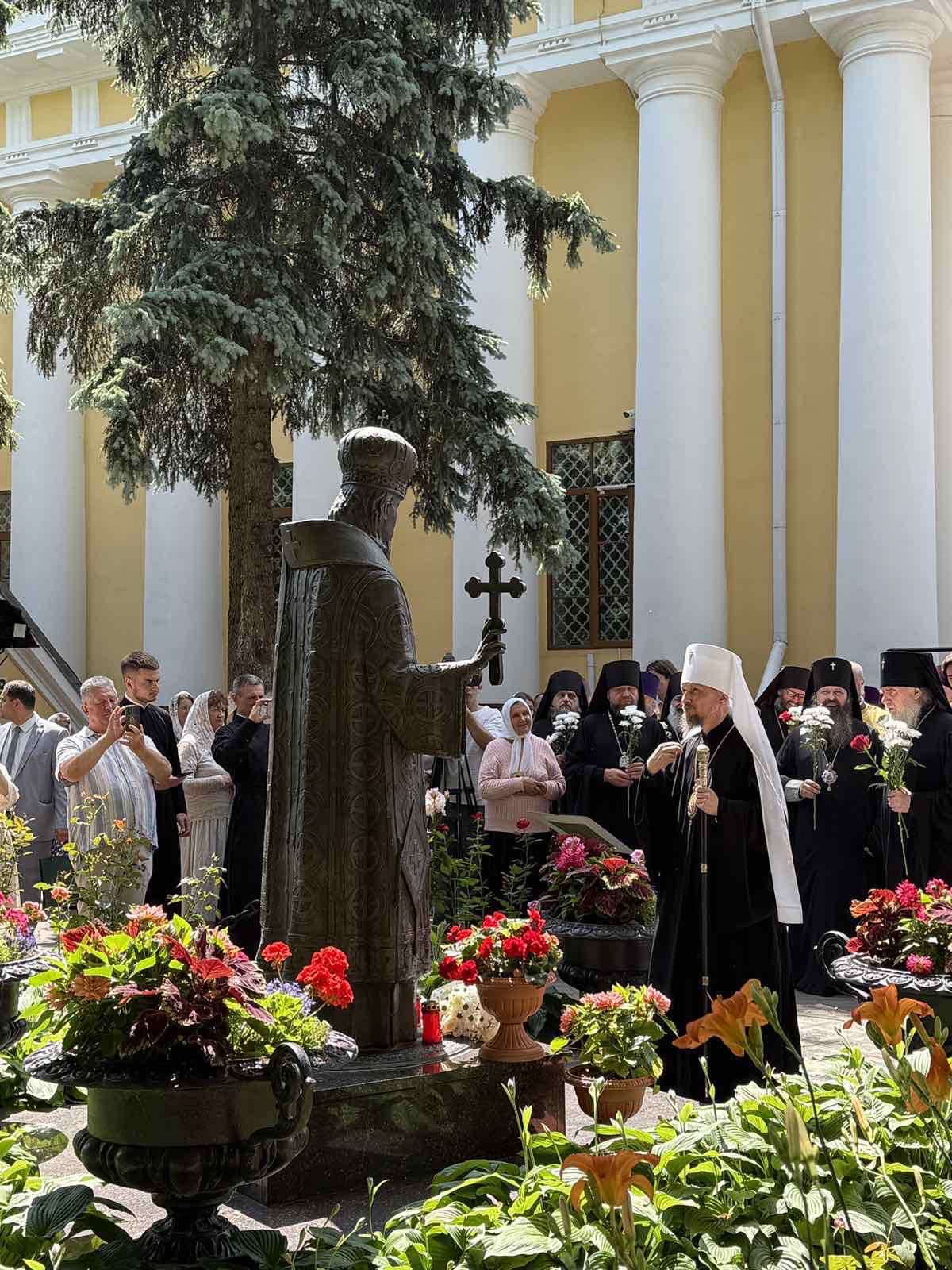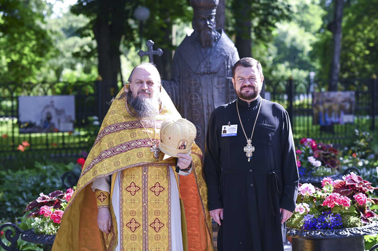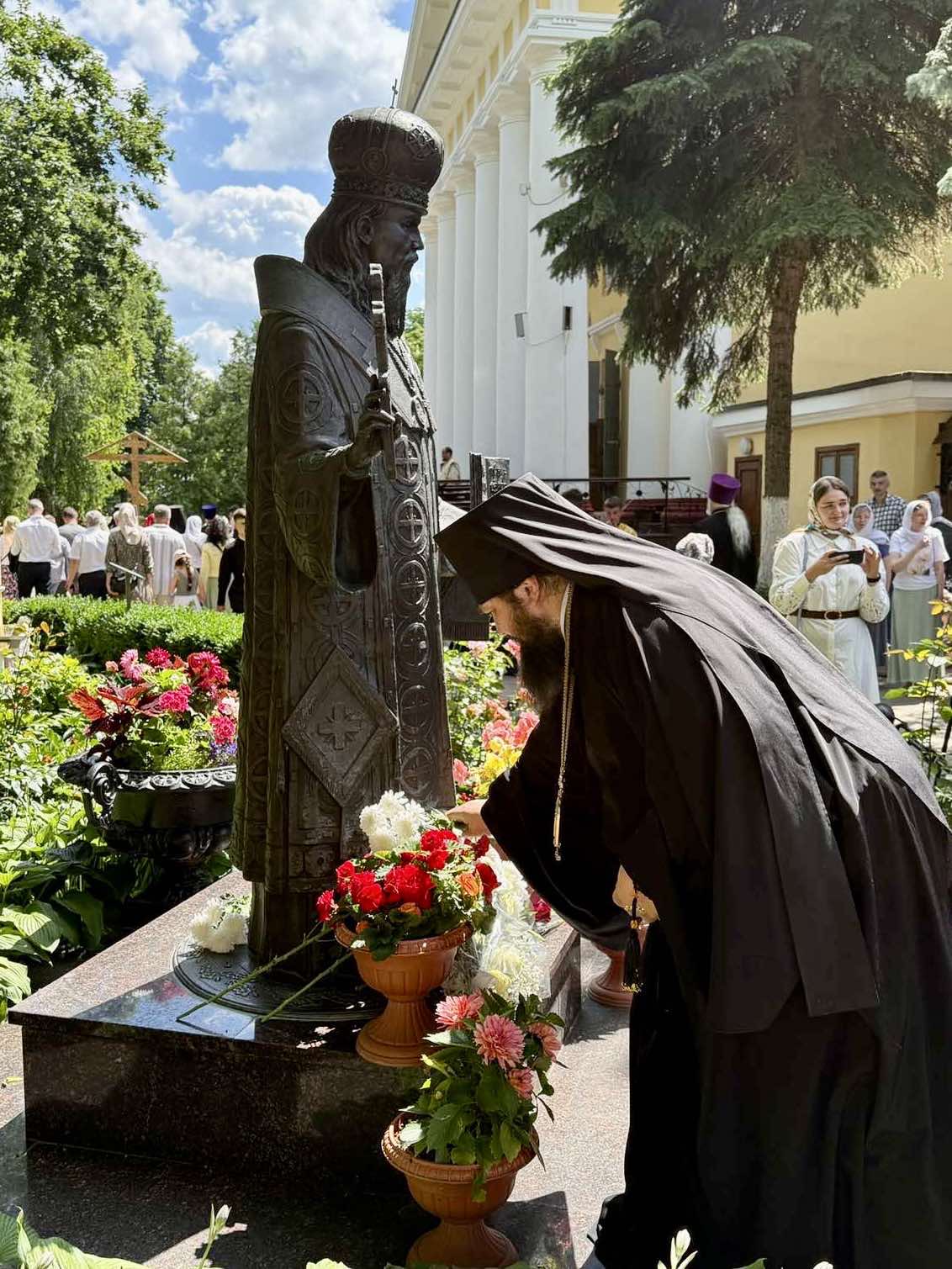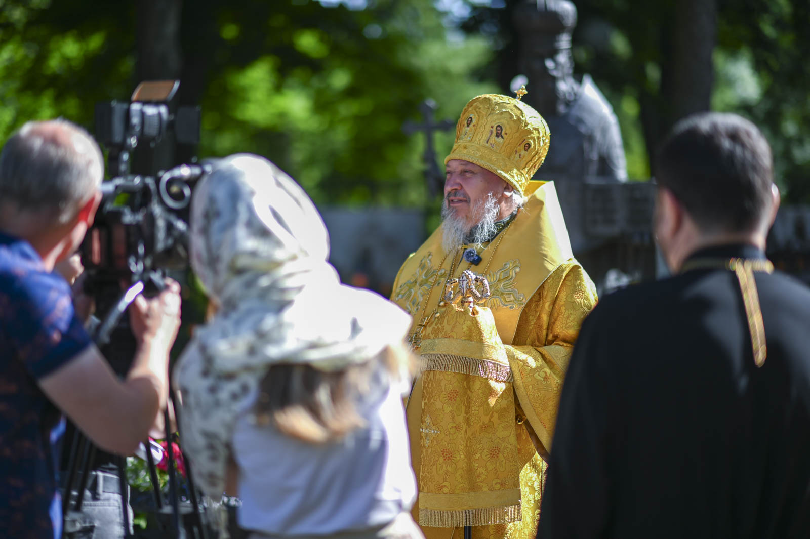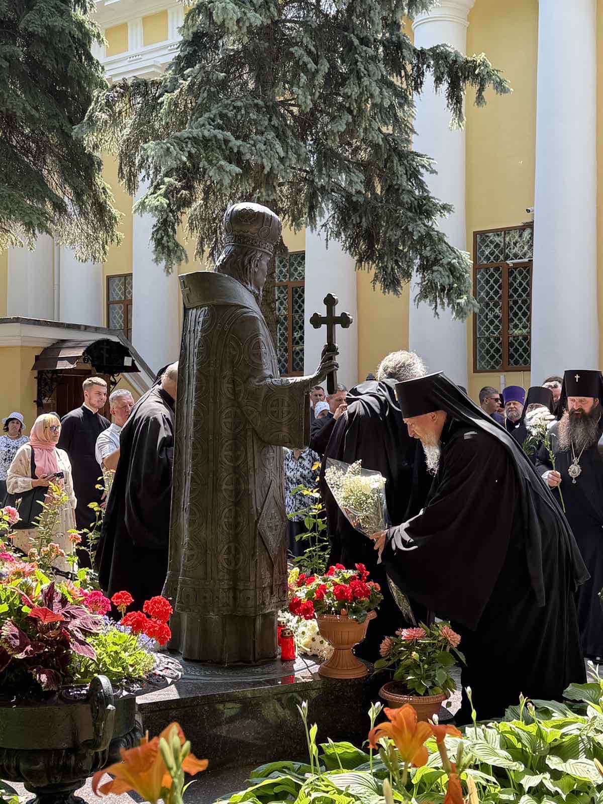 По завершении богослужения архипастыри и духовенство возложили цветы у памятника священномученику Митрофану Краснопольскому, установленного на территории Петро-Павловского кафедрального собора.