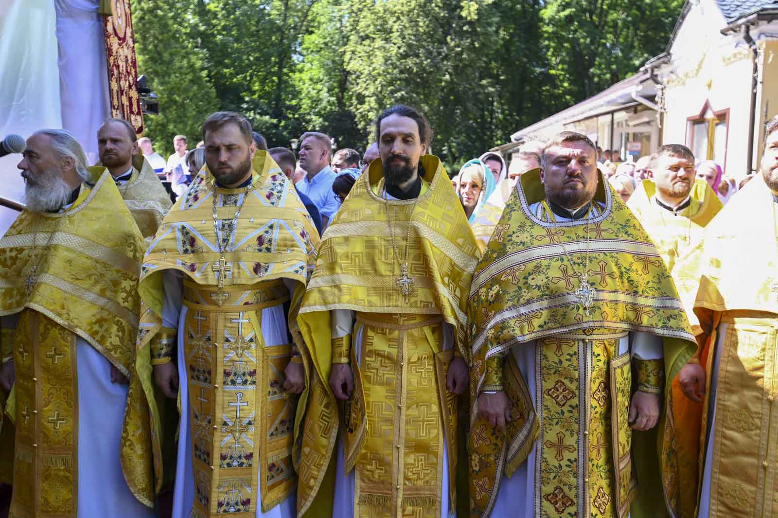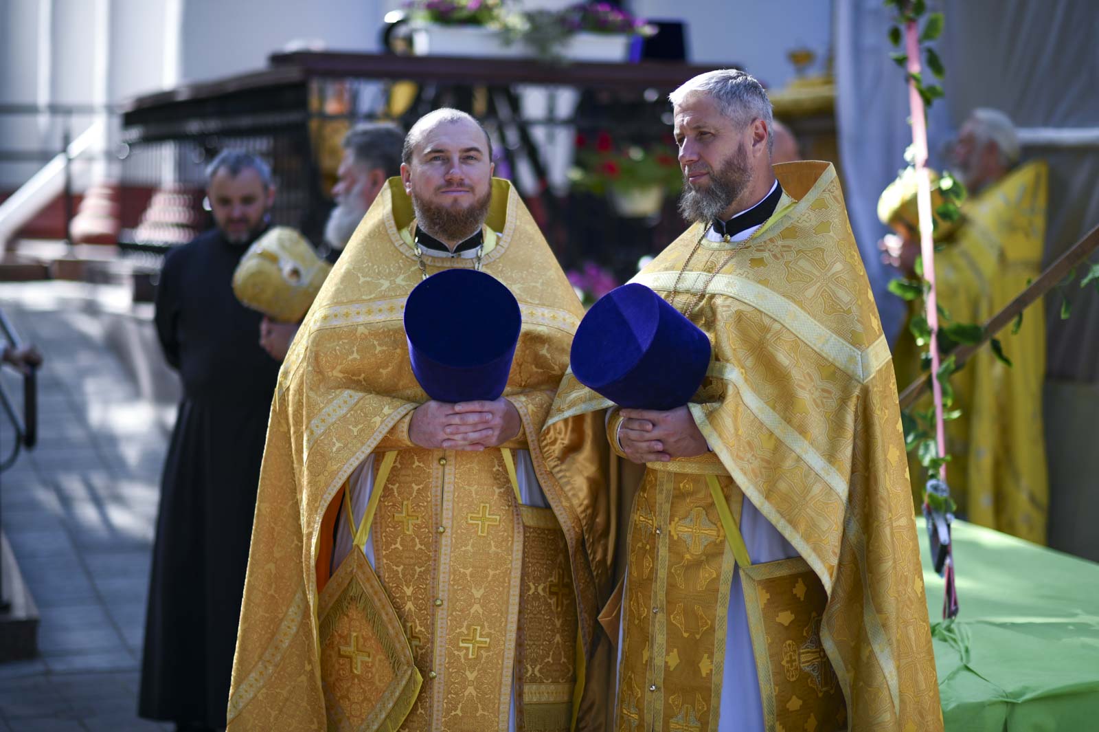 Архипастырям сослужили: ректор Минской духовной академии архимандрит Афанасий (Соколов), благочинный 4-го Минского городского церковного округа, председатель Синодального отдела по сотрудничеству со светскими учреждениями образования, председатель приходского совета прихода в честь Всех святых города Минска протоиерей Федор Повный, секретарь Минской епархии протоиерей Андрей Волков, благочинные епархиальных округов, председатели отделов, настоятели приходов и духовенство Гомельской епархии.