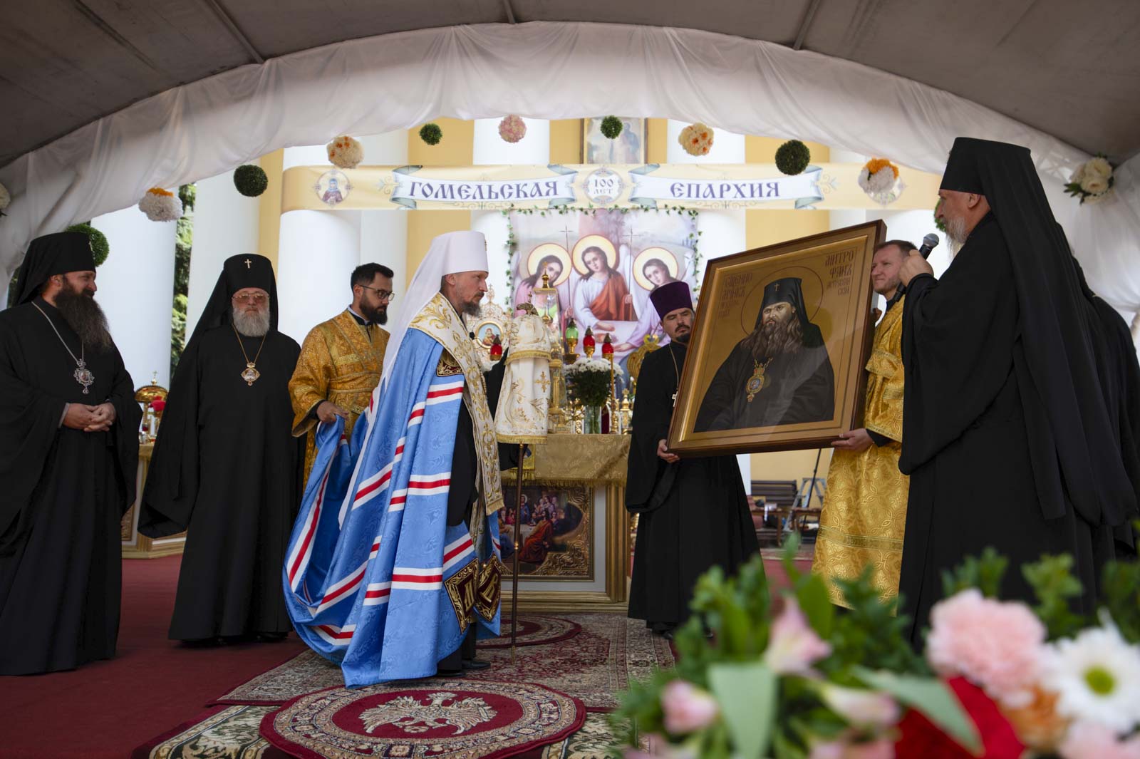 «Эти две даты сегодня нас объединяют. Я благодарен Господу за то, что Он дал нам возможность быть в эти дни на Гомельской земле — земле, преисполненной страдальцами и мучениками. Среди них — священномученик Митрофан Краснопольский, архиепископ Астраханский, начинавший своё служение в Гомеле, а в 1925 году Святителем Тихоном на кафедру был поставлен епископ Тихон (Шарапов).