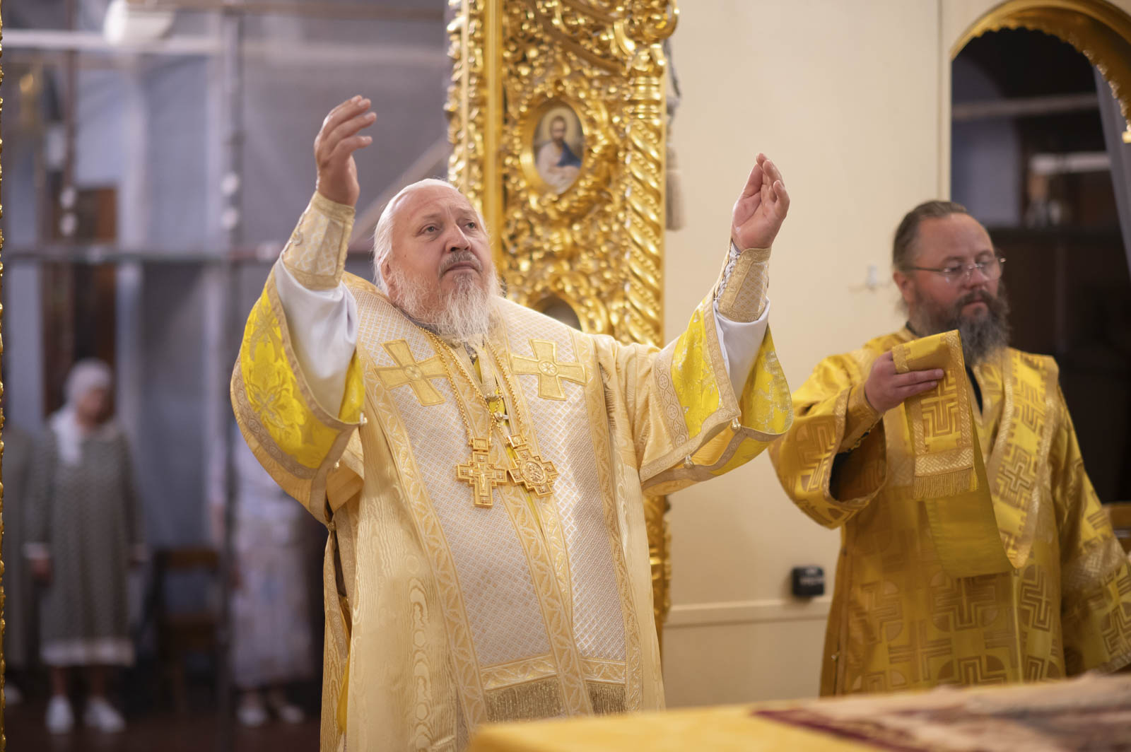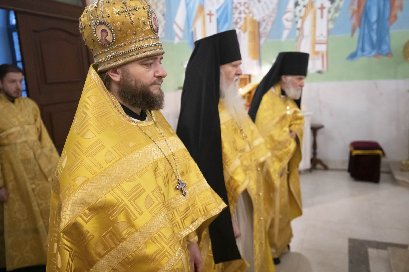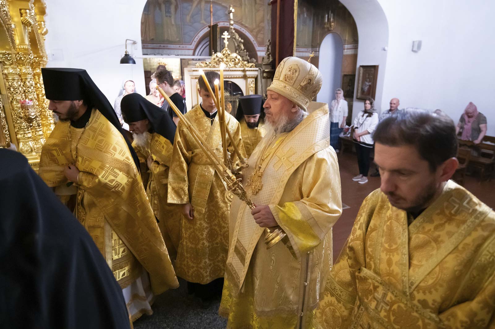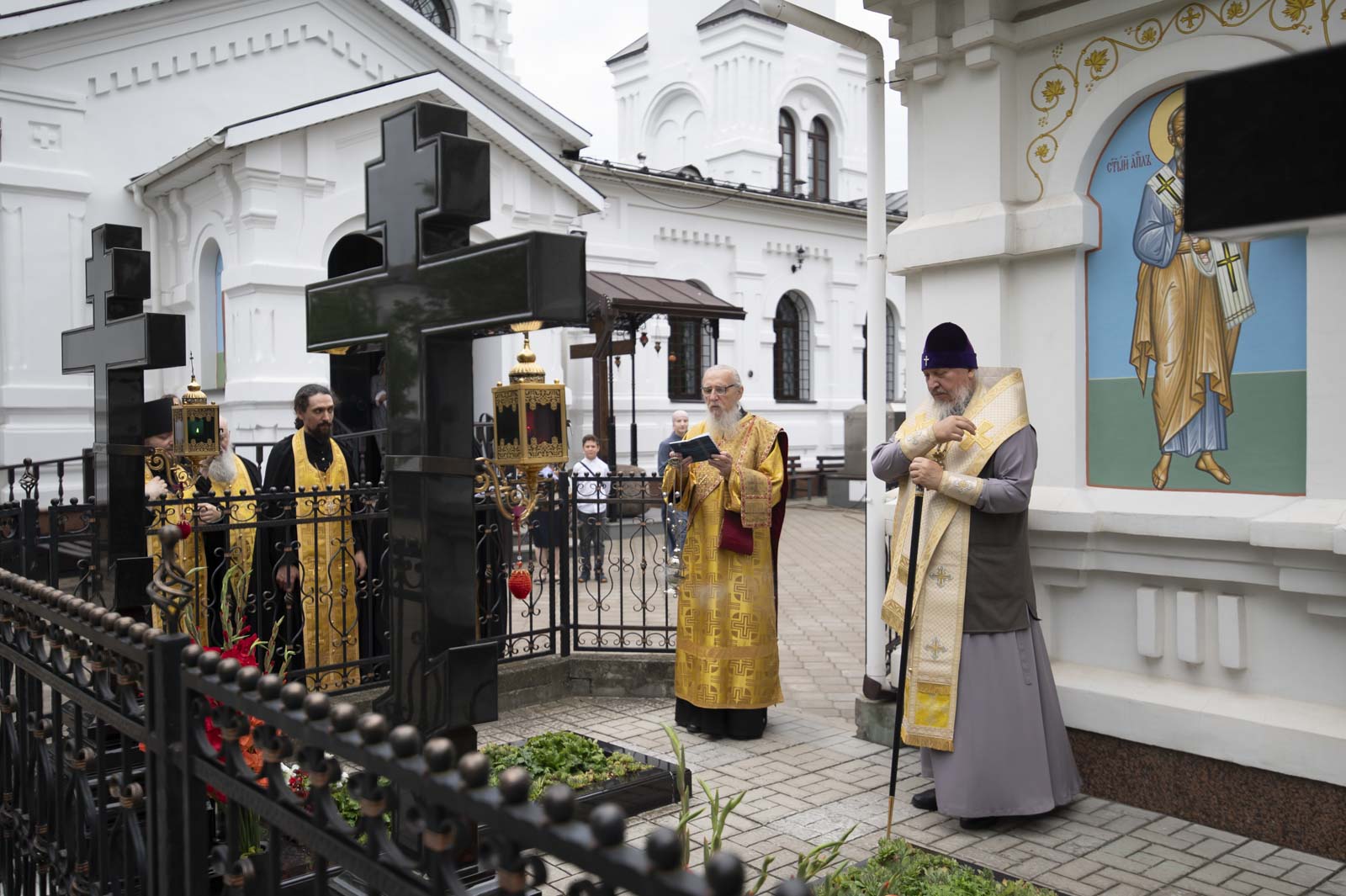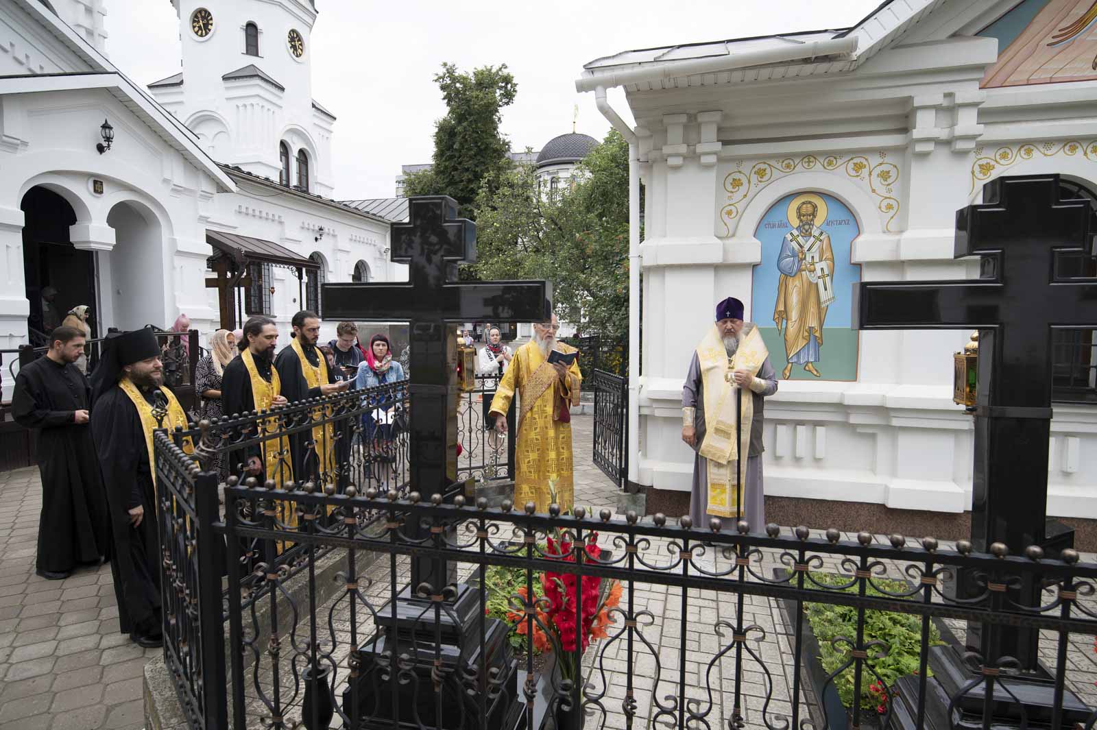 Его Высокопреосвященству сослужили: благочинный монастырей Гомельской епархии игумен Феодорит (Золотарев) и братия монастыря в священном сане.