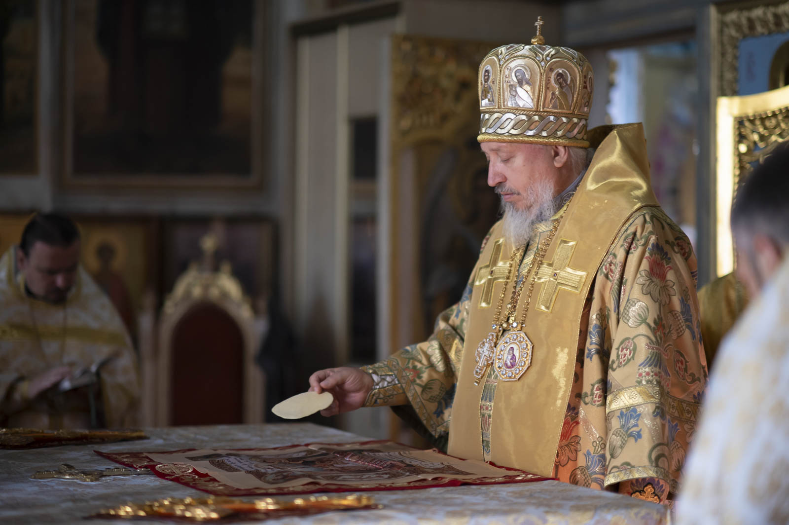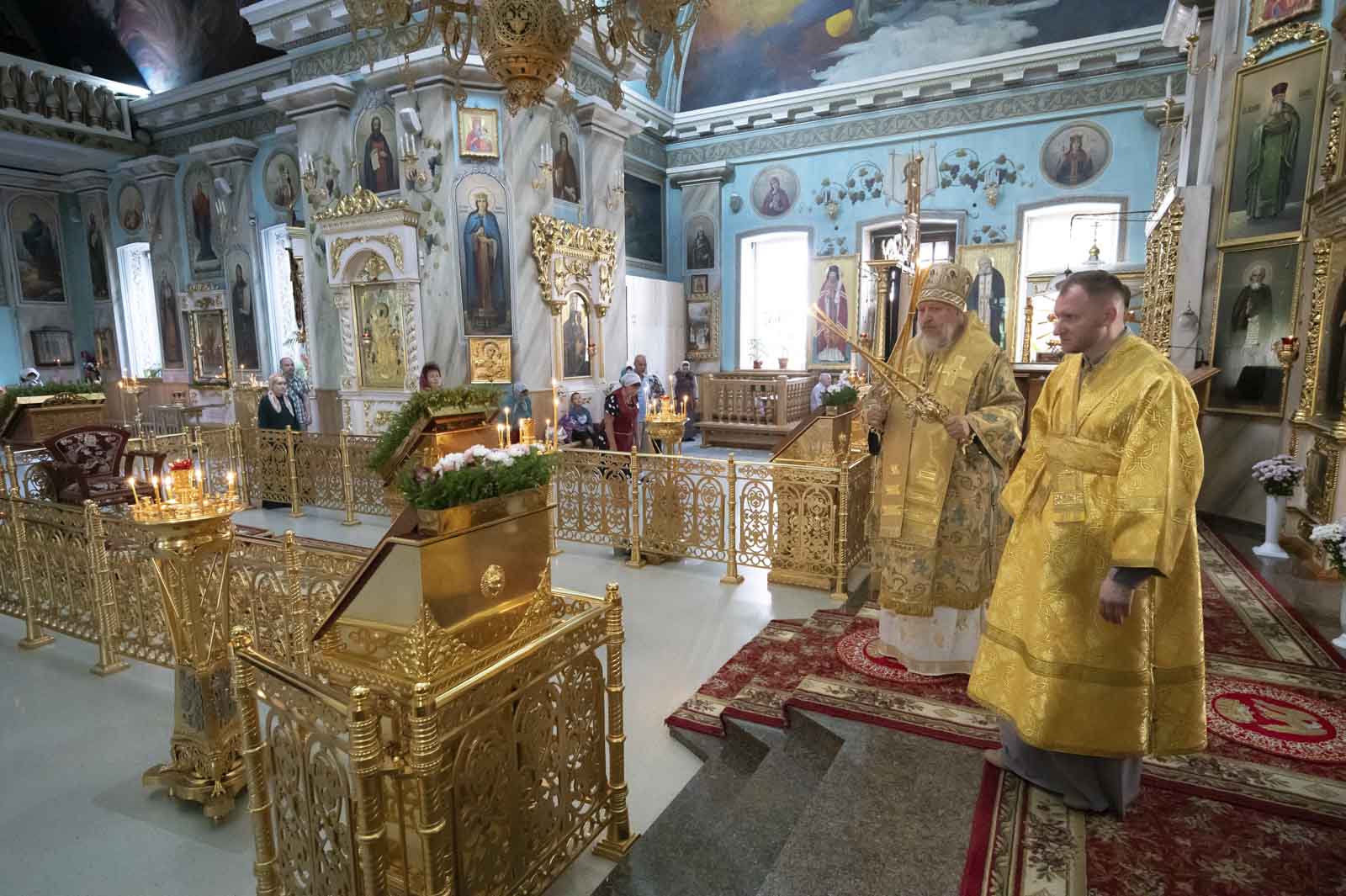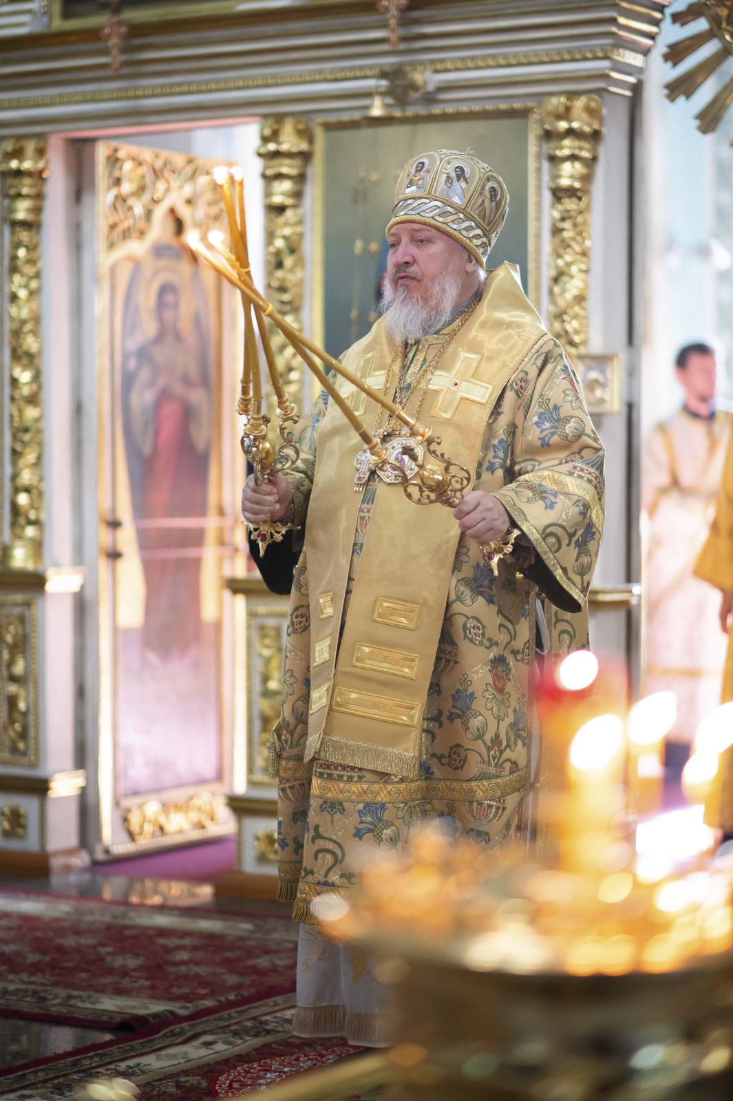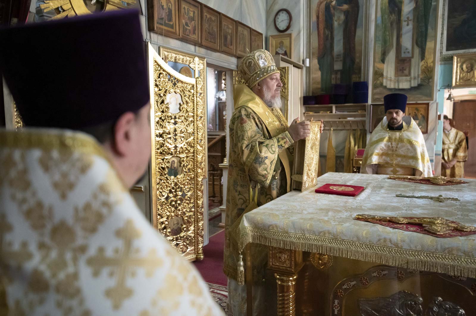 Божественную литургию 7 августа 2025 года, в четверг седмицы 9-ой по Пятидесятнице, Высокопреосвященнейший Стефан, архиепископ Гомельской и Жлобинский, совершил в Петро-Павловском кафедральном соборе г.Гомеля.