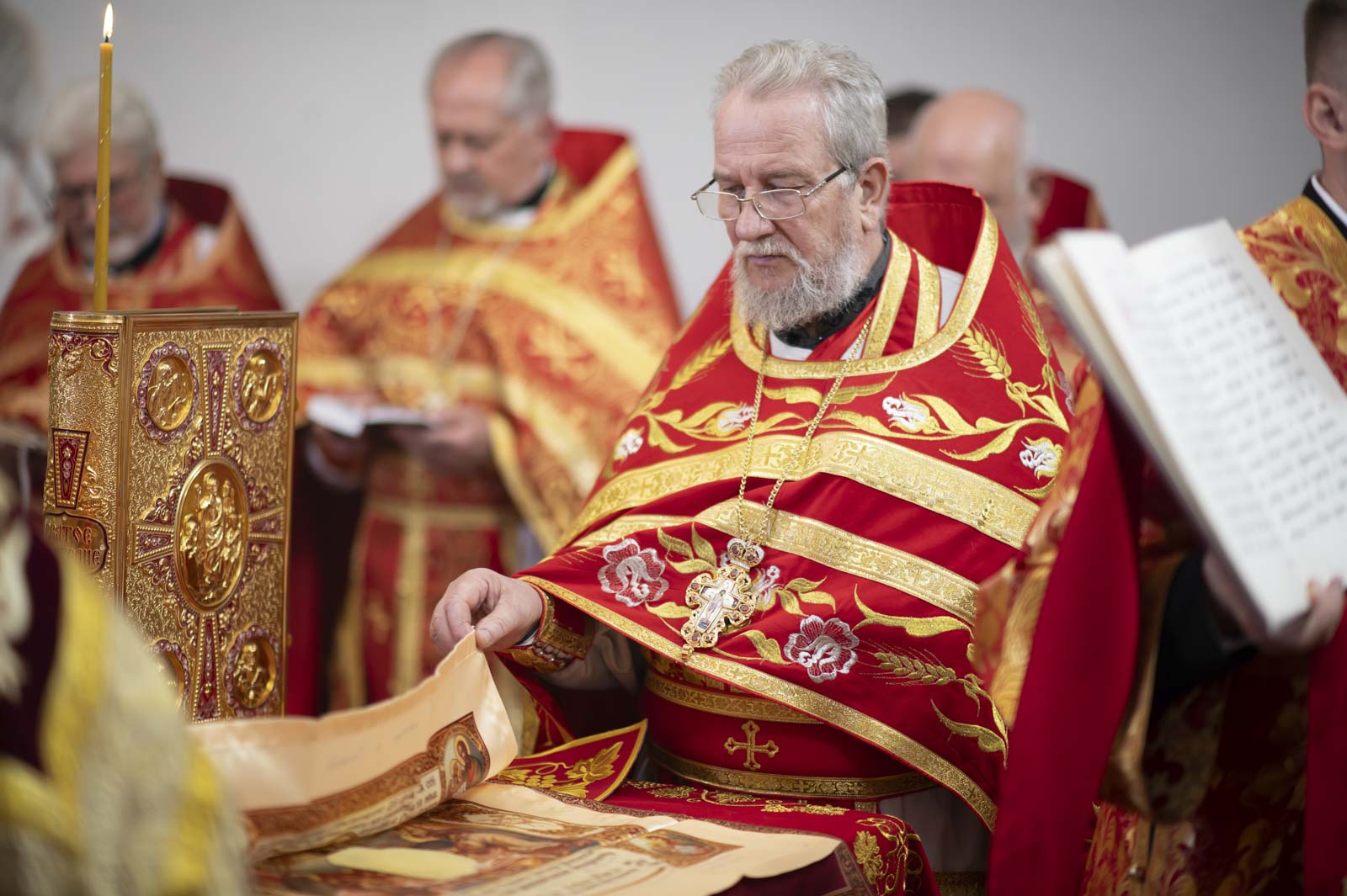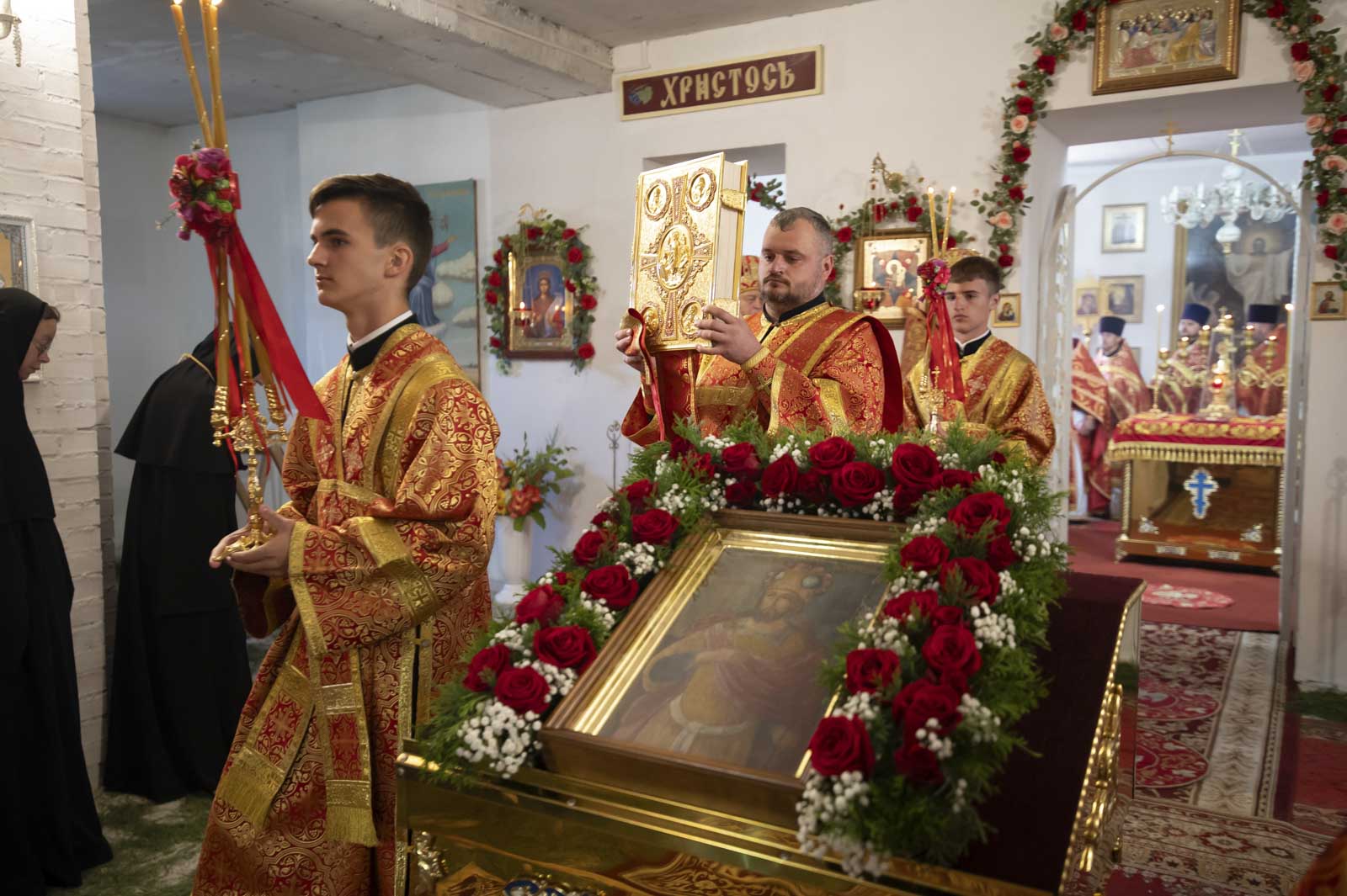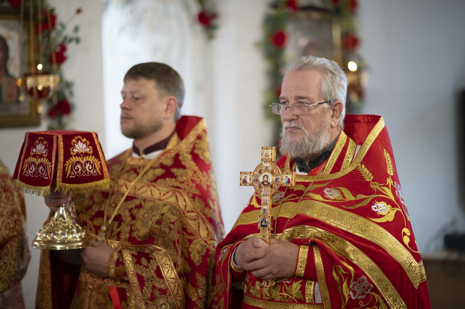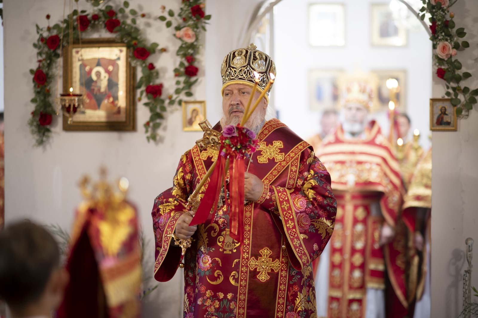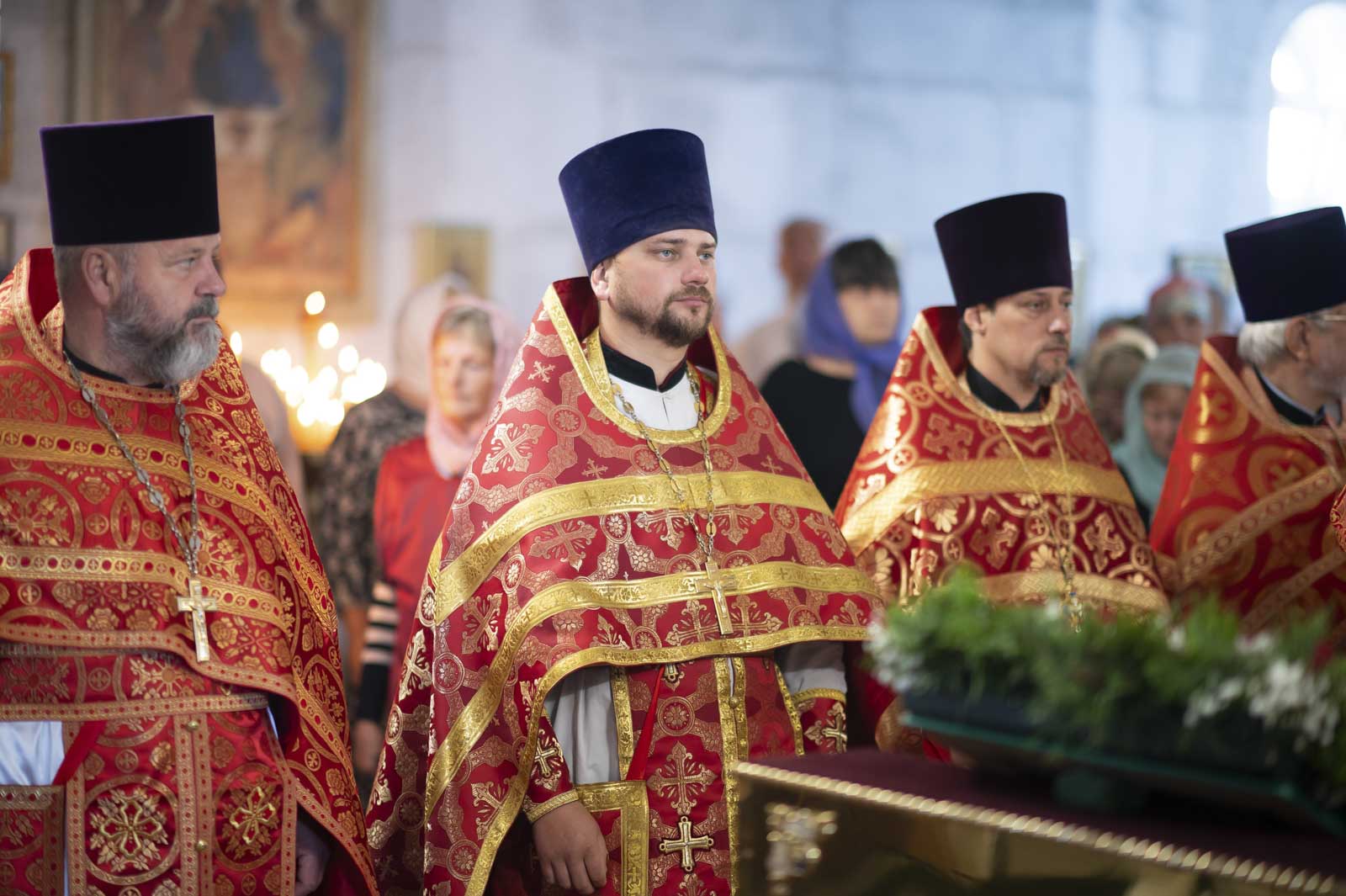 Высокопреосвященнейшему сослужили: секретарь Гомельской епархии протоиерей Георгий Алампиев, благочинный Жлобинского округа протоиерей Алексей Смотрицкий, эконом Гомельской епархии протоиерей Владимир Масалитин, председатель церковно-исторической комиссии протоиерей Александр Лопушанский, настоятель прихода храма Преображения Господня в г. Ветка протоиерей Михаил Борисенок, настоятель прихода протоиерей Михаил Борисенок и духовенство епархии.