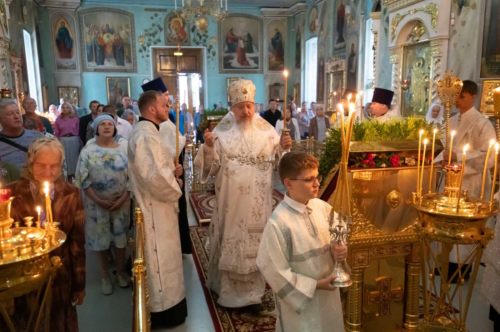 Всенощное бдение 23 августа 2025 года, в канун Недели 11-й по Пятидесятнице, Высокопреосвященнейший Стефан, архиепископ Гомельский и Жлобинский, совершил в Петро-Павловском кафедральном соборе города Гомеля.