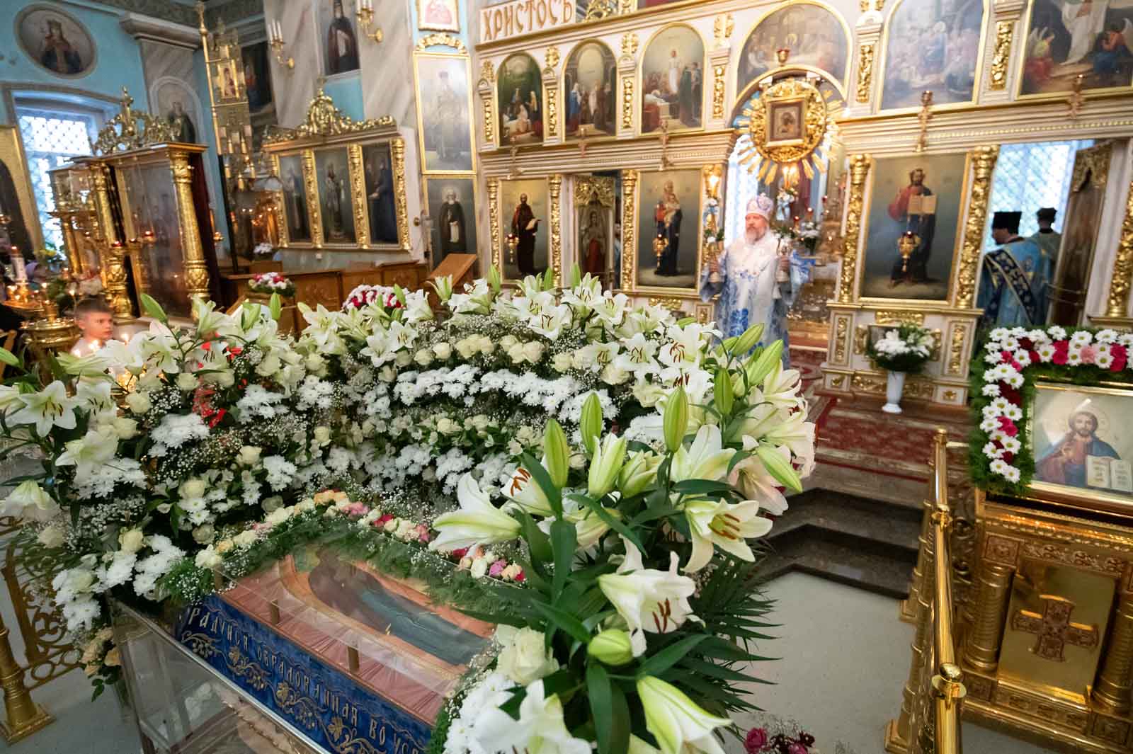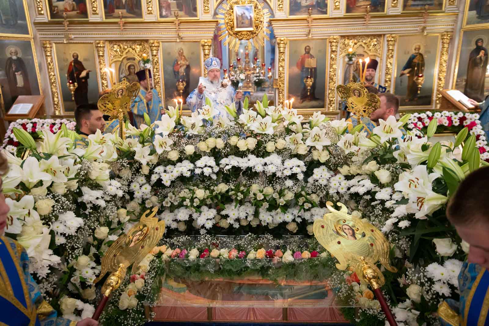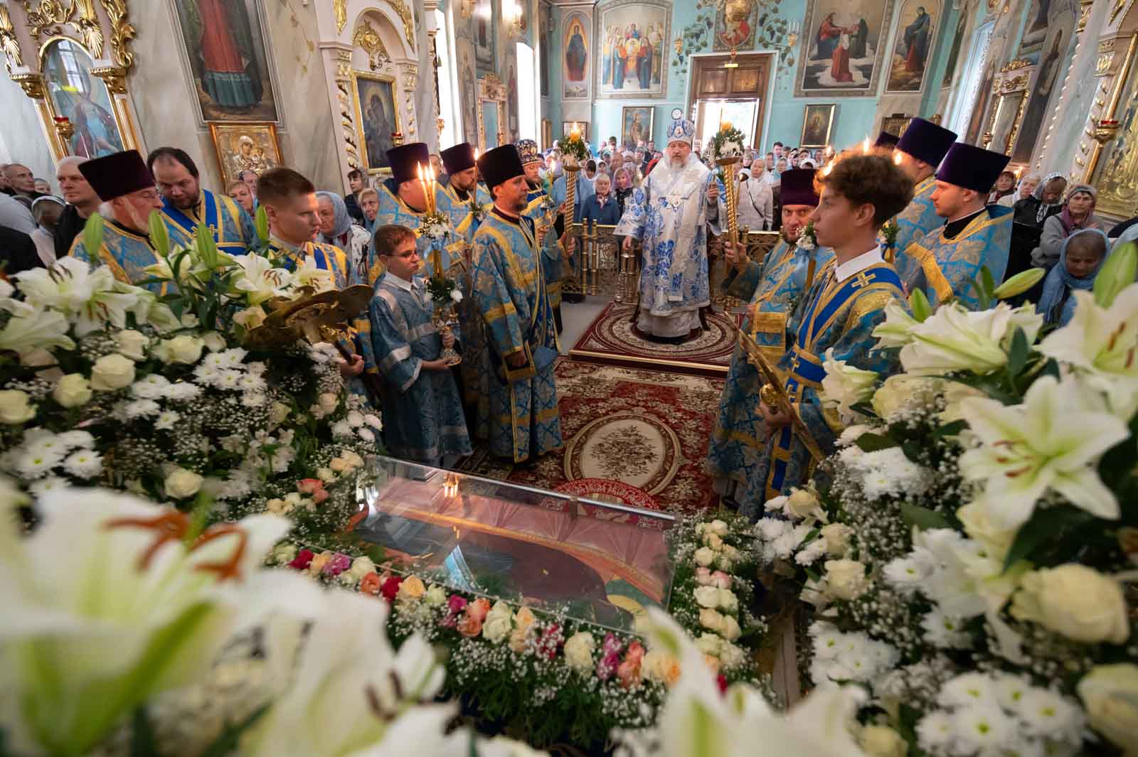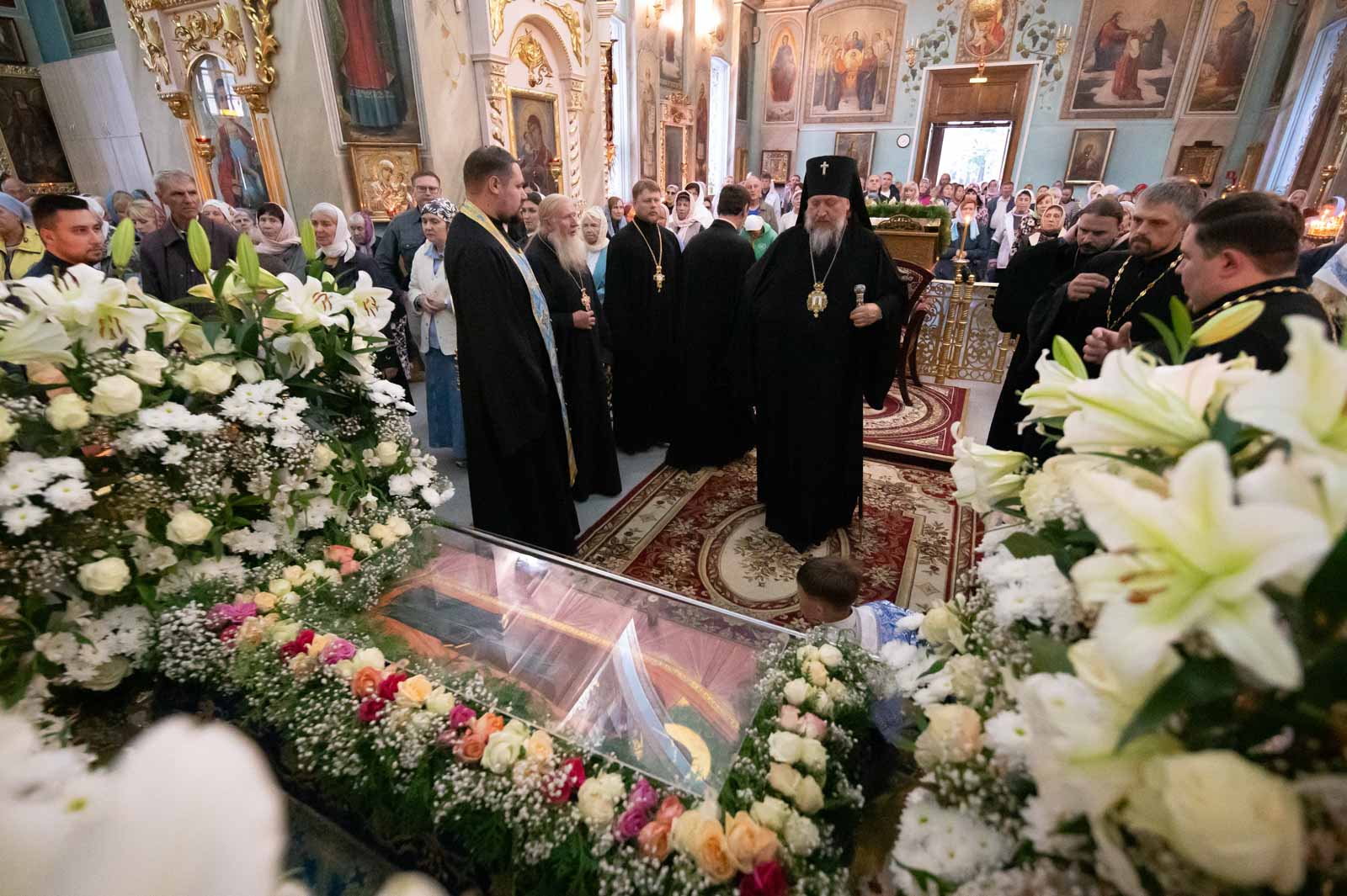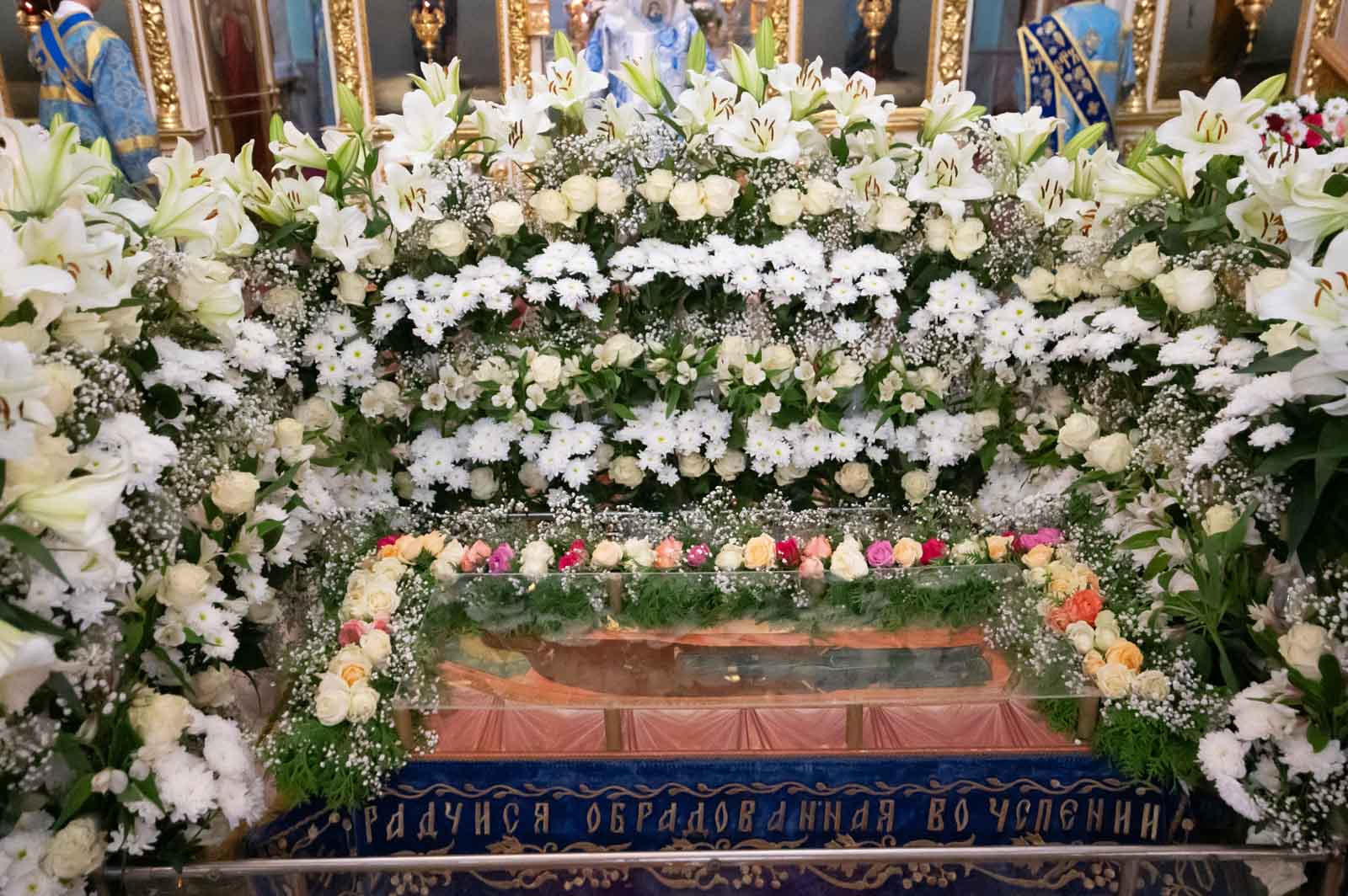 За богослужением из алтаря на середину храма была вынесена Плащаница Богородицы для поклонения верующих. Плащаница представляет собой особую вышитую икону праздника Успения Богородицы.