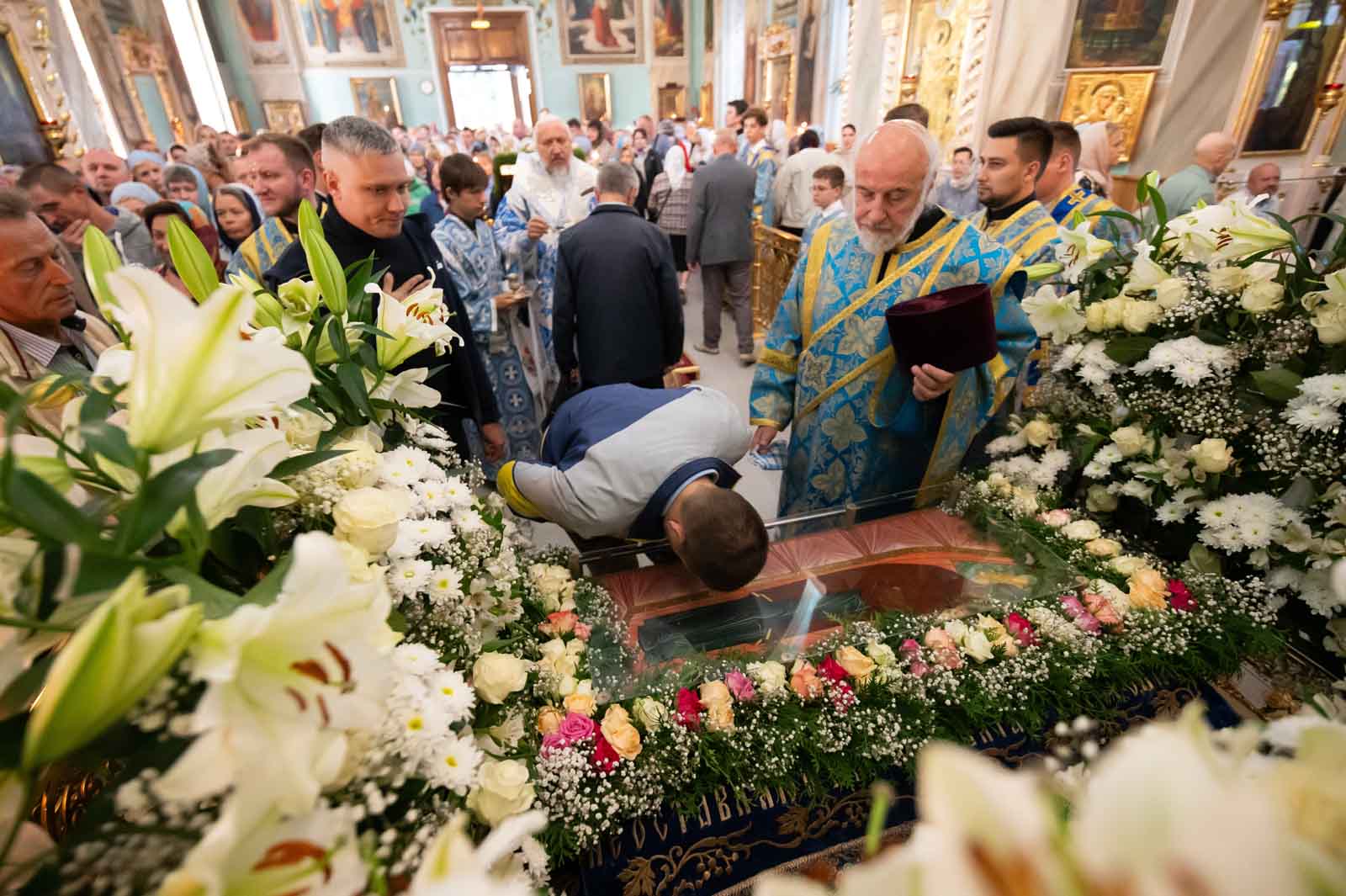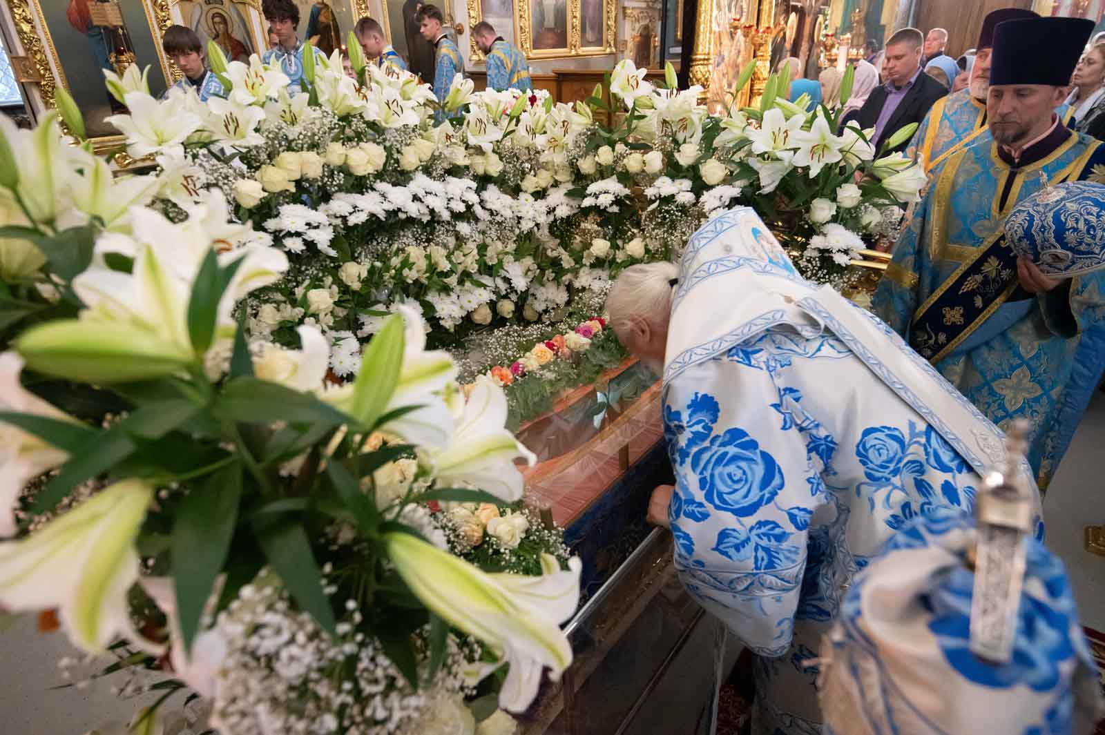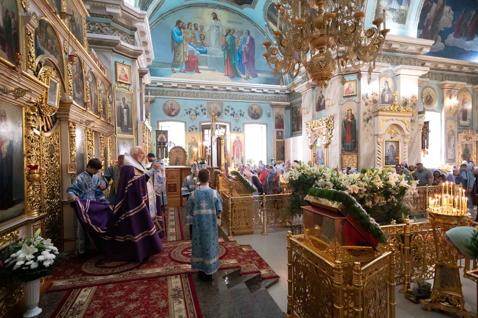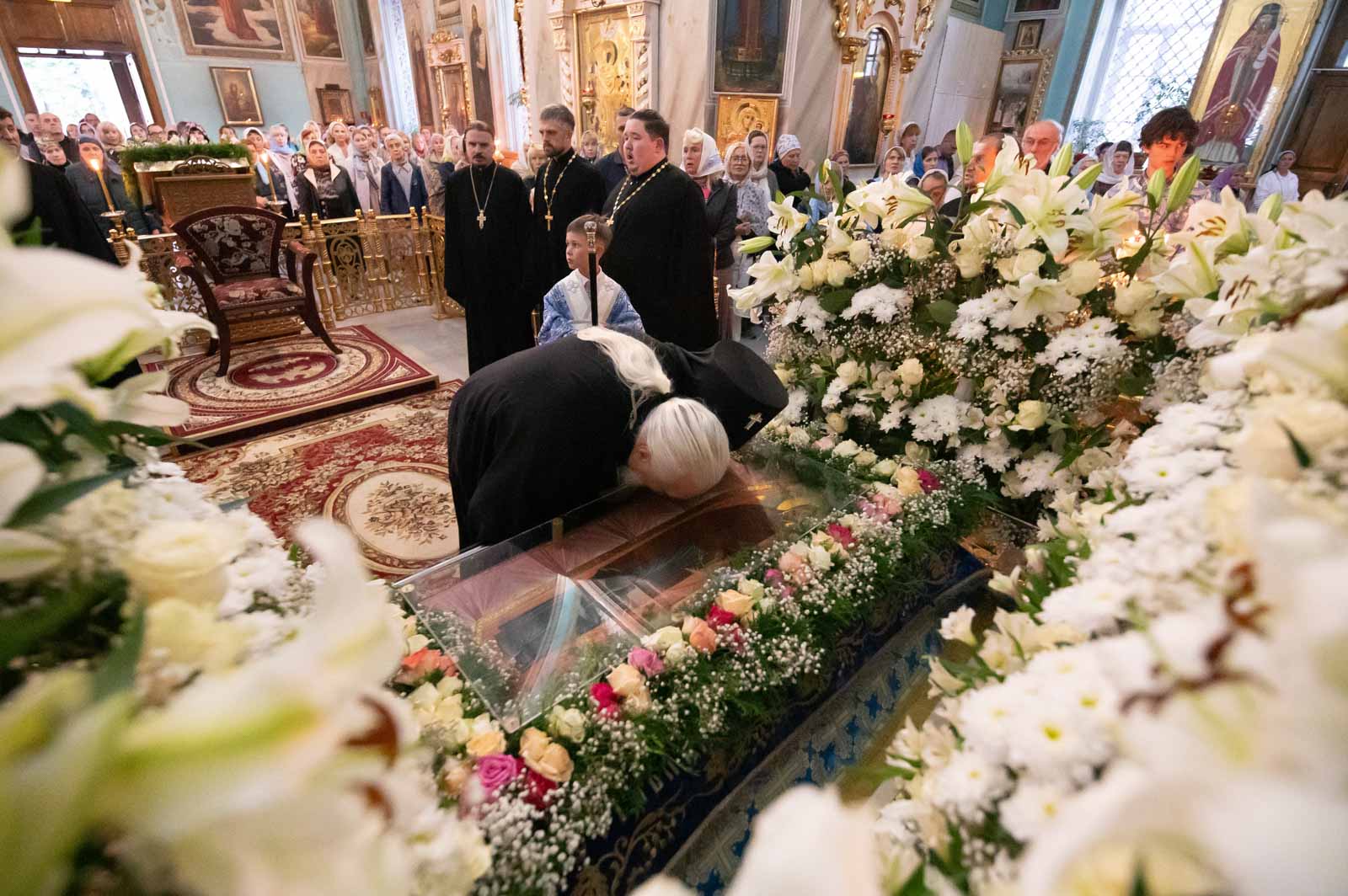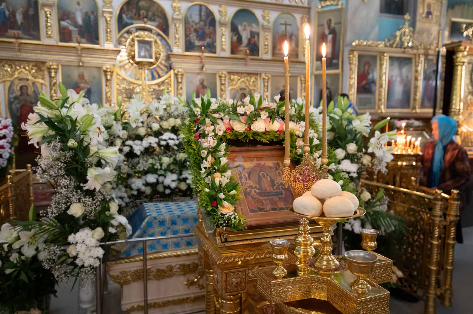 За богослужением из алтаря на середину храма была вынесена Плащаница Богородицы для поклонения верующих. Плащаница представляет собой особую вышитую икону праздника Успения Богородицы.