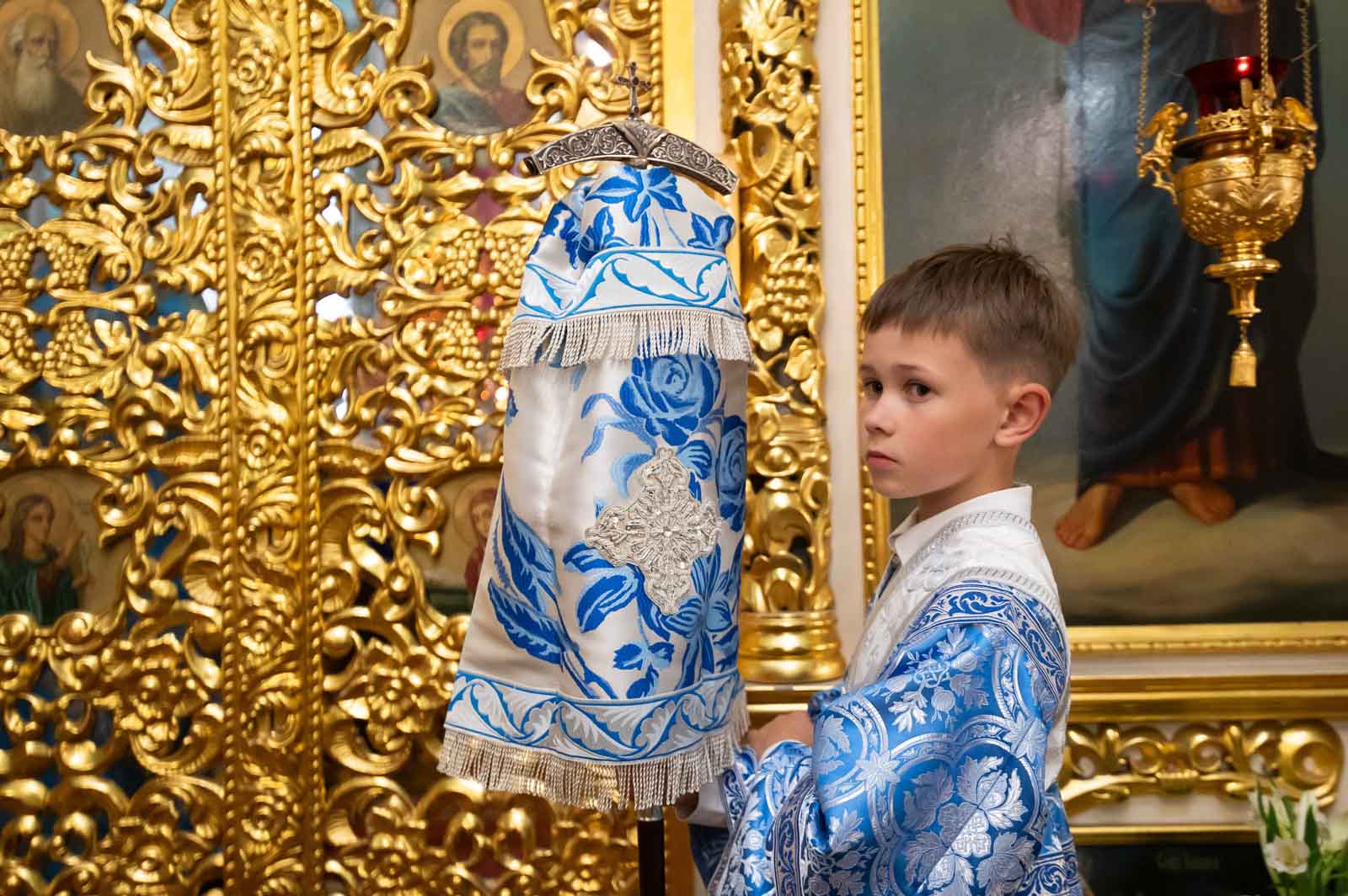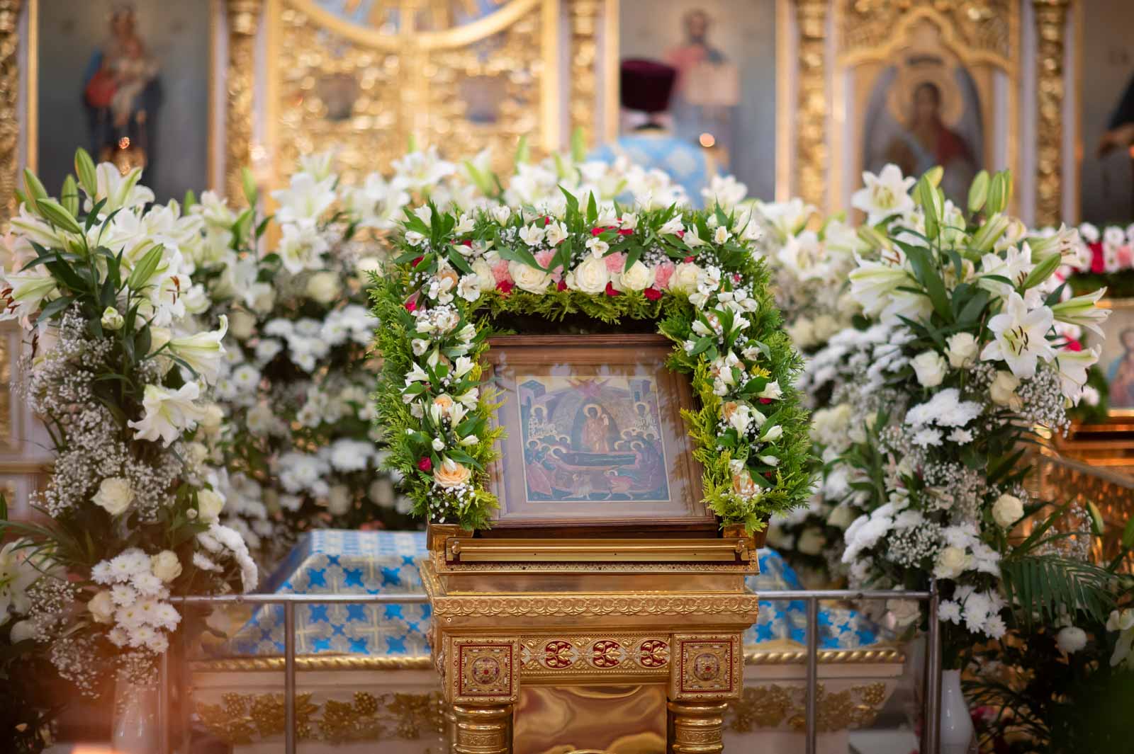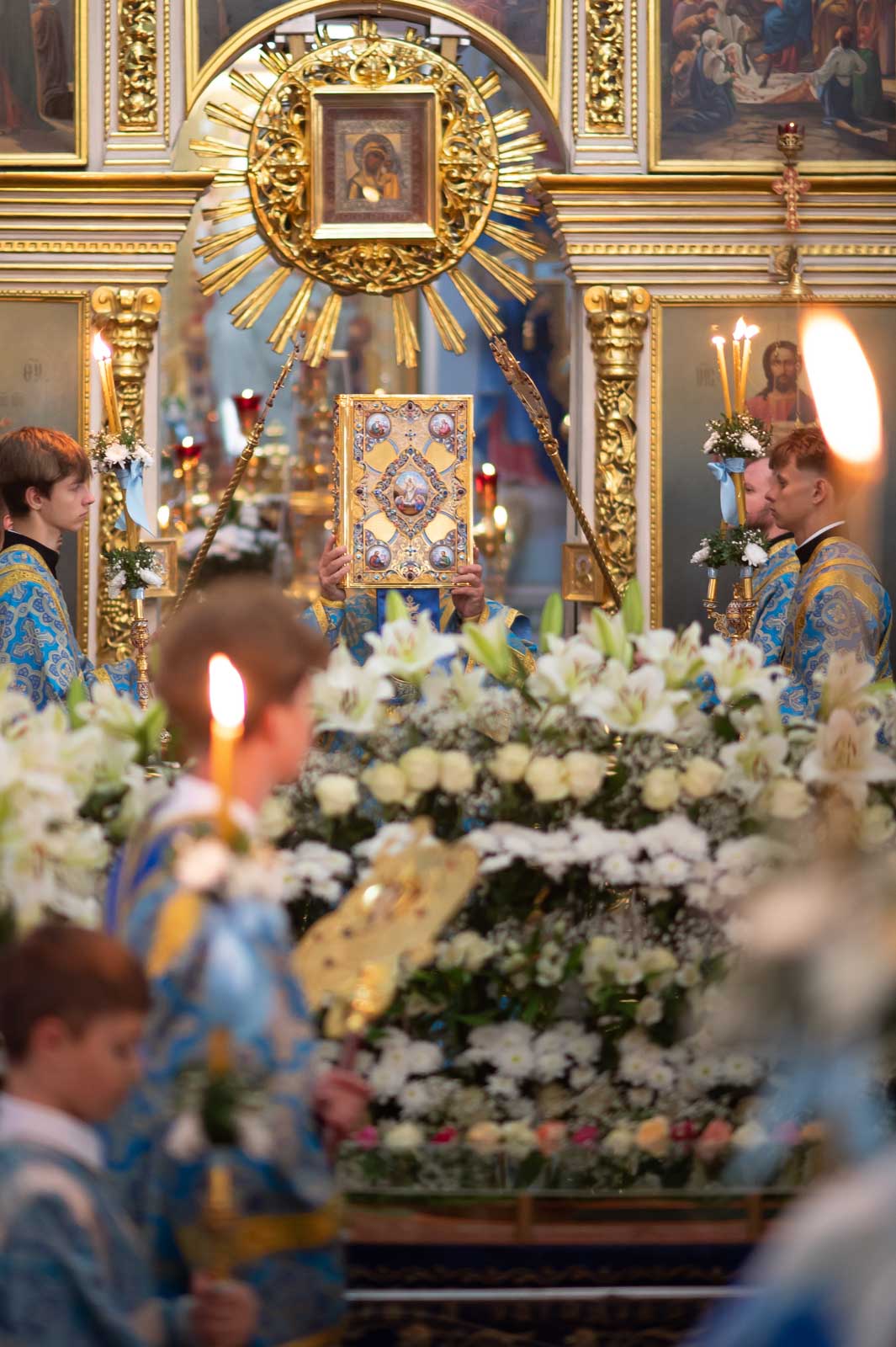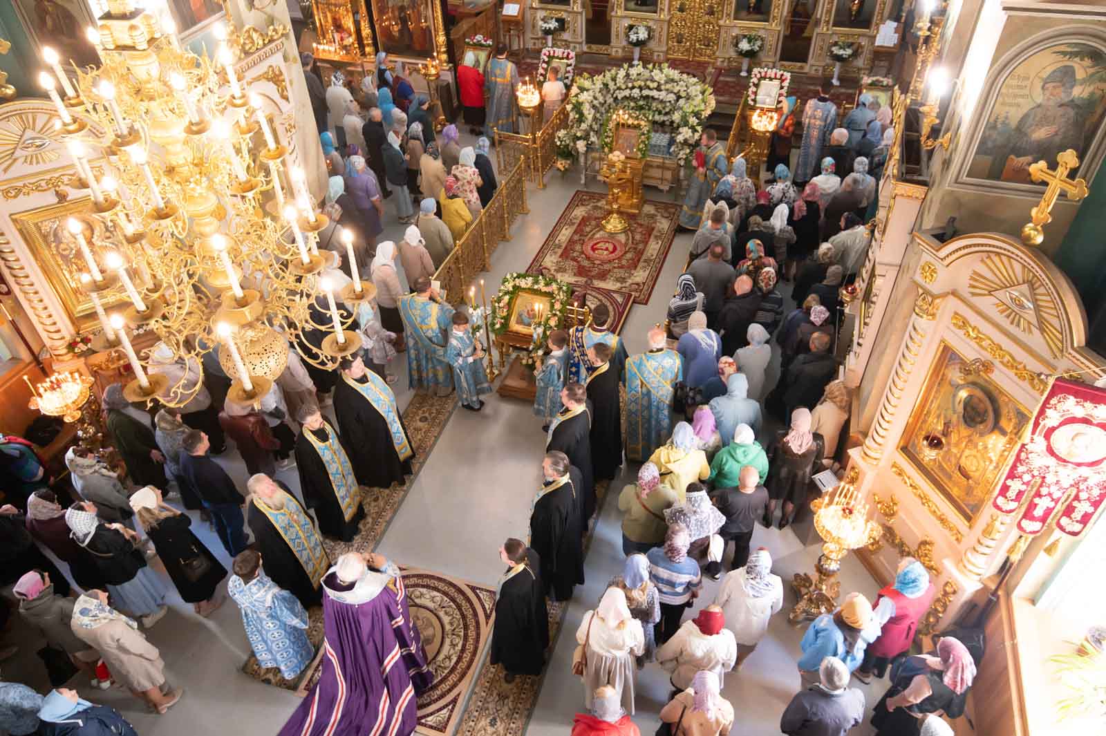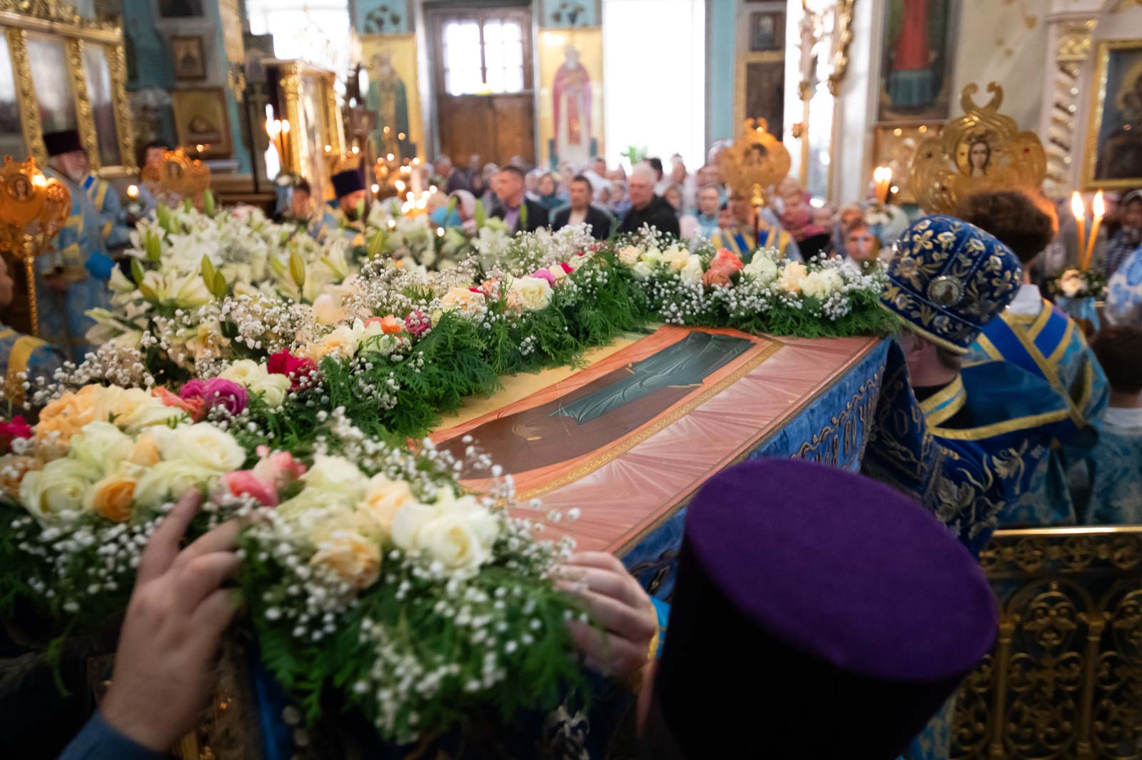 За богослужением из алтаря на середину храма была вынесена Плащаница Богородицы для поклонения верующих. Плащаница представляет собой особую вышитую икону праздника Успения Богородицы.