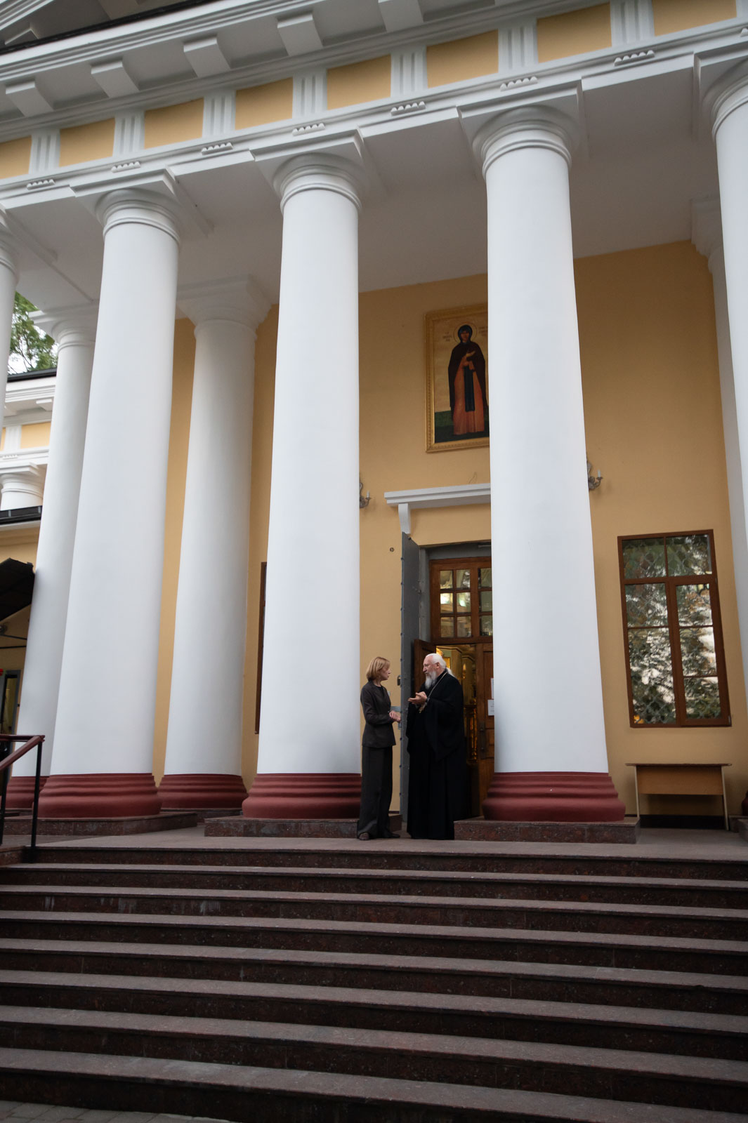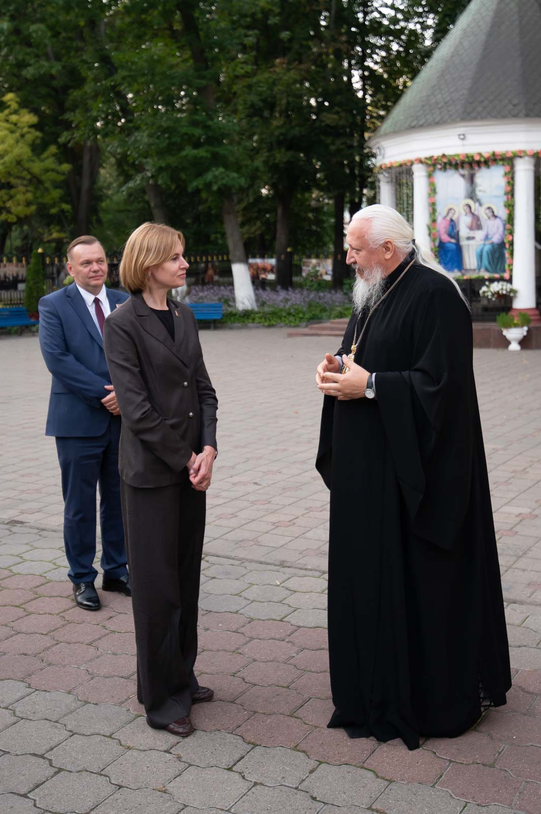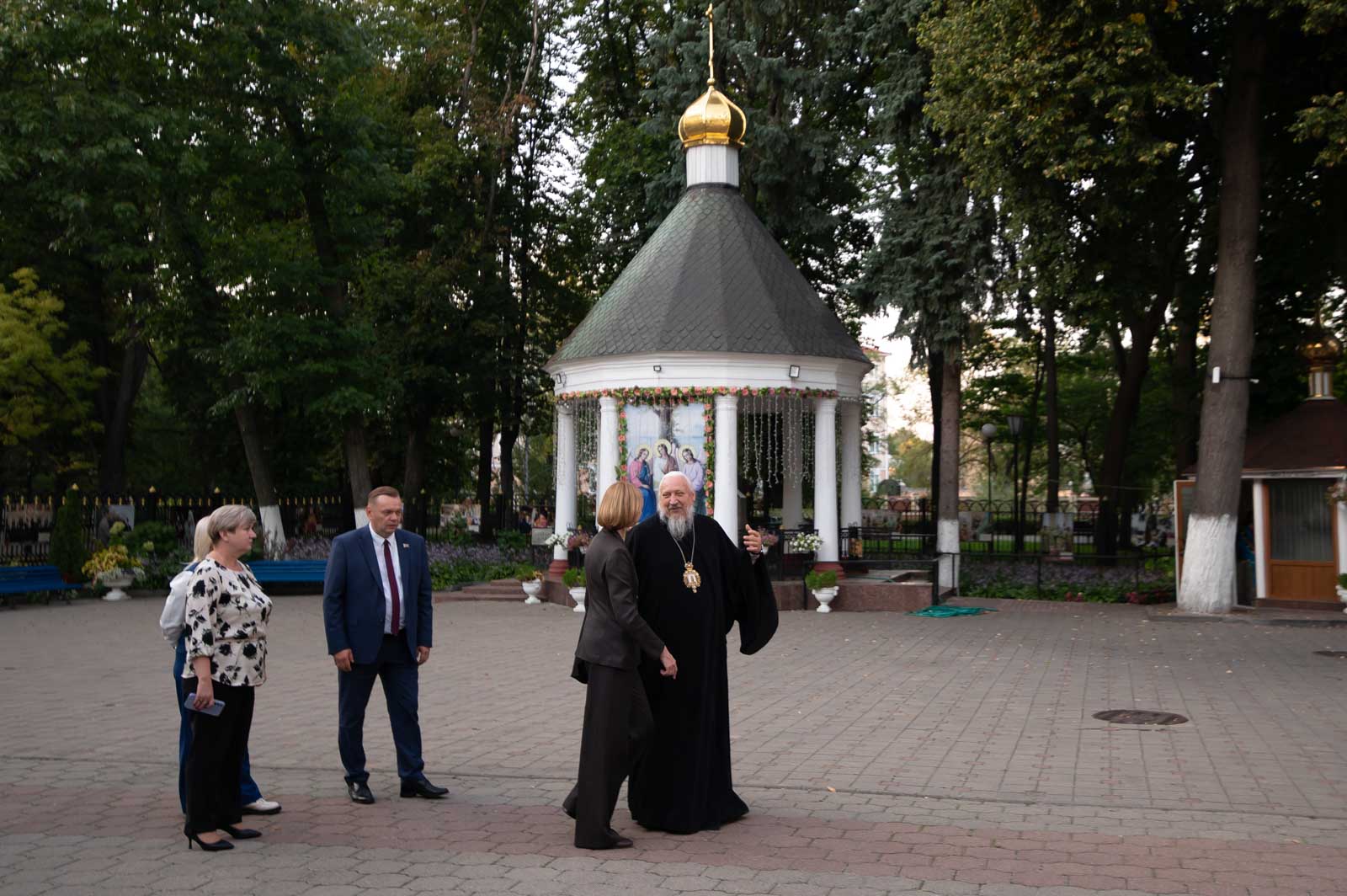 Архипастырь рассказал об истории собора и его святынях. Высокие гости узнали о преподобной Манефе Гомельской, чьи мощи пребывают в храме, подошли к памятнику священномученика Митрофана (Краснопольского), первого епископа Гомельского, а также ознакомились с экспозицией, посвящённой православным церквям, существовавшим в Гомеле в разные периоды.