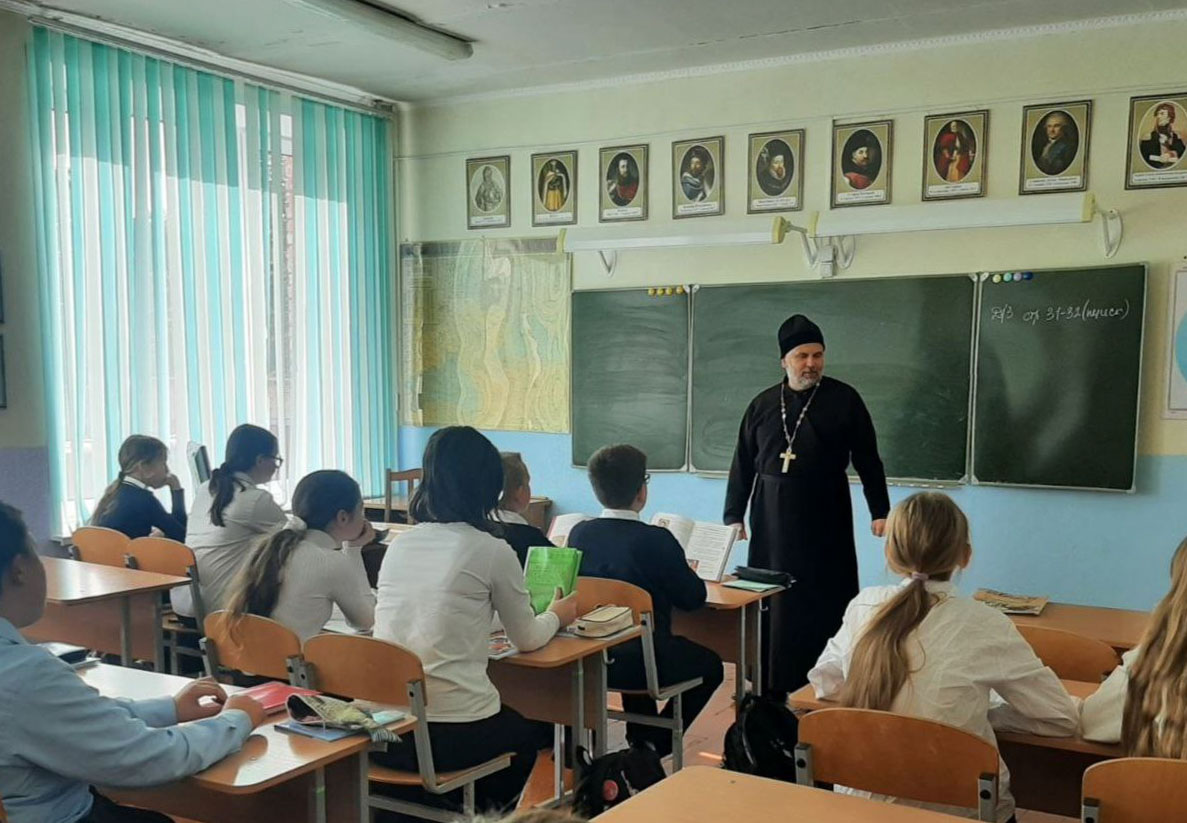С учащимися 5–7 классов отец Виталий провёл духовную беседу, посвященную празднику Воздвижения Честного и Животворящего Креста Господня. Священник рассказал школьникам об истории обретения Креста, раскрыл его глубокий духовный смысл и объяснил, почему орудие позорной казни стало для христиан символом победы над смертью и грехом, источником радости и спасения.