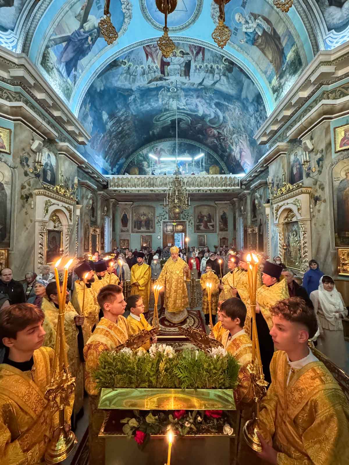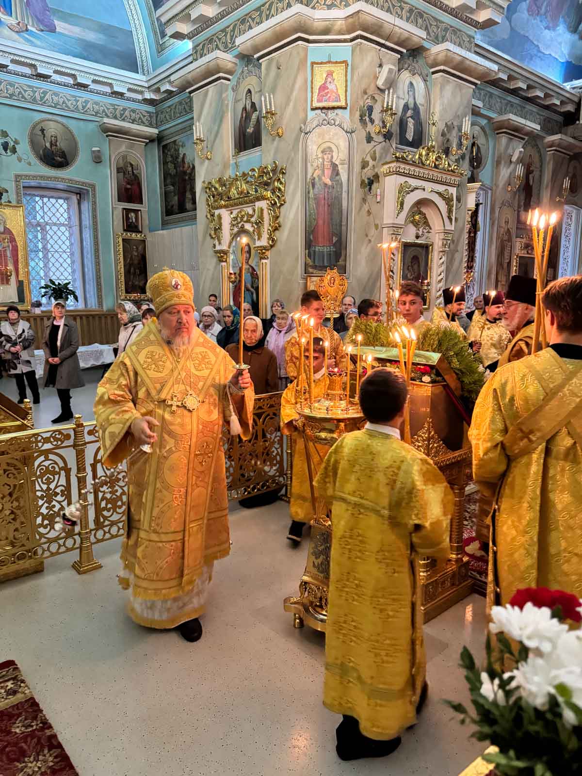 За богослужением архипастырю сослужили секретарь Гомельской епархии протоиерей Георгий Алампиев и клирики кафедрального собора.