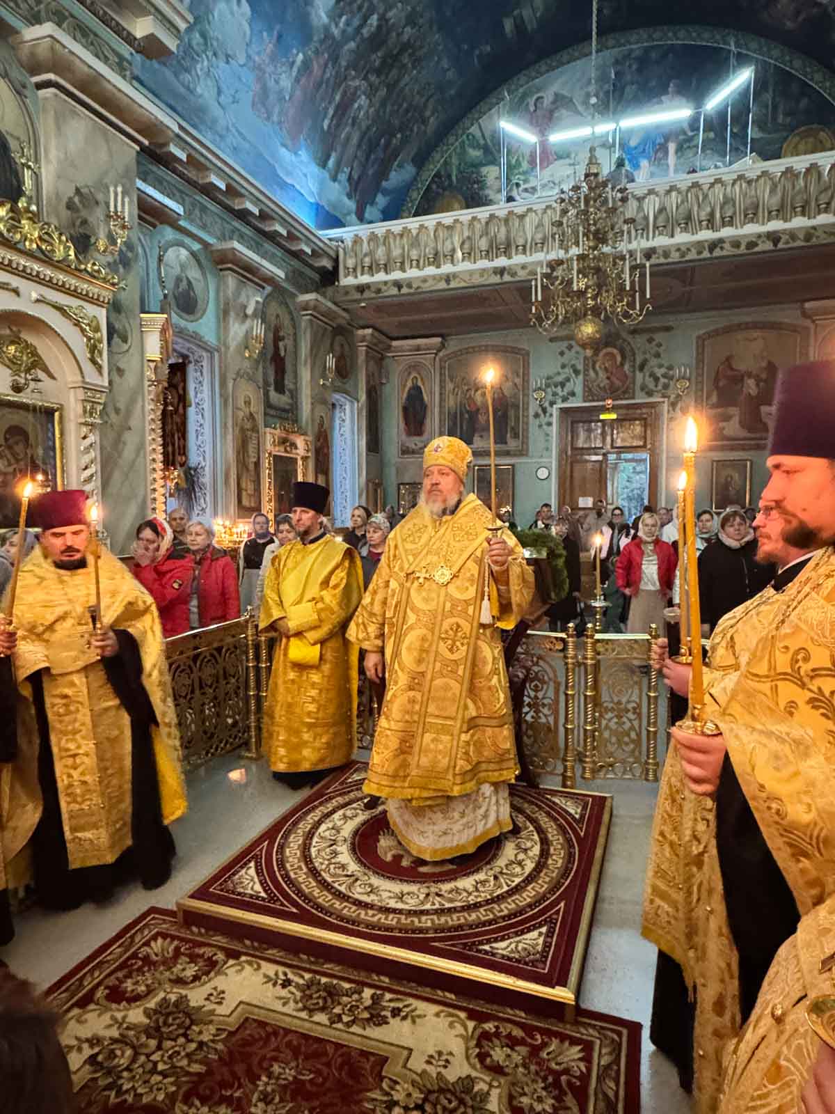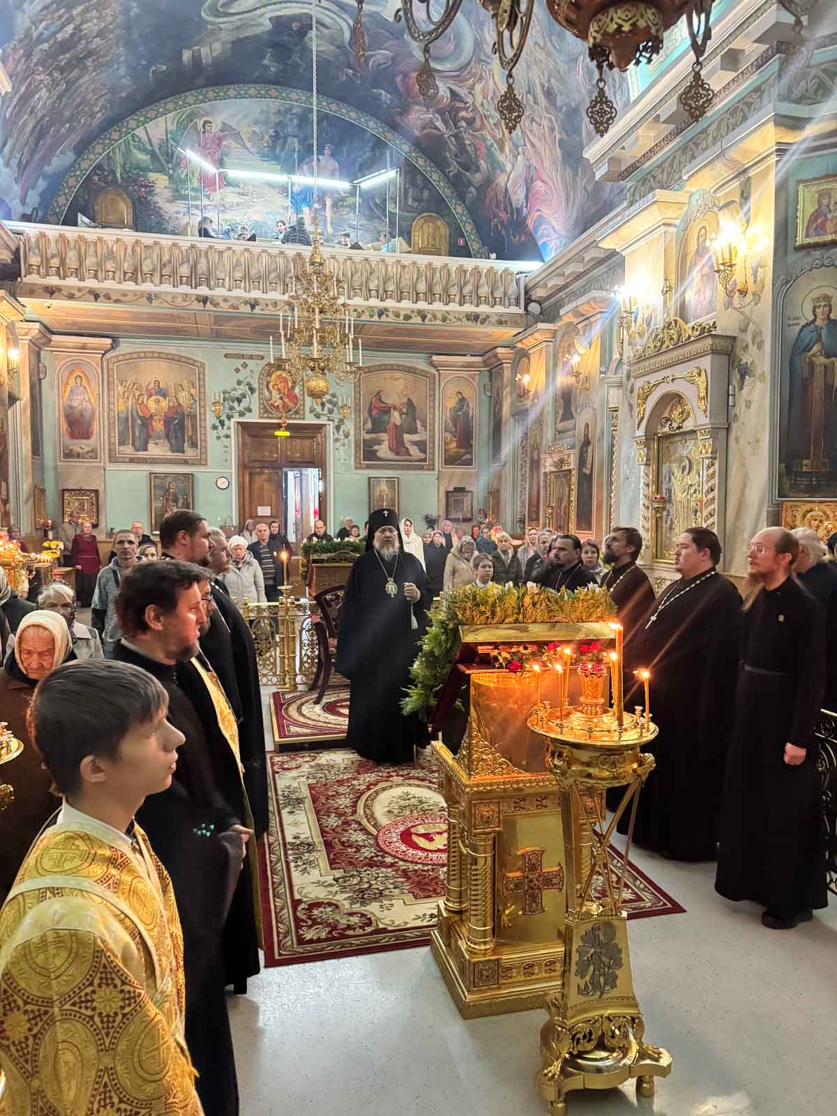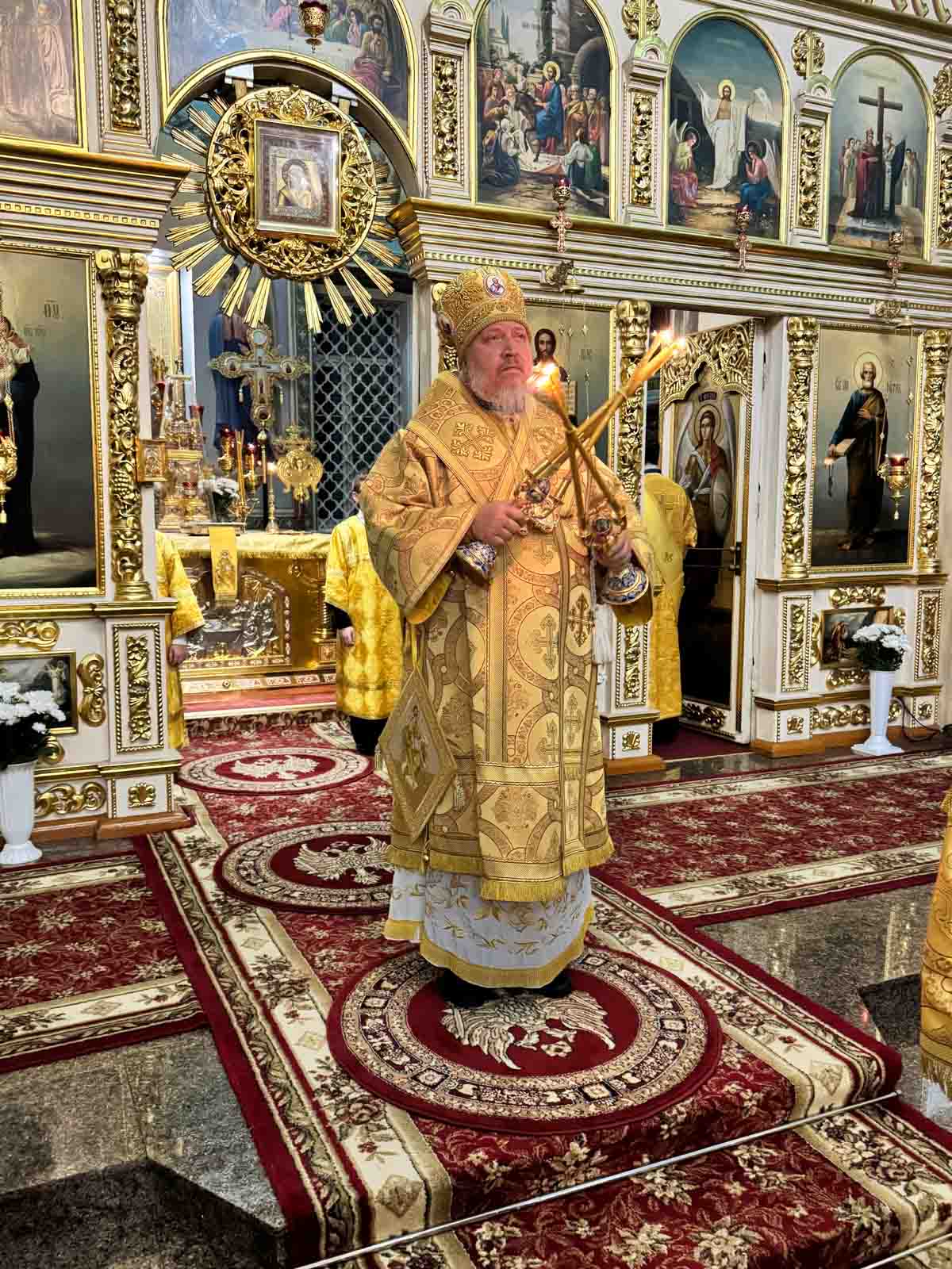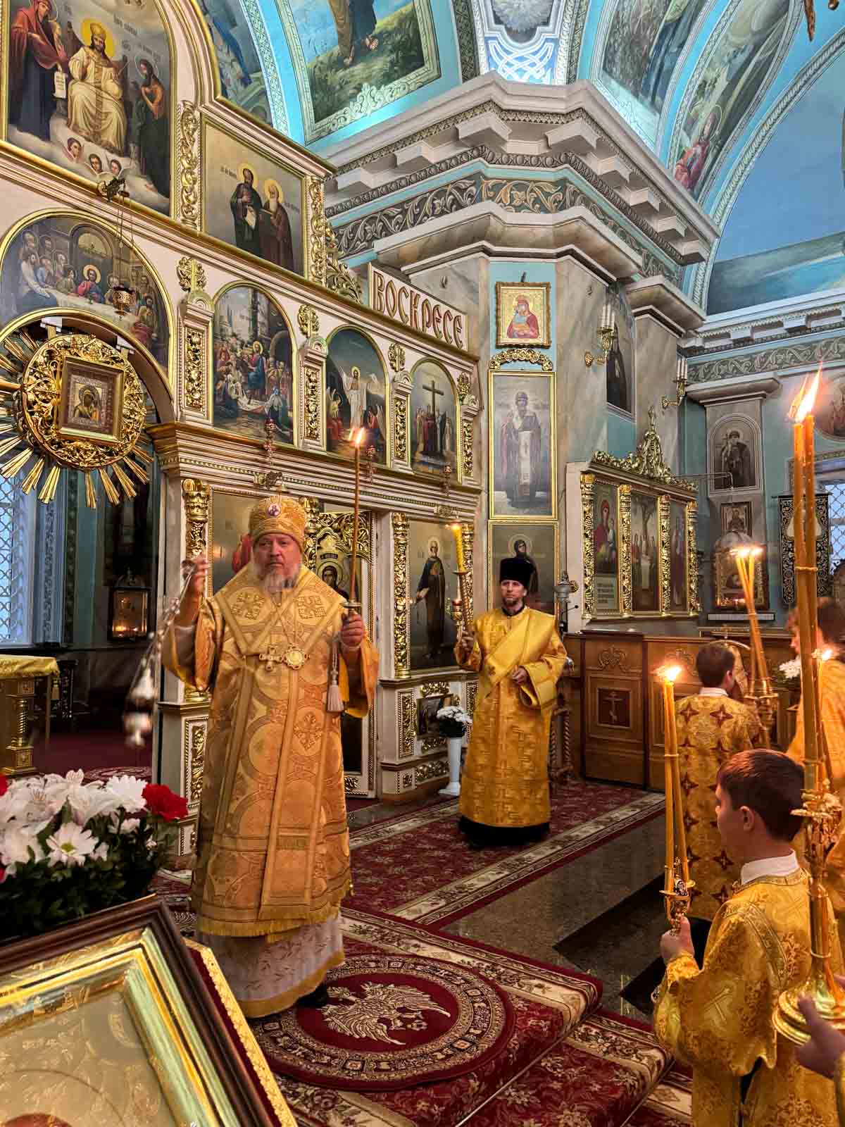 Всенощное бдение 4 октября 2025 года, в канун Недели 17-й по Пятидесятнице, Высокопреосвященнейший Стефан, архиепископ Гомельский и Жлобинский, совершил в Петро-Павловском кафедральном соборе города Гомеля.