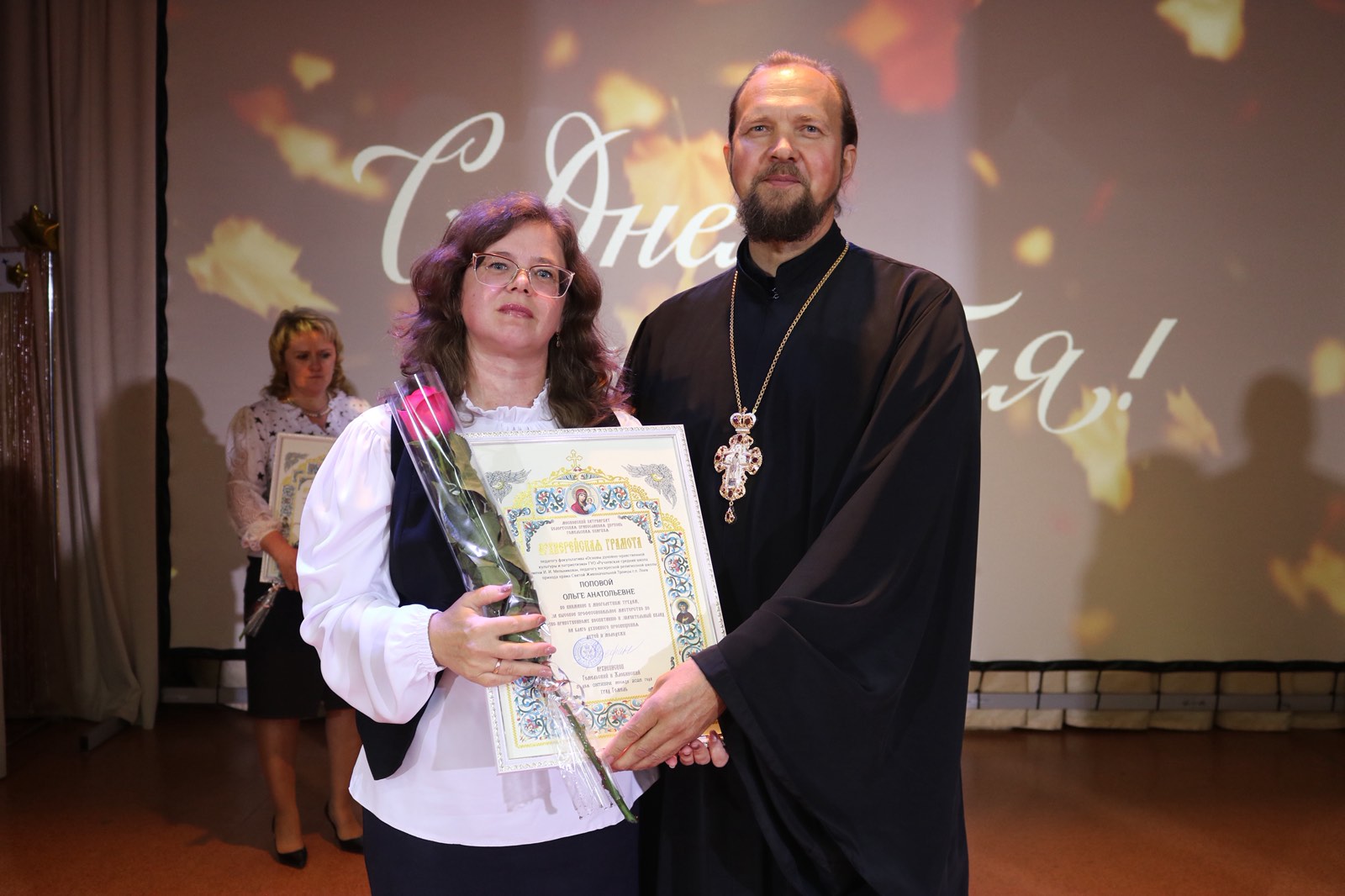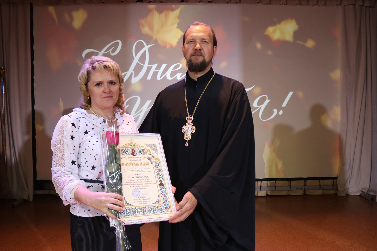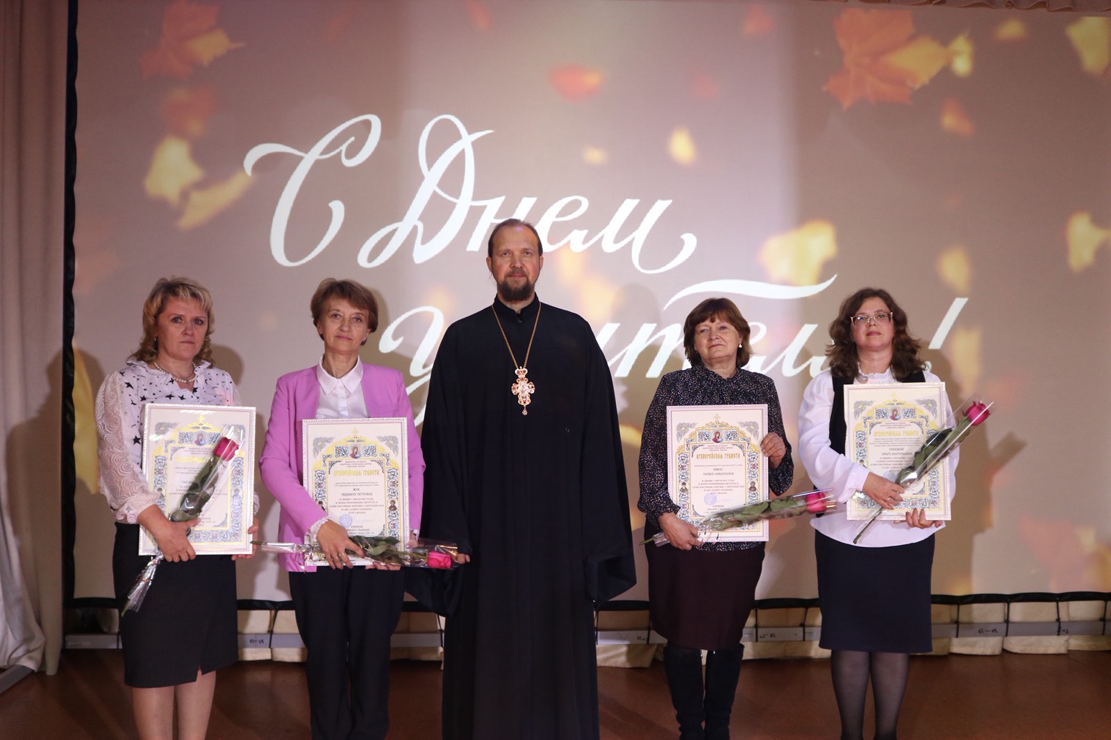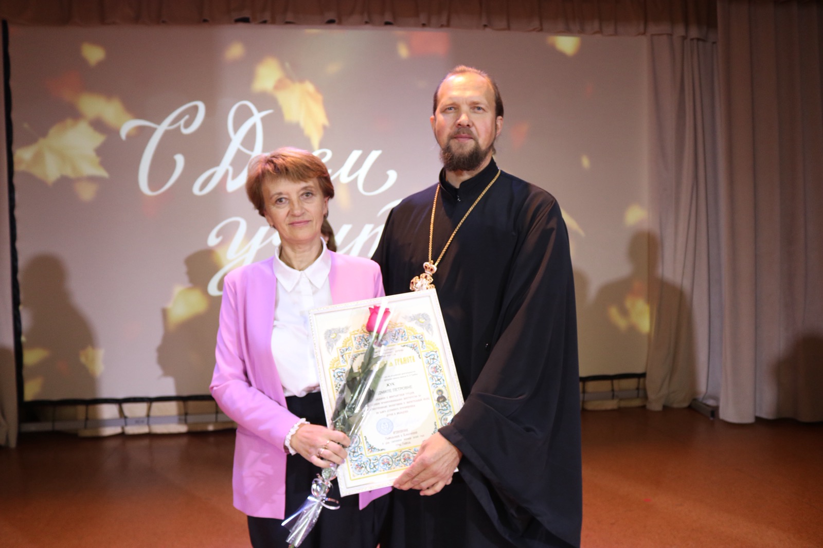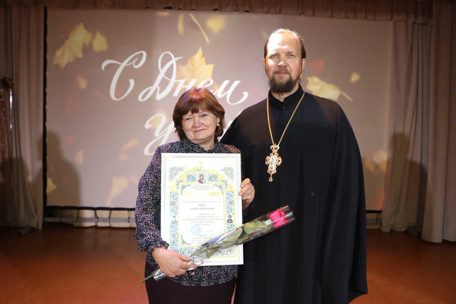 Благочинный церквей Лоевского округа иерей Димитрий Чварков принял участие в торжественном мероприятии, посвященном Дню Учителя. В благодарность за понесенные труды в направлении духовно-нравственного воспитания подрастающего поколения Архиерейскими грамотами были награждены Пикус Лариса Николаевна, музыкальный руководитель ГУО «Детский сад №1 г.п.Лоев», Жук Людмила Петровна, заместитель директора по основной деятельности ГУО «Бывальковская СШ им. К.П.Гриба», Пикас Оксана Григорьевна, педагог факультатива «Основы духовно-нравственной культуры и патриотизма» ГУО «Бывальковская СШ им. К.П.Гриба», Попова Ольга Анатольевна, педагог Воскресной религиозной школы прихода храма Святой Живоначальной Троицы г.п.Лоев.