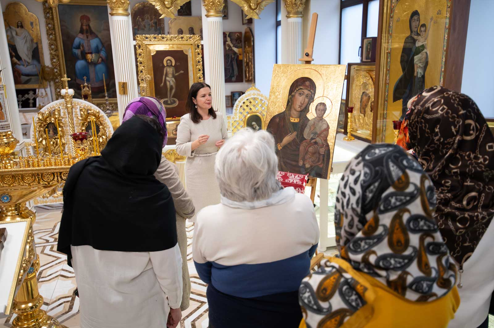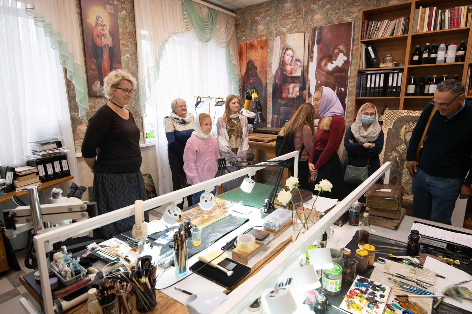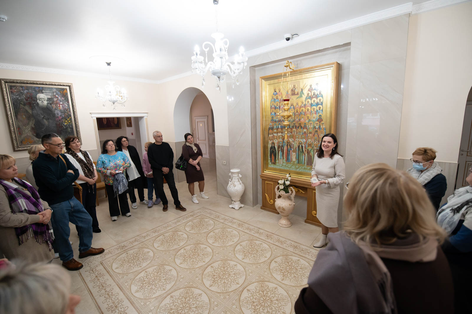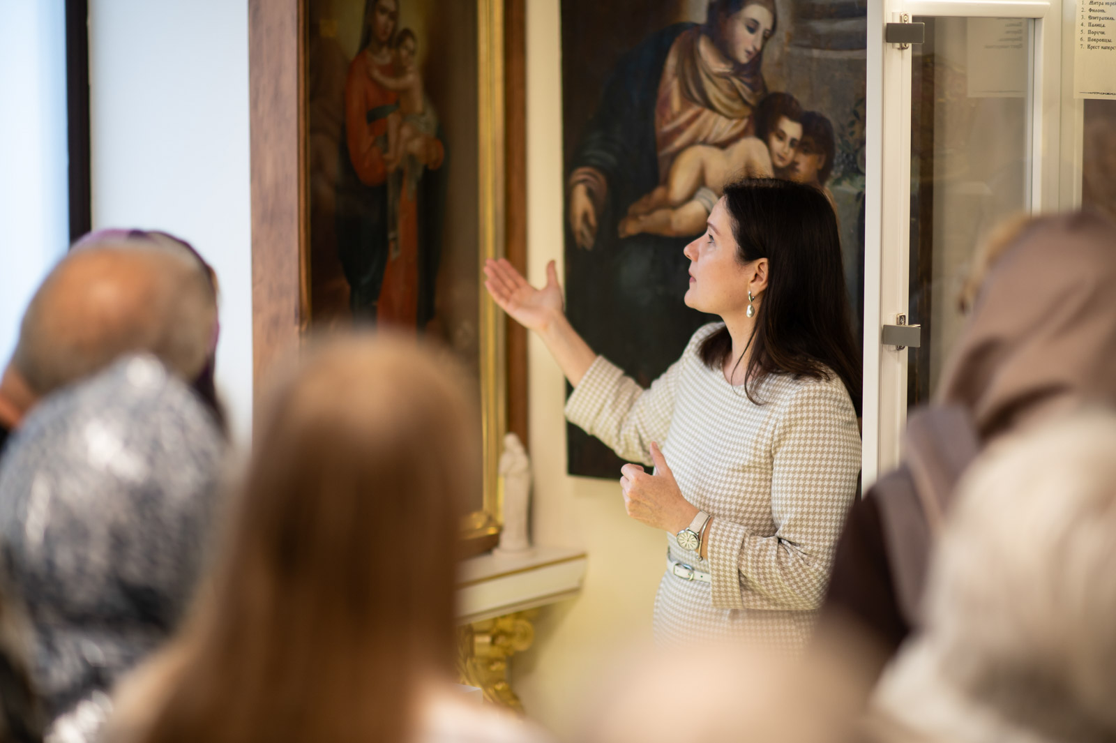Для представителей учреждений культуры г. Гомеля была проведена экскурсия по домовому храму-музею в честь Собора всех Белорусских Святых при Гомельском епархиальном управлении, в рамках которой гости познакомились с работой реставрационной мастерской.