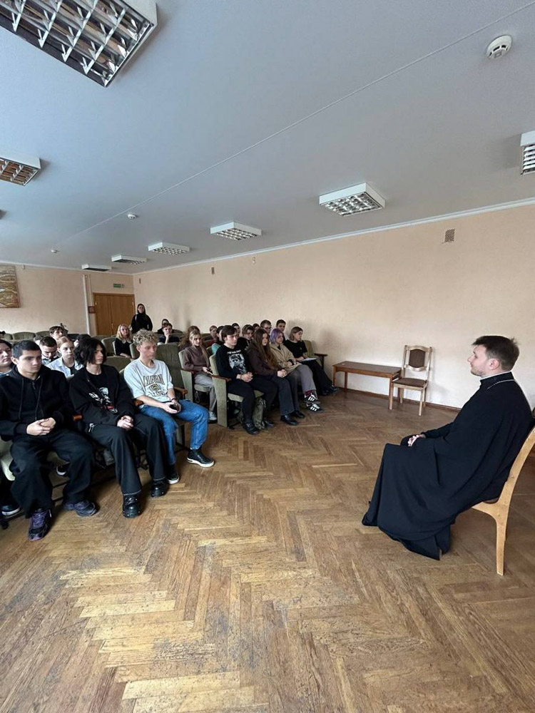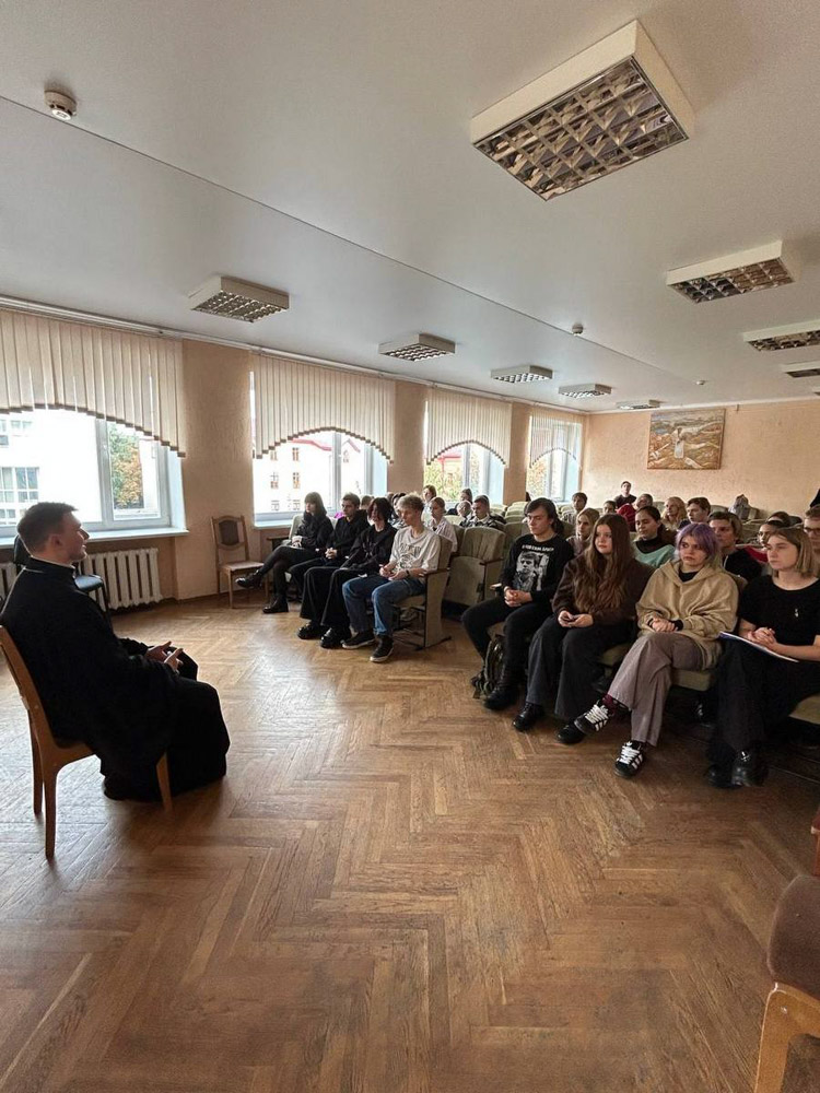 16 октября 2025 года в Гомельском государственном колледже искусств имени Н.Ф. Соколовского состоялась встреча с клириком прихода Петро-Павловского кафедрального собора иереем Андреем Киселем, который побеседовал с учащейся молодежью о семье, семейных ценностях и взаимоотношениях поколений.