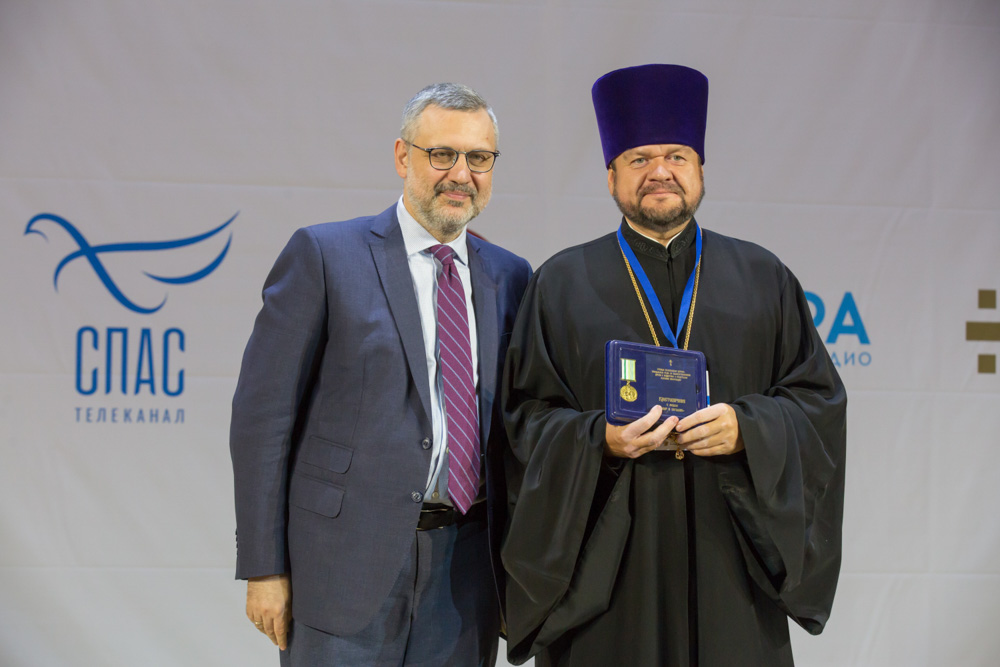 В рамках открытия форума председатель Информационного отдела Гомельской епархии протоиерей Олег Кострома был удостоен медали «Мир и согласие» Синодального отдела по взаимоотношению Церкви с обществом и средствами массовой информации. Награду вручил Владимир Романович Легойда.