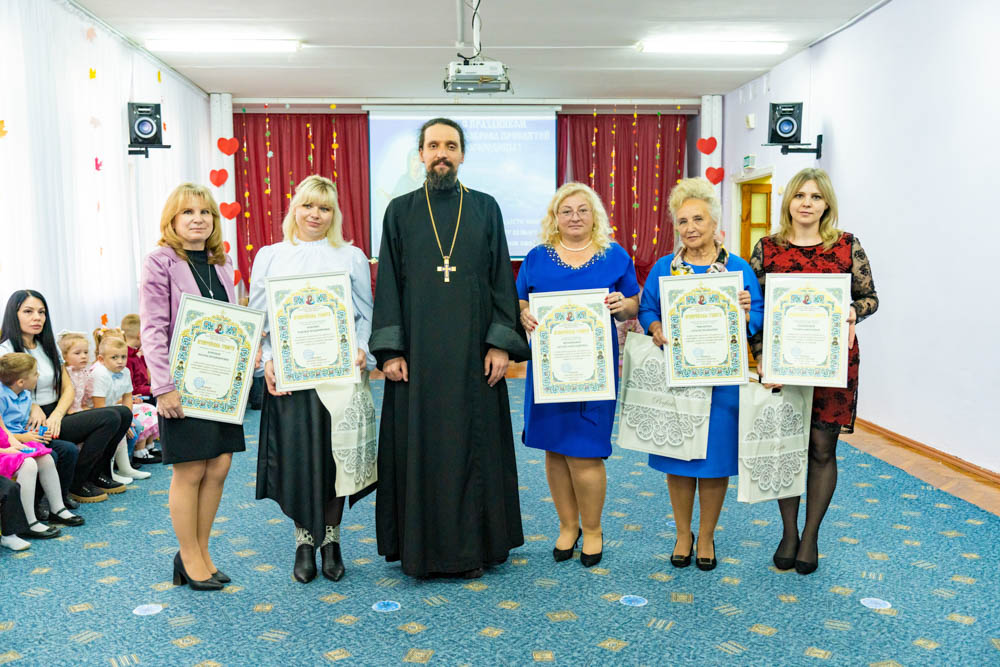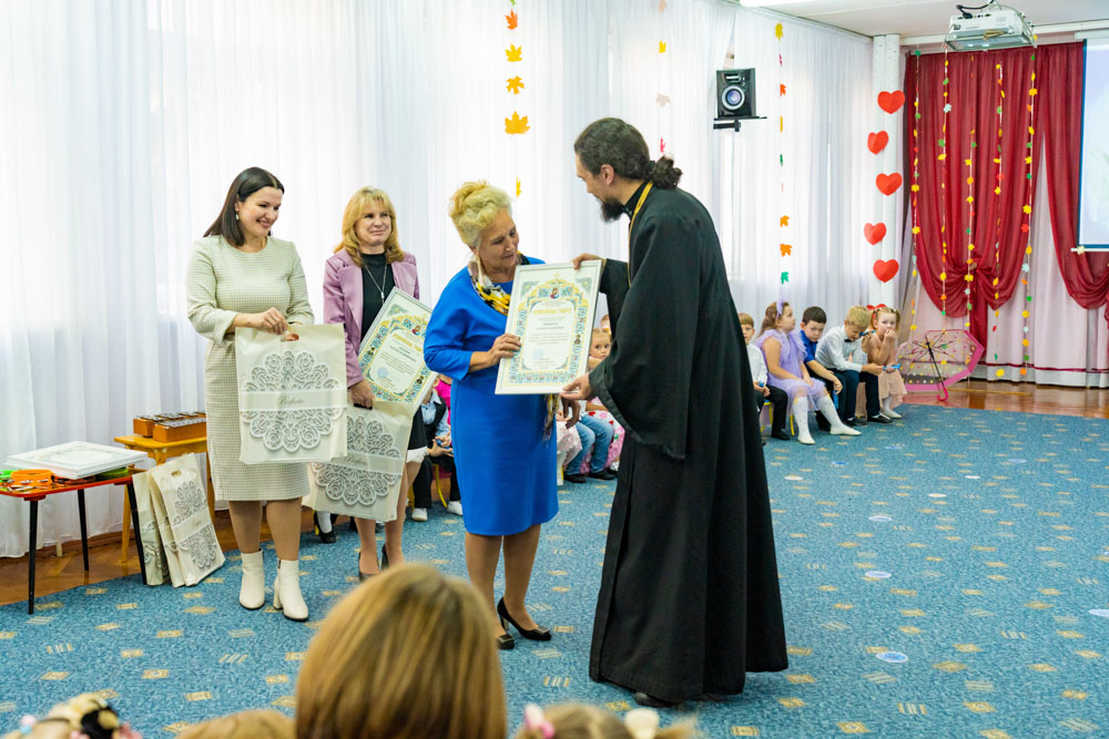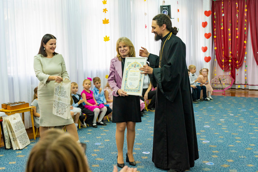 В завершение праздника игумен Феодорит по благословению архиепископа Гомельского и Жлобинского Стефана вручил Архиерейские грамоты сотрудникам детского сада, а дети получили сладкие подарки.