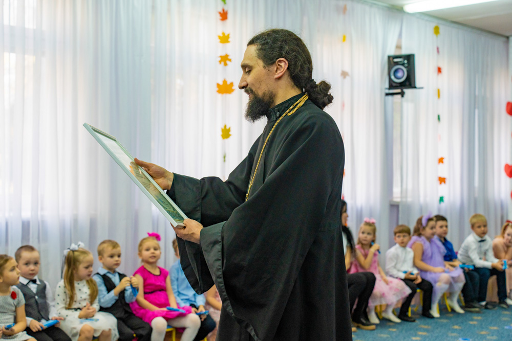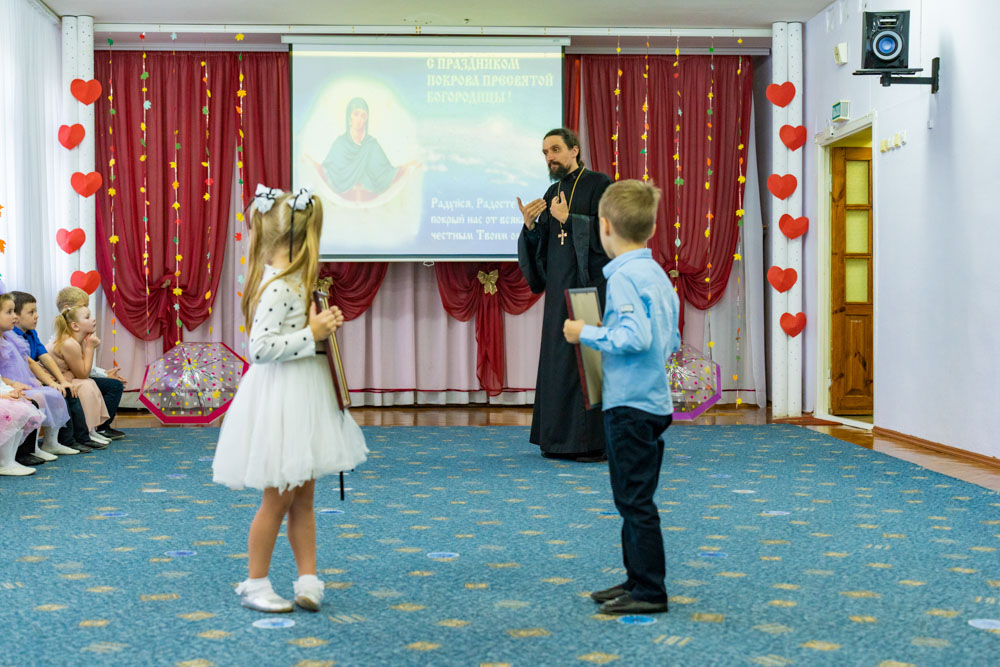 Игумен Феодорит поздравил всех с праздником и рассказал детям и родителям об удивительном событии – как много веков назад во время службы в храме молящиеся увидели Пресвятую Богородицу, Которая распростерла над ними свой амофор. С тех пор существует праздник Покрова Божией Матери.
