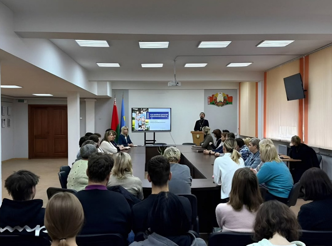 16 октября, в единый день информирования, отец Александр выступил перед студентами Гомельского государственного колледжа торговли и услуг. Он говорил о вечной ценности семьи, её роли в формировании счастливого будущего, о важности любви, уважения и взаимопонимания между родными, а также о передаче этих ценностей следующим поколениям.
