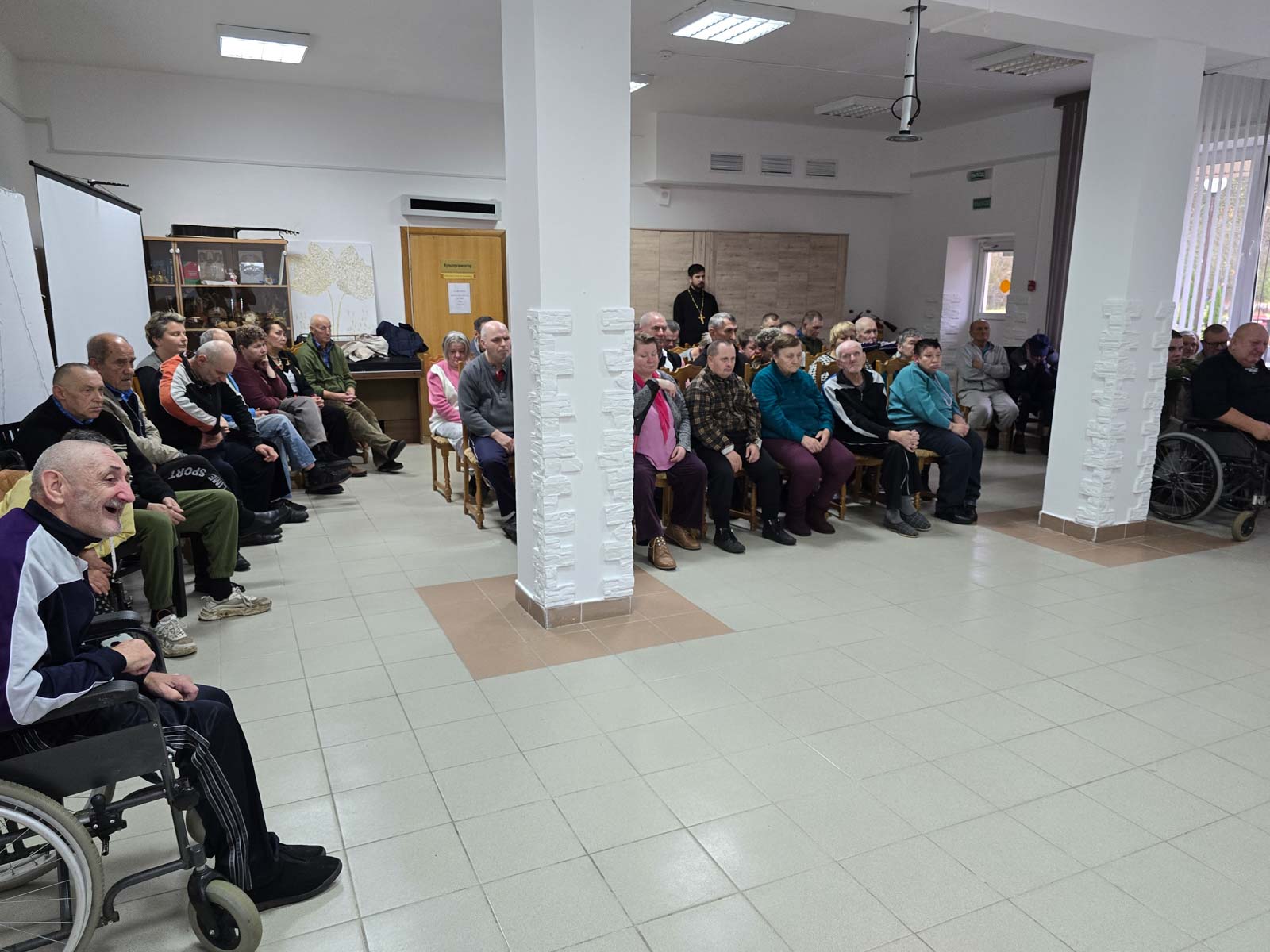Настоятель прихода иерей Павел Перещук обратился к подопечным и сотрудникам пансионата с приветствием, напомнив о надежде и радости, которую нам дарит Господь, Его Пречистая Матерь и святые угодники.