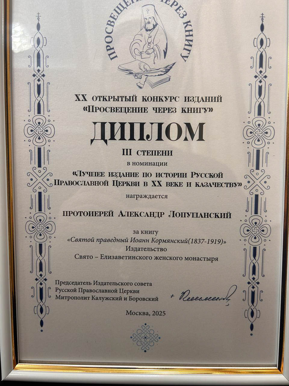 В числе награждённых — протоиерей Александр Лопушанский, председатель комиссии по канонизации святых Гомельской епархии. Его книга «Святой праведный Иоанн Кормянский (1837–1919)», выпущенная Издательством Свято-Елисаветинского женского монастыря, заняла третье место в номинации «Лучшее издание по истории Русской Православной Церкви в ХХ веке и казачеству».