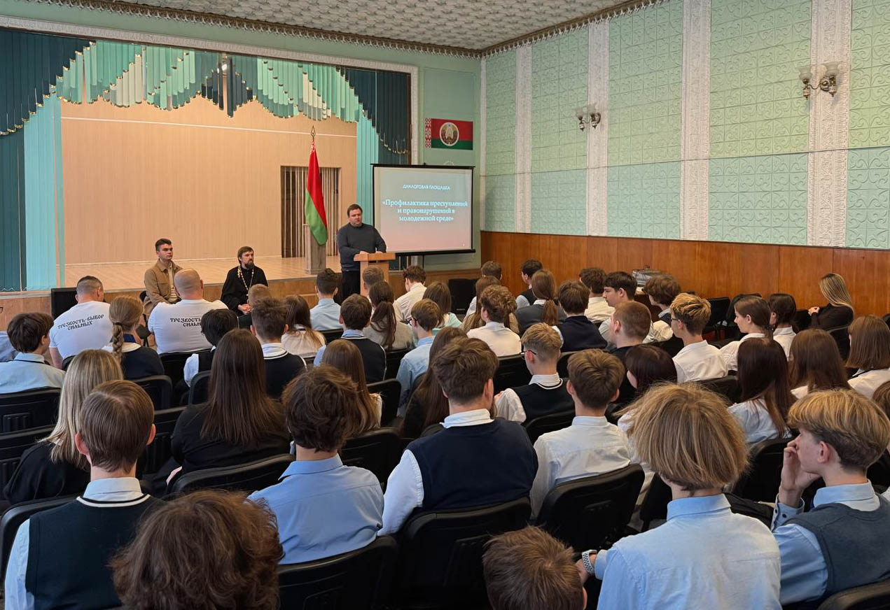По благословению Высокопреосвященнейшего Стефана, архиепископа Гомельского и Жлобинского, в мероприятии приняли участие представители отдела по социальному служению и церковной благотворительности. Иерей Александр Гришаненко, координатор по работе с алкоголе- и наркозависимыми людьми, обратился к учащимся с выступлением о значении духовно-нравственного воспитания в формировании здоровой личности. Священник подчеркнул, что нравственные и духовные основы являются фундаментом полноценного развития человека, и обратил внимание молодежи на важность ответственного отношения к своей жизни, ведь именно от поступков в юности зависит будущее каждого.