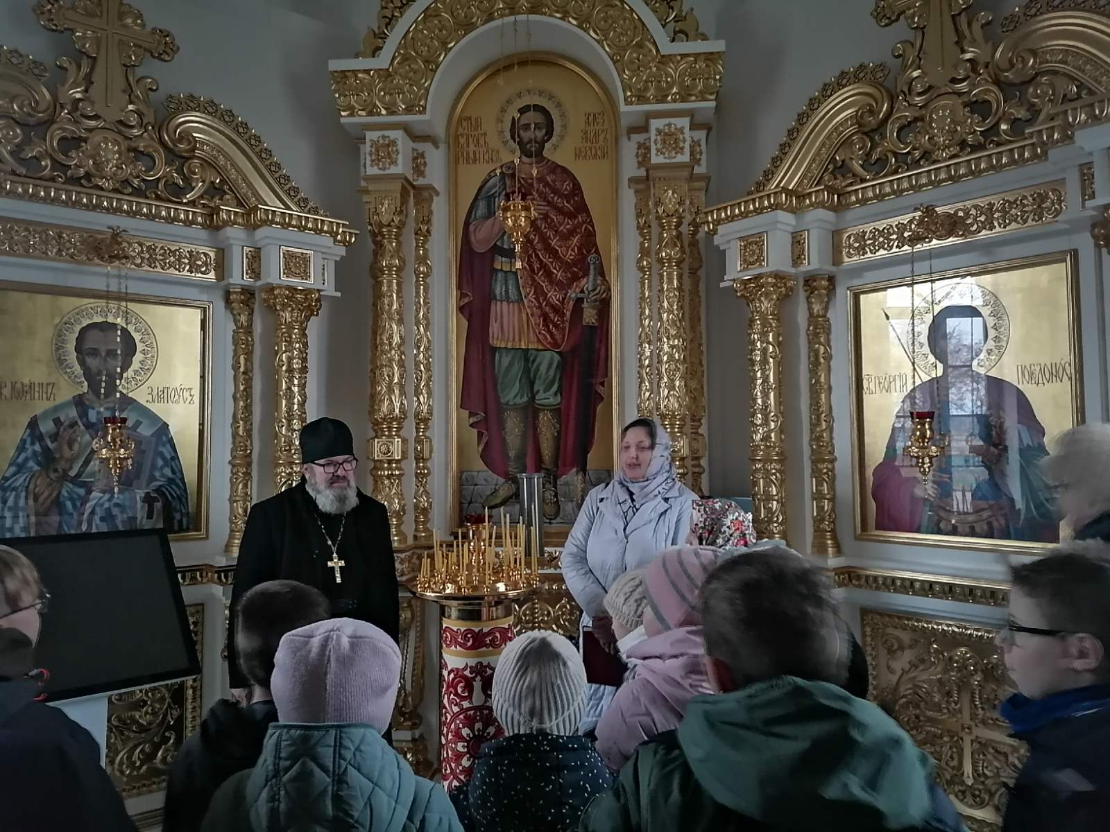 Ребята познакомились с историей святынь, узнали смысл и авторство надписей на фасаде часовни.