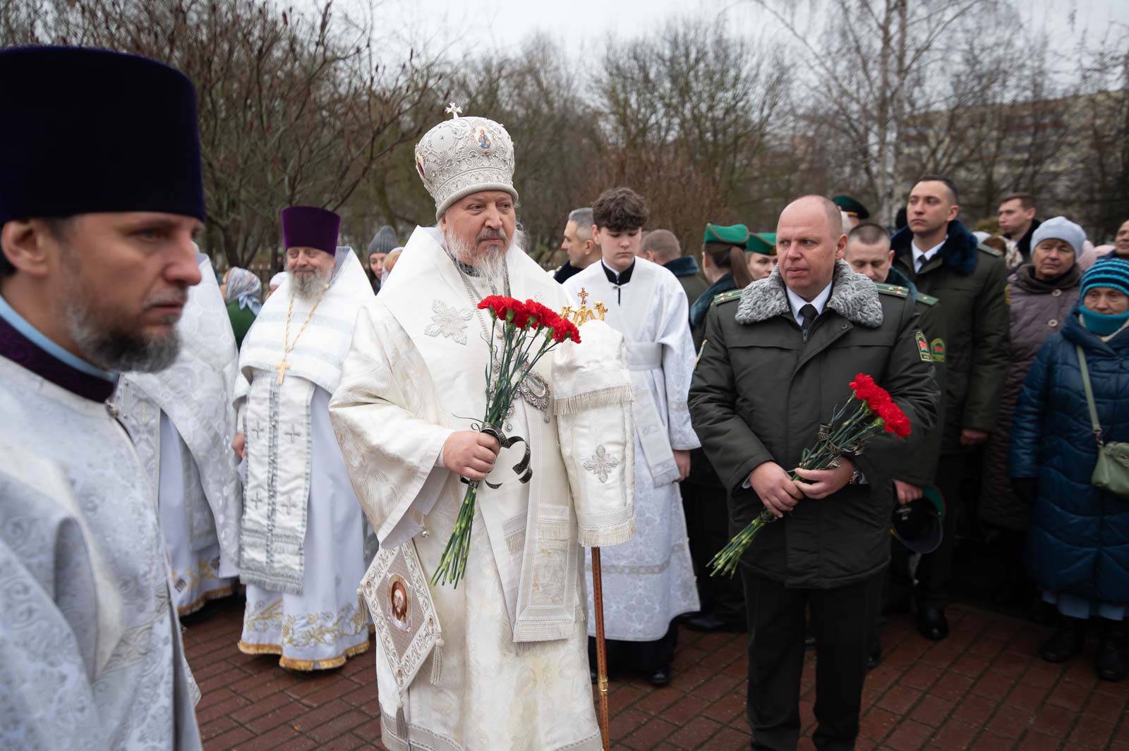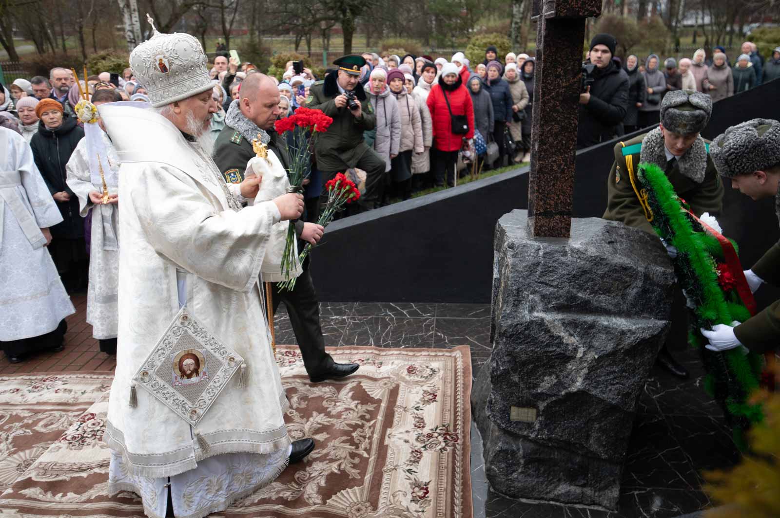 По завершении богослужения состоялся крестный ход, после чего у Поклонного креста, установленного в память о героях-пограничниках, были возложены венки и цветы.