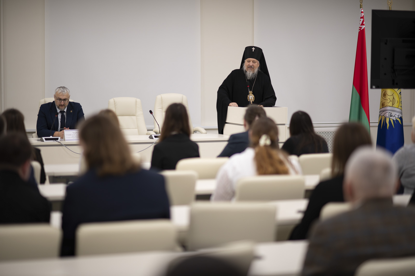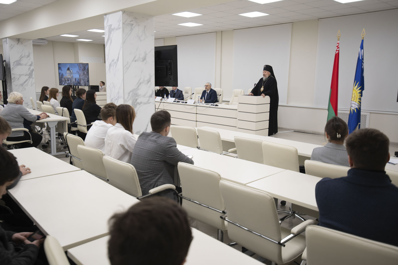 Открыл конференцию архиепископ Гомельский и Жлобинский Стефан. Обращаясь к студентам, владыка подчеркнул: «Будущее нашей страны будет складываться из того, как вы будете обучаться, как построите семейную жизнь — свою “малую церковь”, как будете отдавать себя на благо общества и государства. Хотелось бы, чтобы вы научились отличать хорошее от плохого, чтобы научились не лгать, себе в первую очередь, так как чем больше мы будем лгать, тем дальше уйдём от правды».