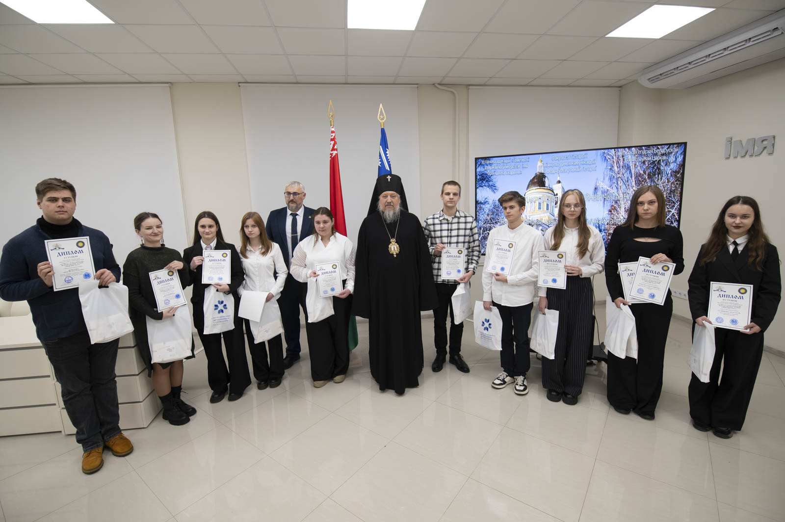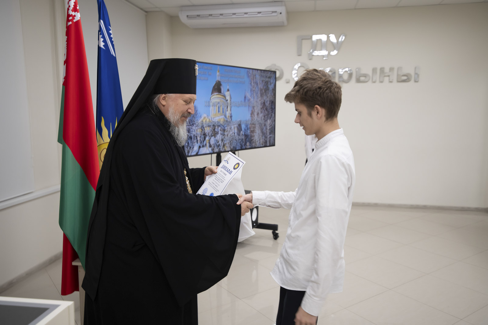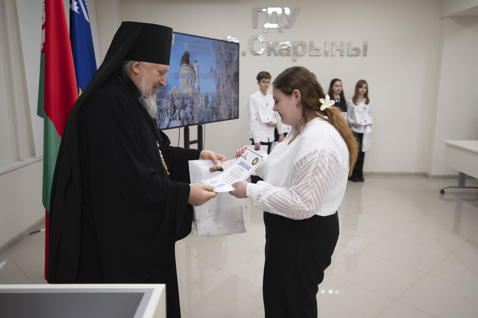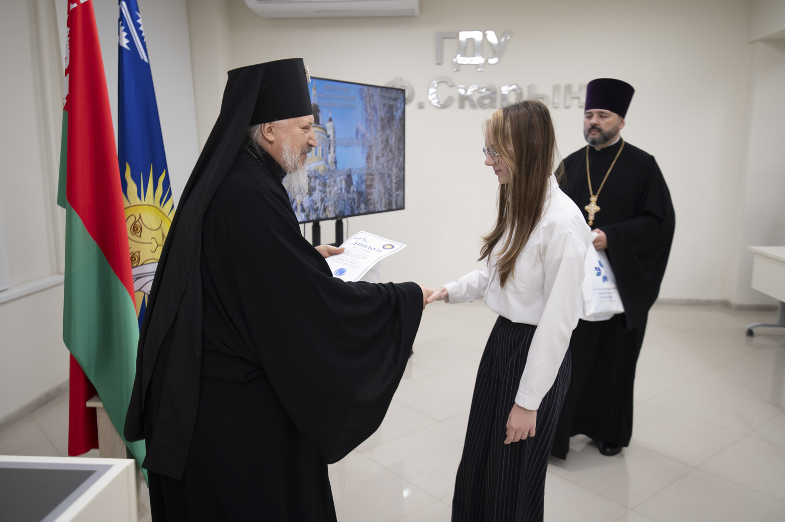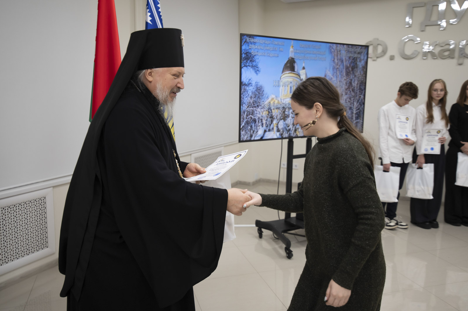 После приветственных слов владыка Стефан вручил дипломы и подарки учащимся 9-11 классов, победителям конкурса на лучшую презентацию, посвященную истории религии, конфессиональной жизни и культуры на территории современной Гомельщины, прошедшего на базе исторического факультета ГГУ имени Ф. Скорины.