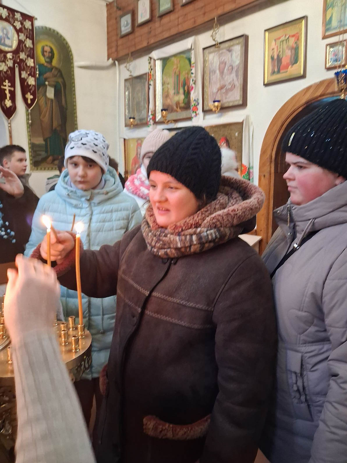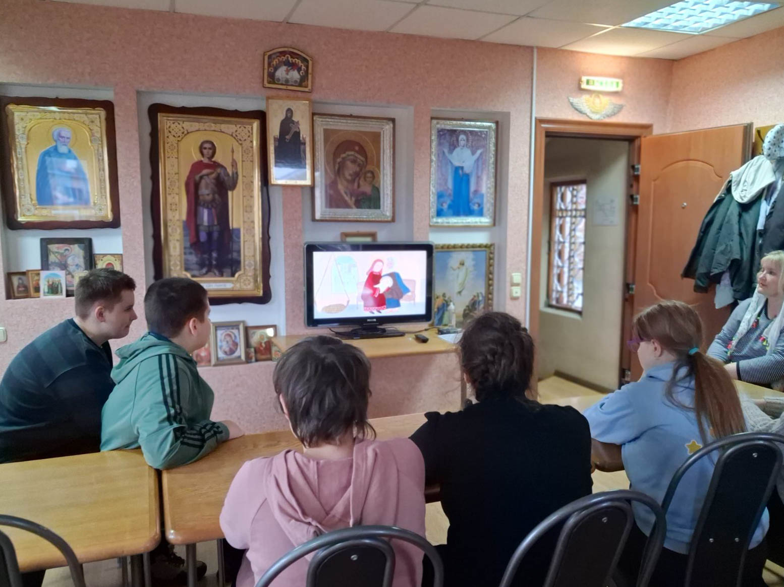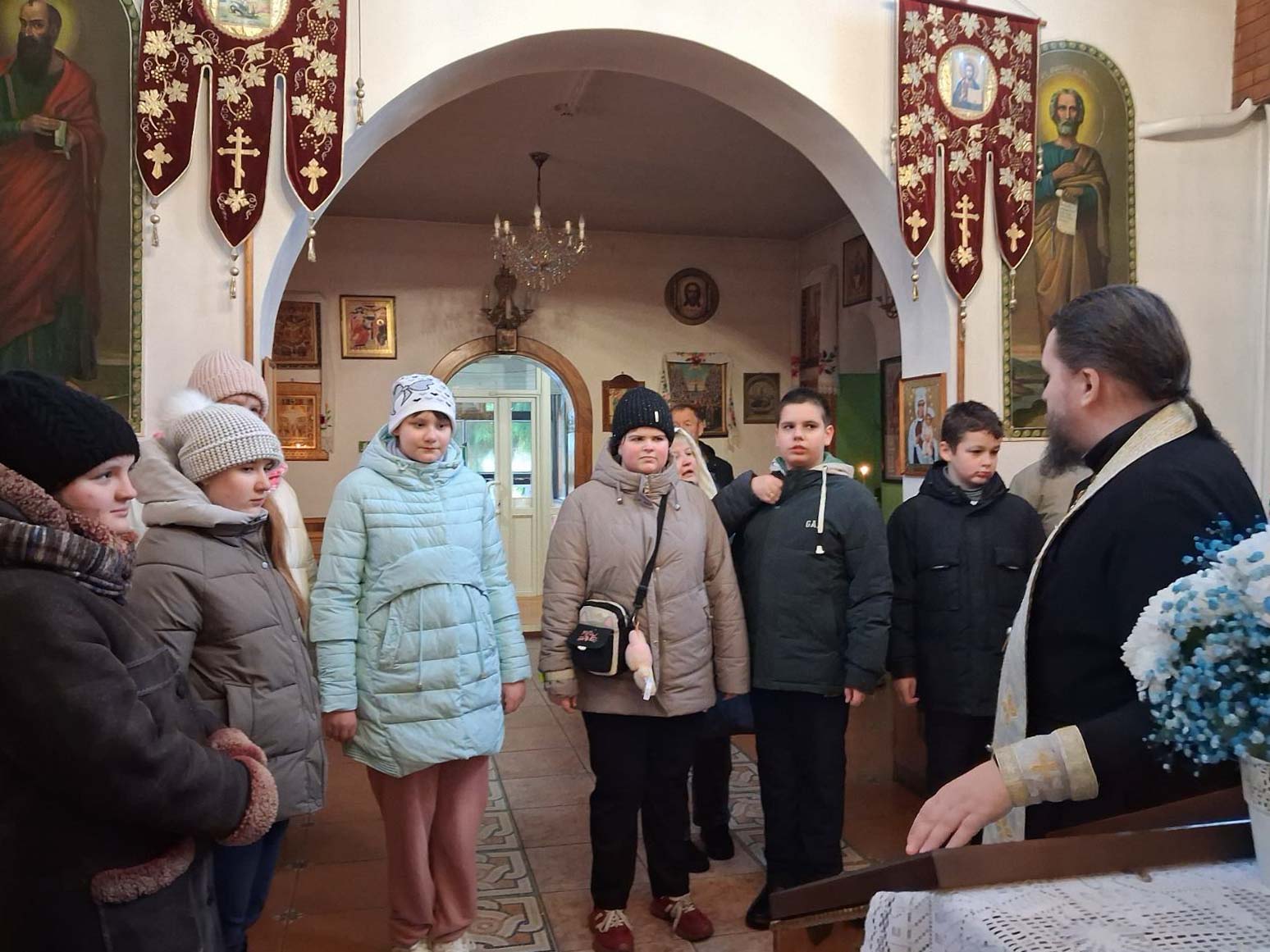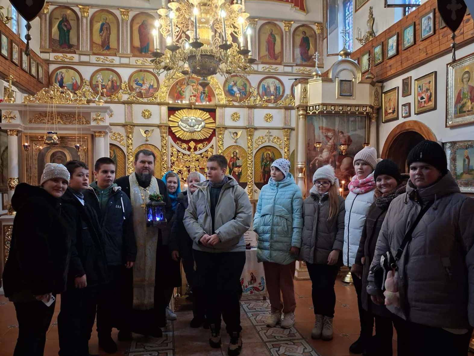 В храме гостей тепло встретил иерей Димитрий, который рассказал детям о празднике Введения во храм Пресвятой Богородицы, провёл экскурсию, а также вместе с ребятами посмотрел мультфильм о жизни Богородицы. В завершение для школьников был организован сладкий стол и вручены подарки.