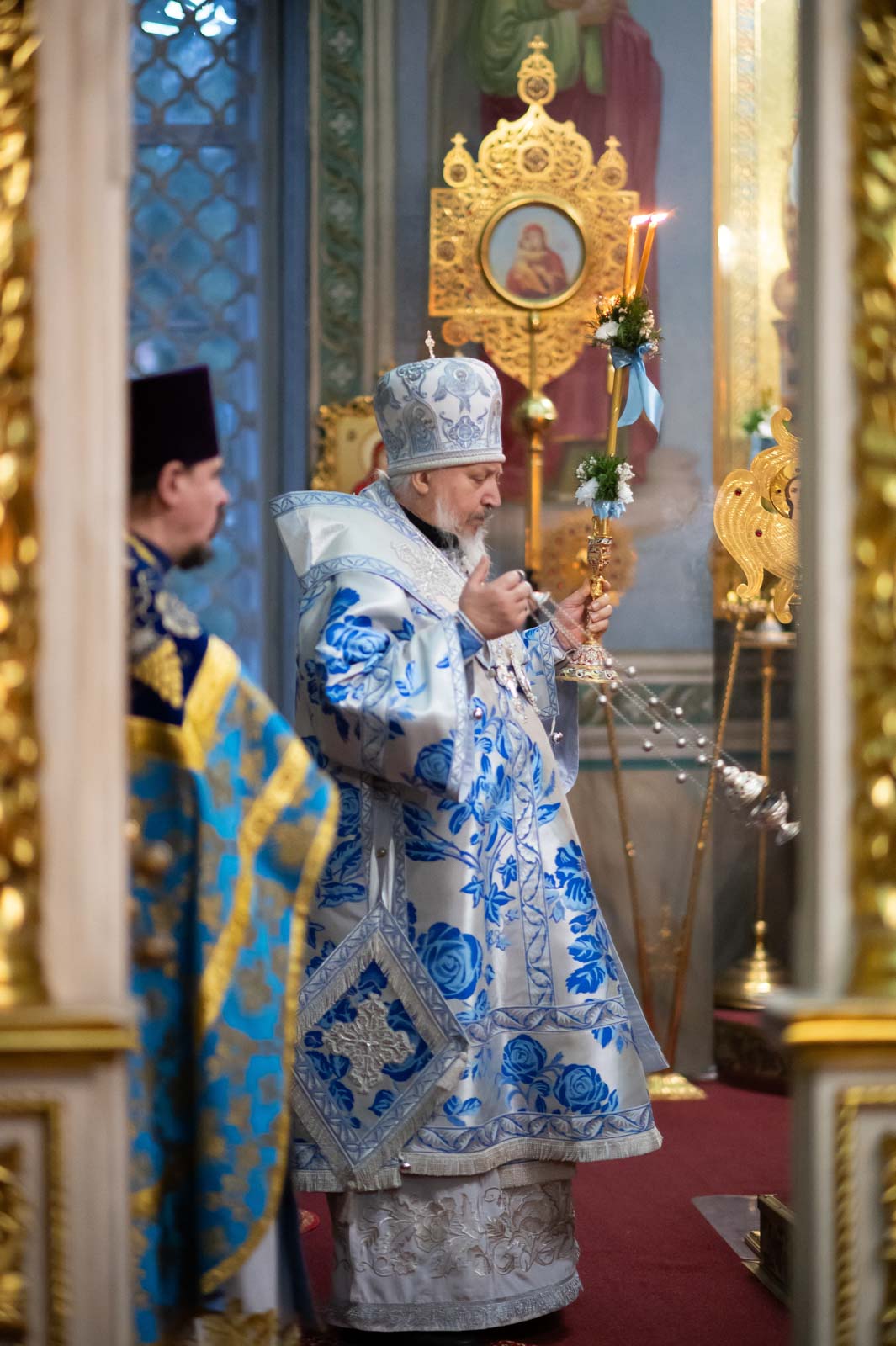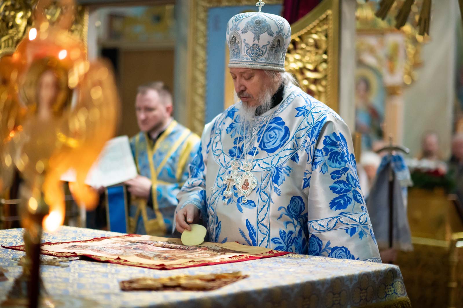По заамвонной молитве архипастырь и сослужащие ему священнослужители совершили славление Пресвятой Богородице.