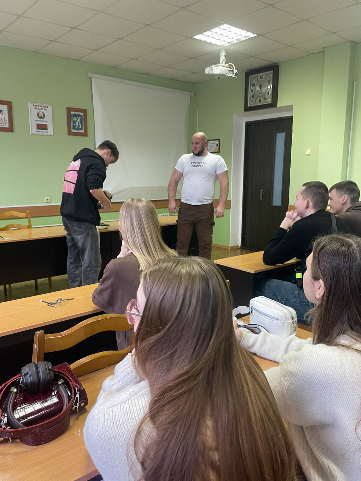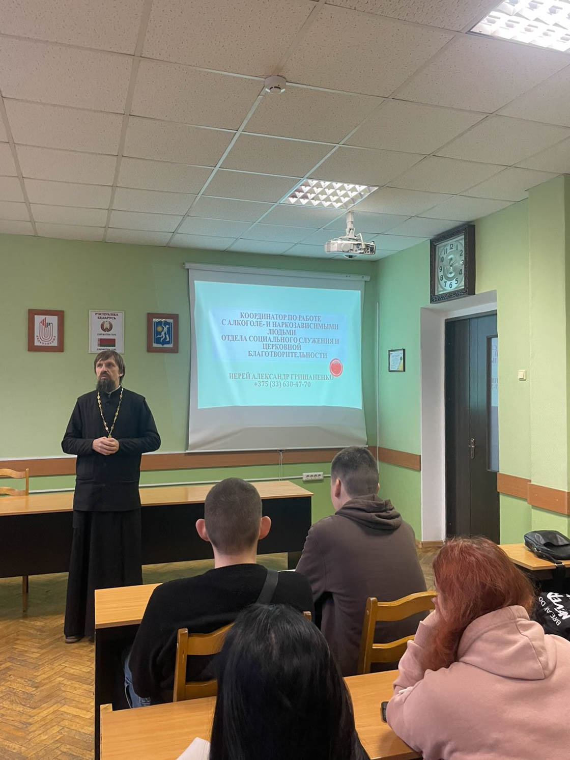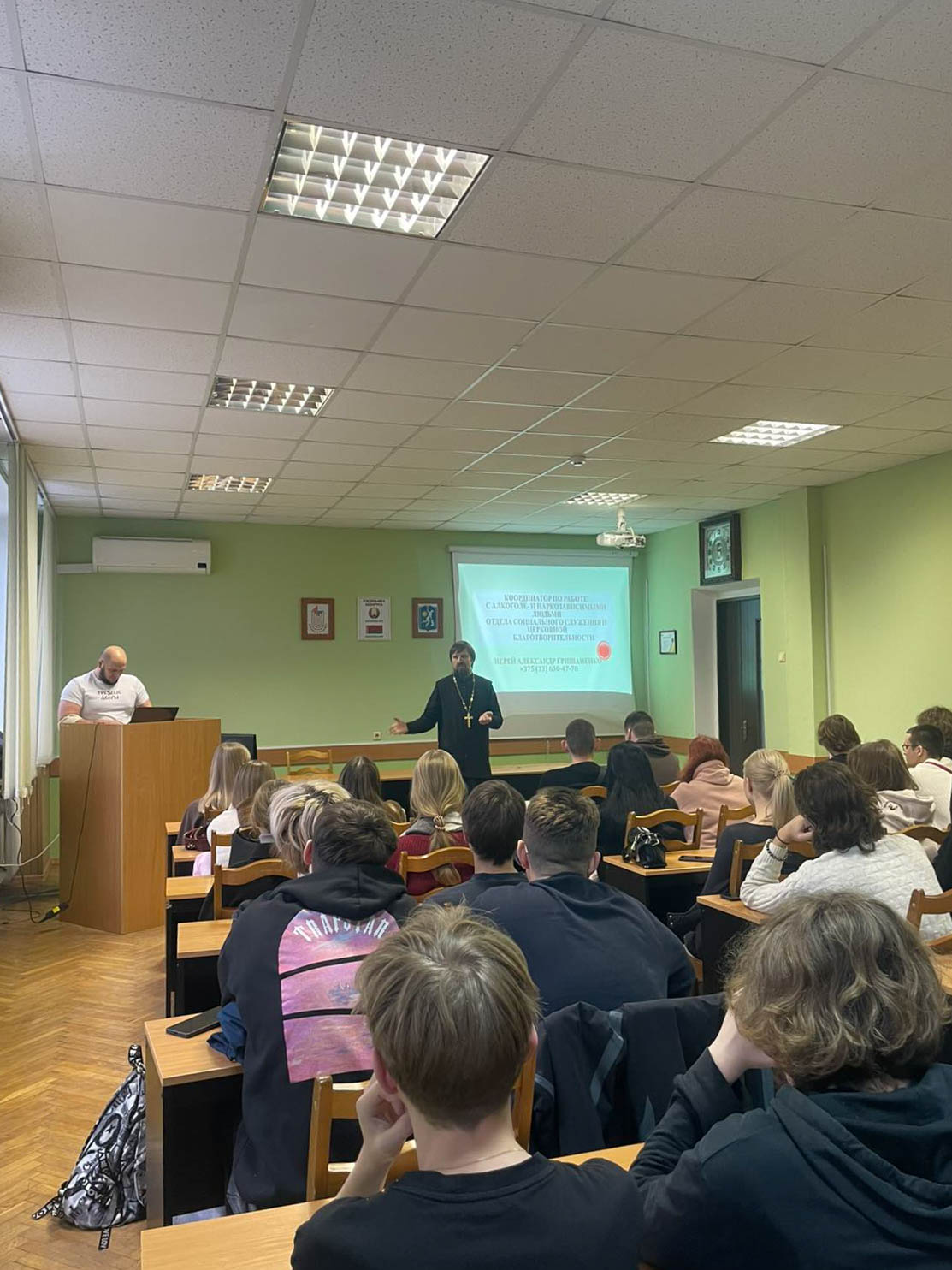Координатор по работе с алкоголе- и наркозависимыми людьми иерей Александр Гришаненко, клирик прихода храма святого великомученика и целителя Пантелеймона в г.Гомеле, совместно с участником епархиального социального проекта «Трезвые дворы» членом Белорусской федерации силового экстрима безэкипировочного пауэрлифтинга Александром Хвесюком побеседовали с учащимися на тему трезвения, нравственности и становления личности.