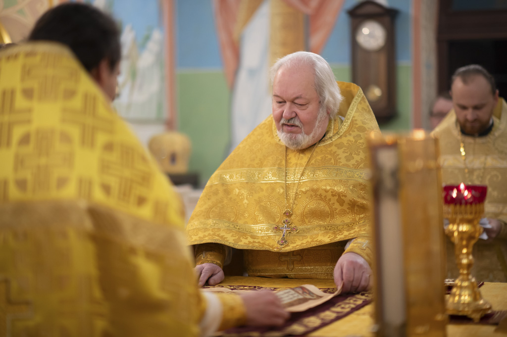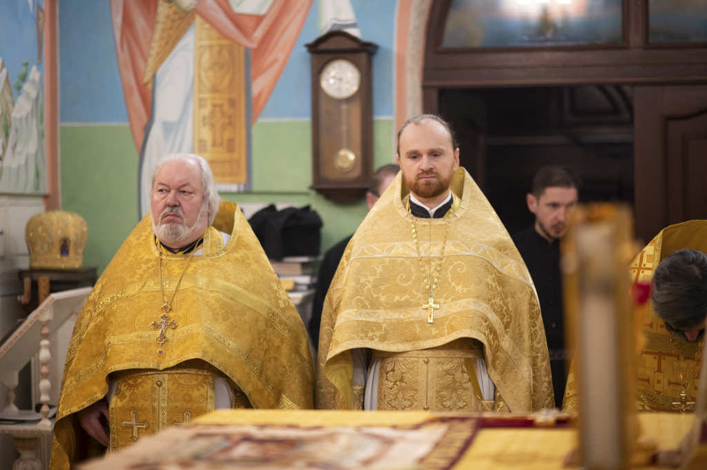 Его Высокопреподобию сослужили: благочинный монастырей Гомельской епархии и и.о. Наместника монастыря игумен Феодорит (Золотарев), председатель епархиального отдела архитектуры и строительства протоиерей Георгий Тур, председатель миссионерского отдела Гомельской епархии иерей Павел Перещук, настоятель храма святого праведного Иоанна Кормянского иерей Дмитрий Жданов, настоятели приходов города и братия монастыря в священном сане.